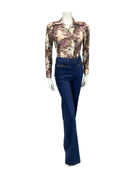 VTG 60S 70S PURPLE BEIGE MOD CLASSICAL ART PRINTED DAGGER COLLAR SHIRT 8 10 S