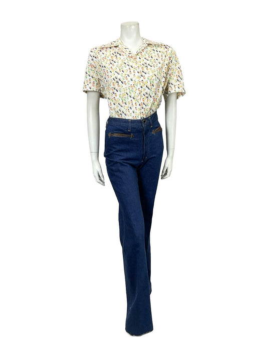 VTG 60S 70S WHITE ORANGE YELLOW GREEN GEOMETRIC FLORAL DAGGER SHIRT SIZE 24