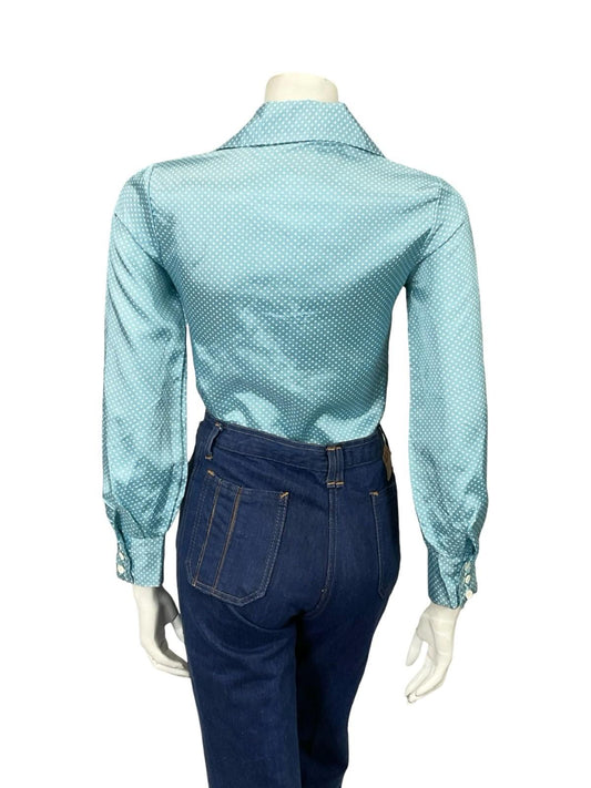 VTG 60S 70S JAPANESE MOD LIGHT BLUE WHITE POKA DOT GEOMETRIC DAGGER SHIRT 8