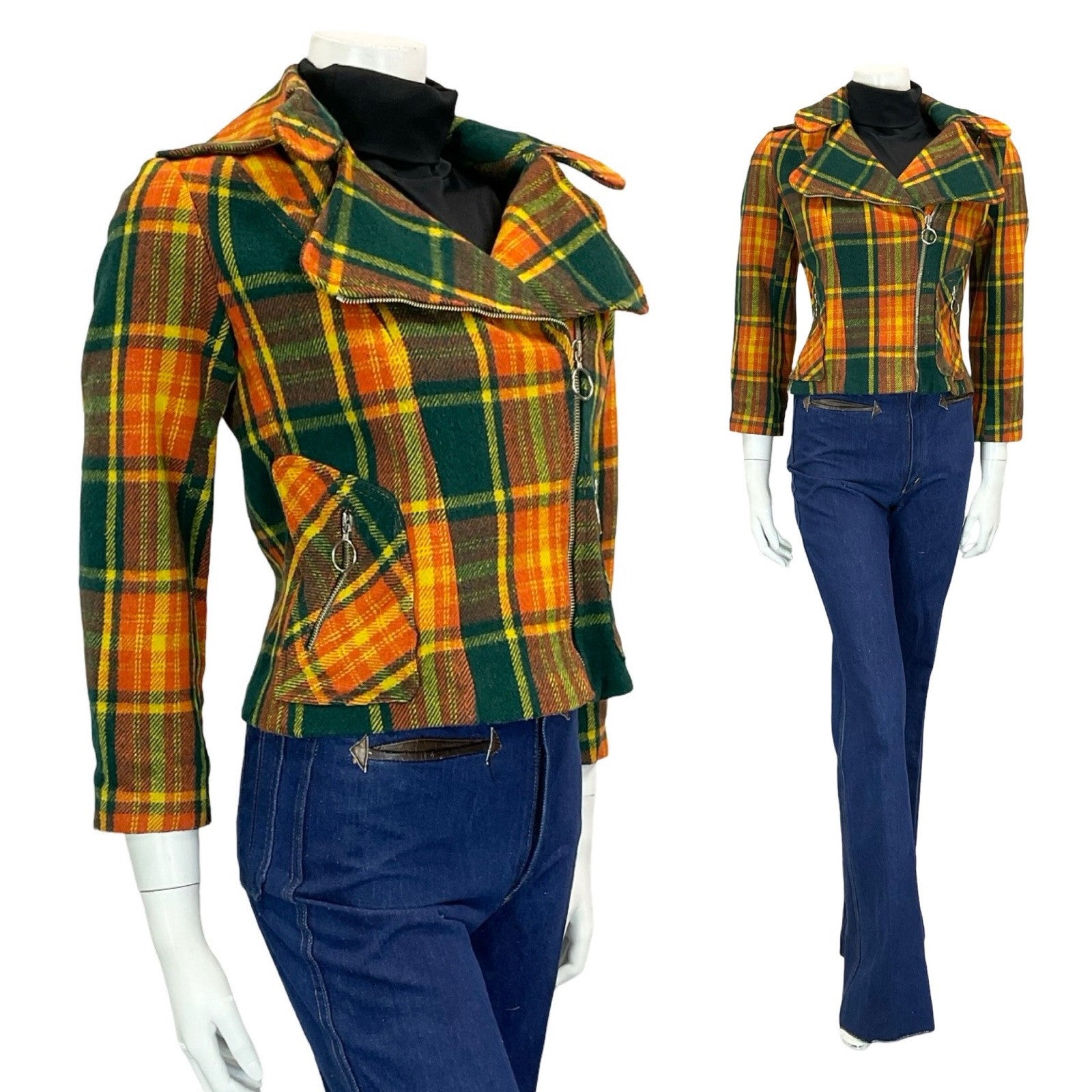 This is a gorgeous 60s 70s tartan cropped biker jacket in shades of green, orange and yellow. This jacket has an outer layer of soft wool fabric, with a silky forest green satin polyester inner lining. This jacket has silver O ring zippers on the front and pockets. This jacket is perfect for anyone looking for a punk or biker style vintage piece, and we think this would look amazing paired with one of our mini skirts and a vintage bag to enhance that vintage look. Why not shop the rest of our range and build your outfit?