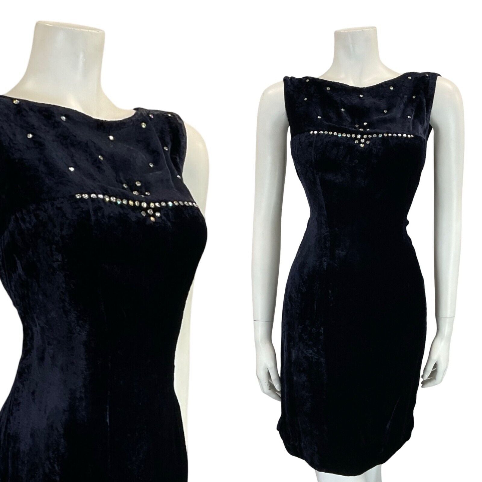 *needs close upVTG 60S NAVY BLUE HANDMADE VELVET DIAMANTE BOAT NECK MINI DRESS 8