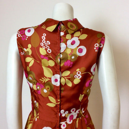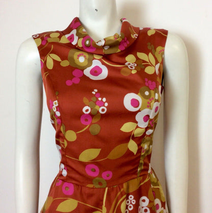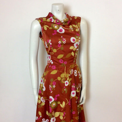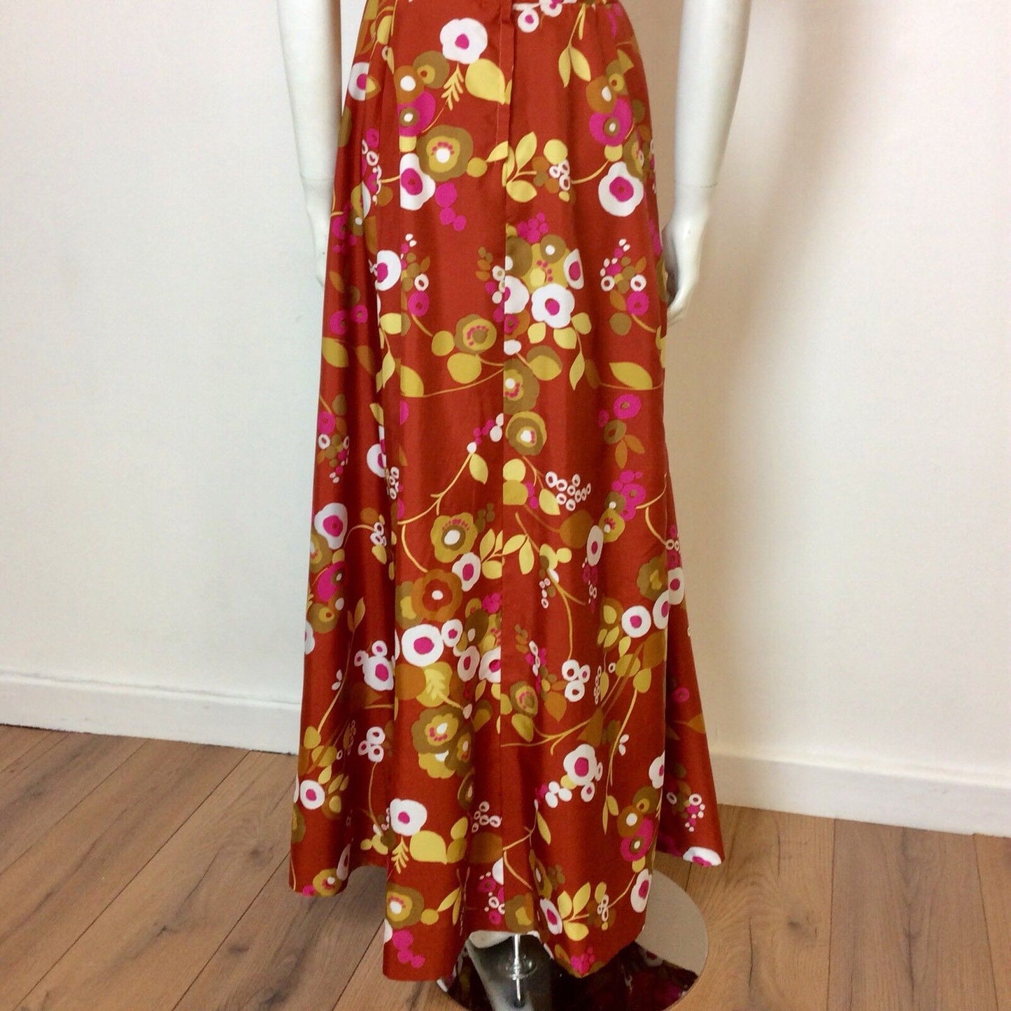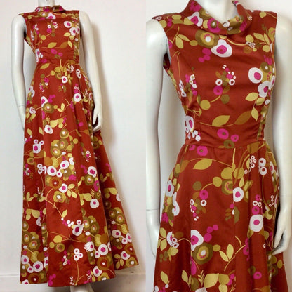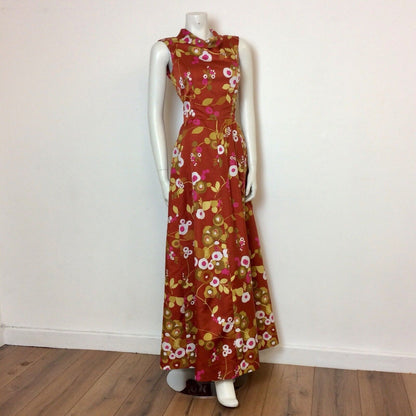 Vintage 1970s maxi dress in a rich rust colour sateen fabric printed with abstract flowers in mustard, tan, pink and white. It is sleeveless and has a cowl neck. Zips up the back to fasten.