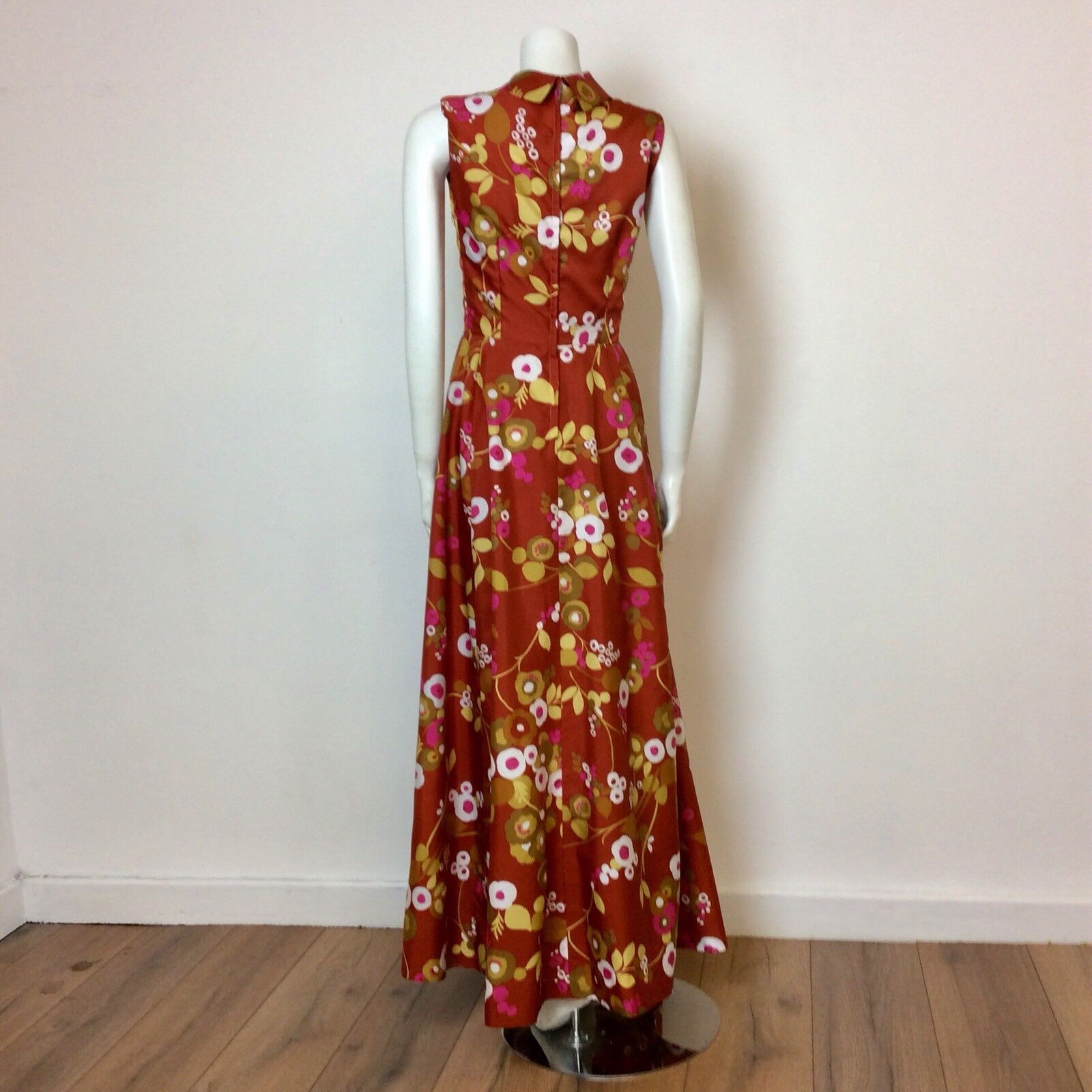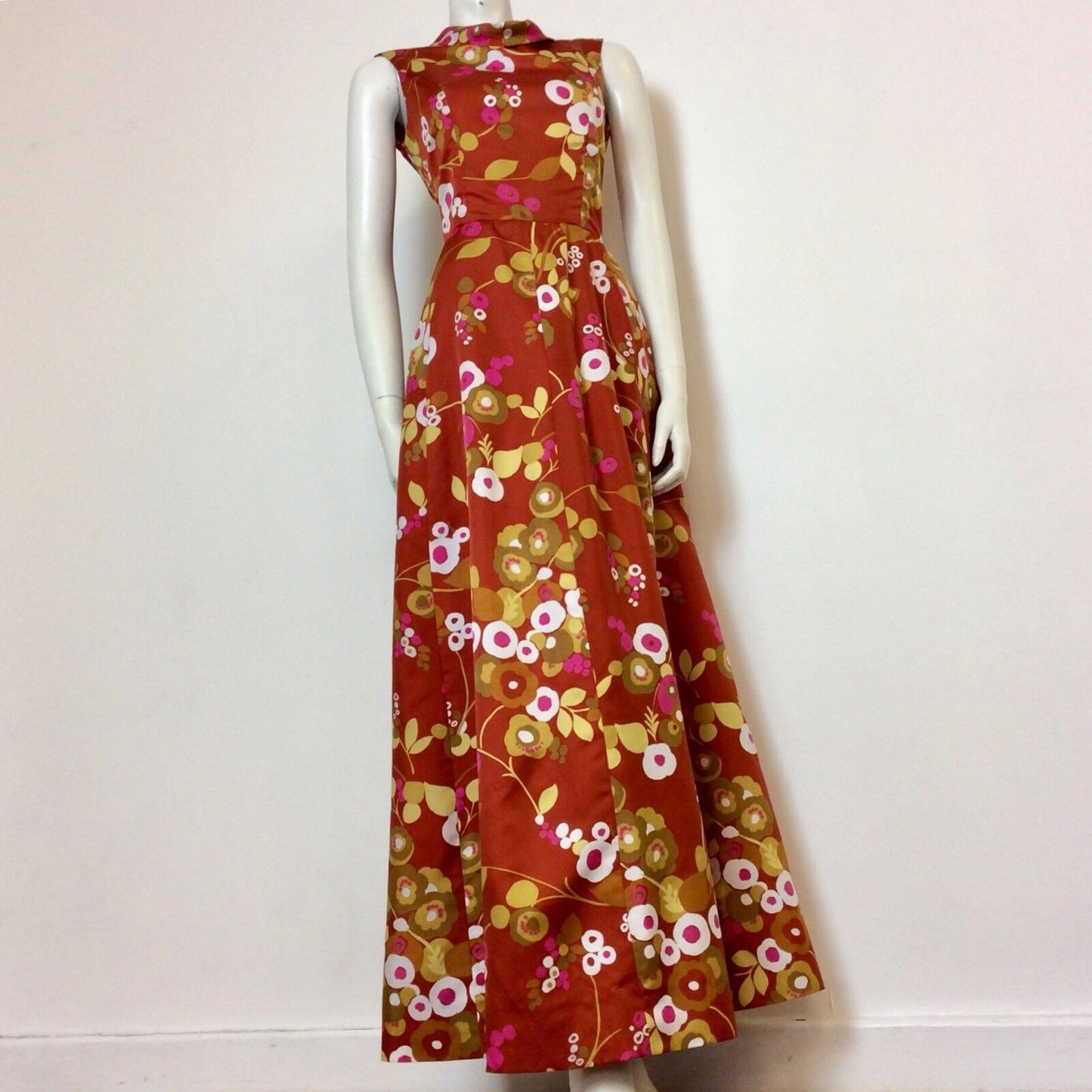 VINTAGE 1970S RUST SATEEN ABSTRACT FLORAL PRINT MAXI DRESS 10 12