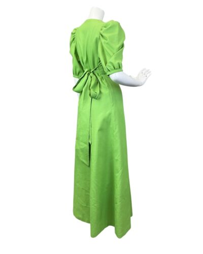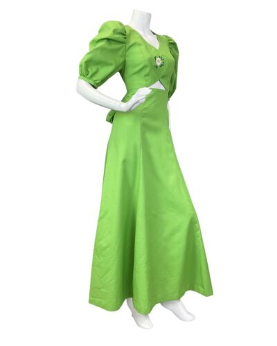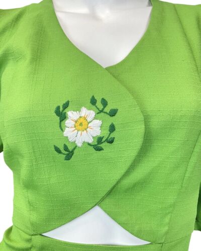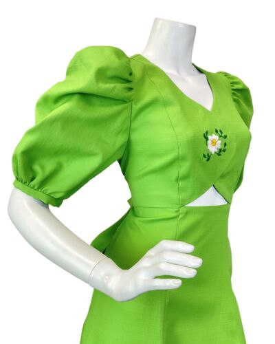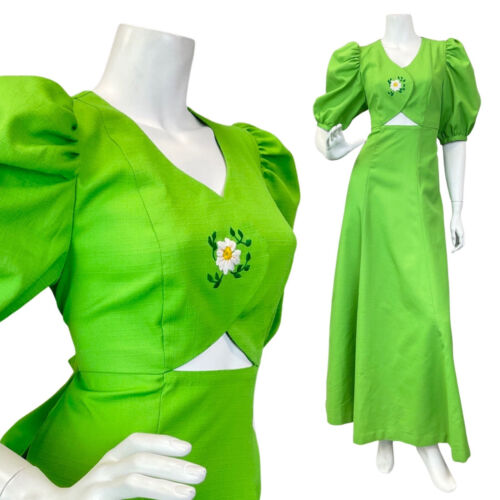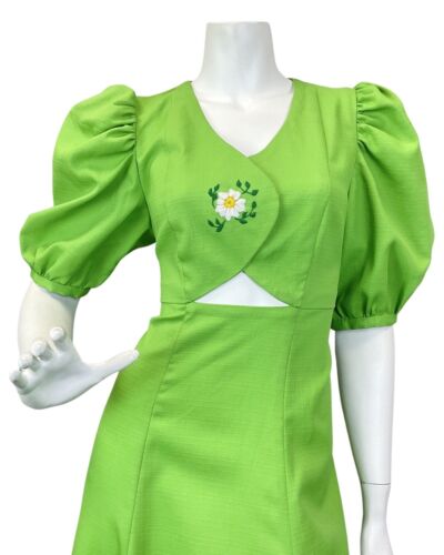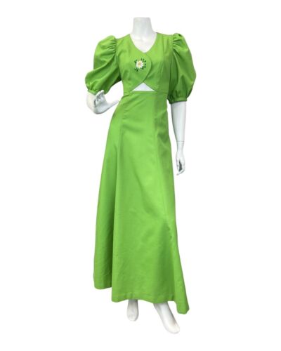VINTAGE 60s 70s APPLE GREEN DAISY FLOWER EMBROIDERED PRAIRIE MAXI DRESS 8 10