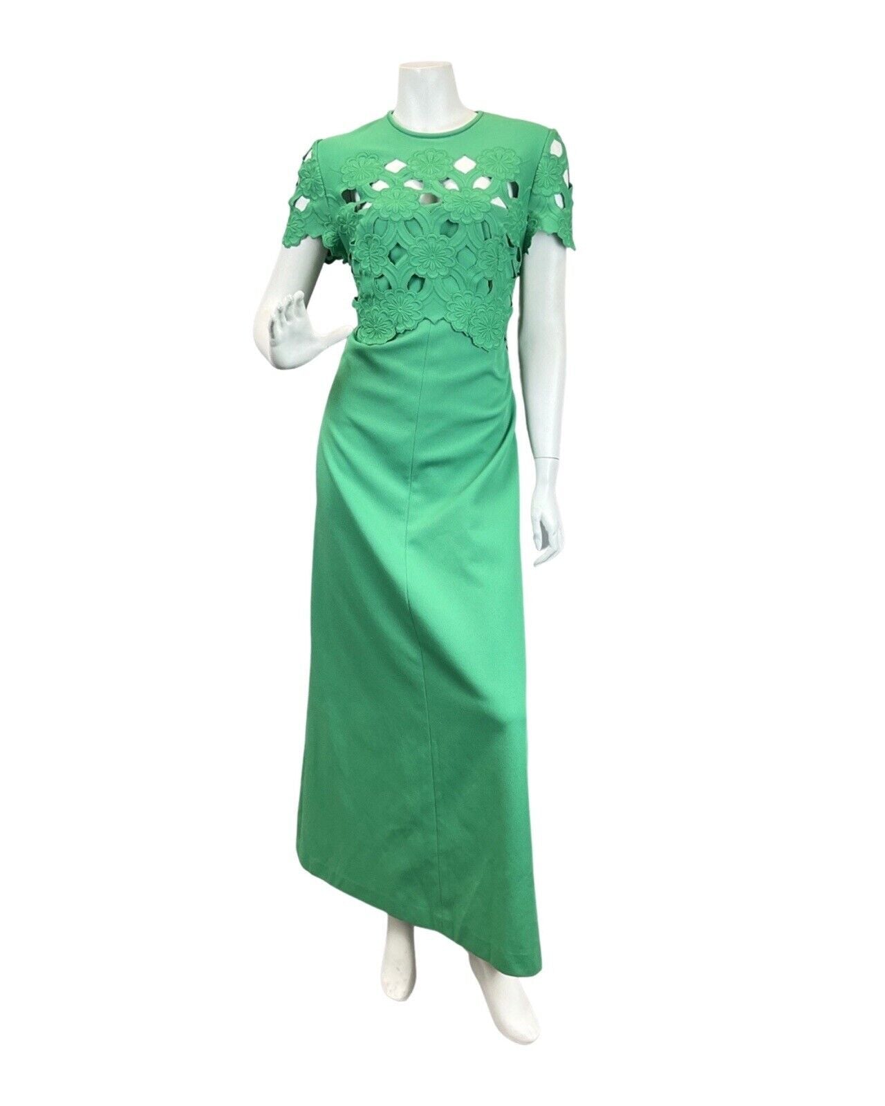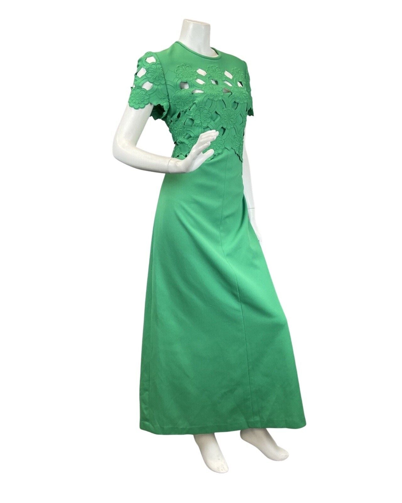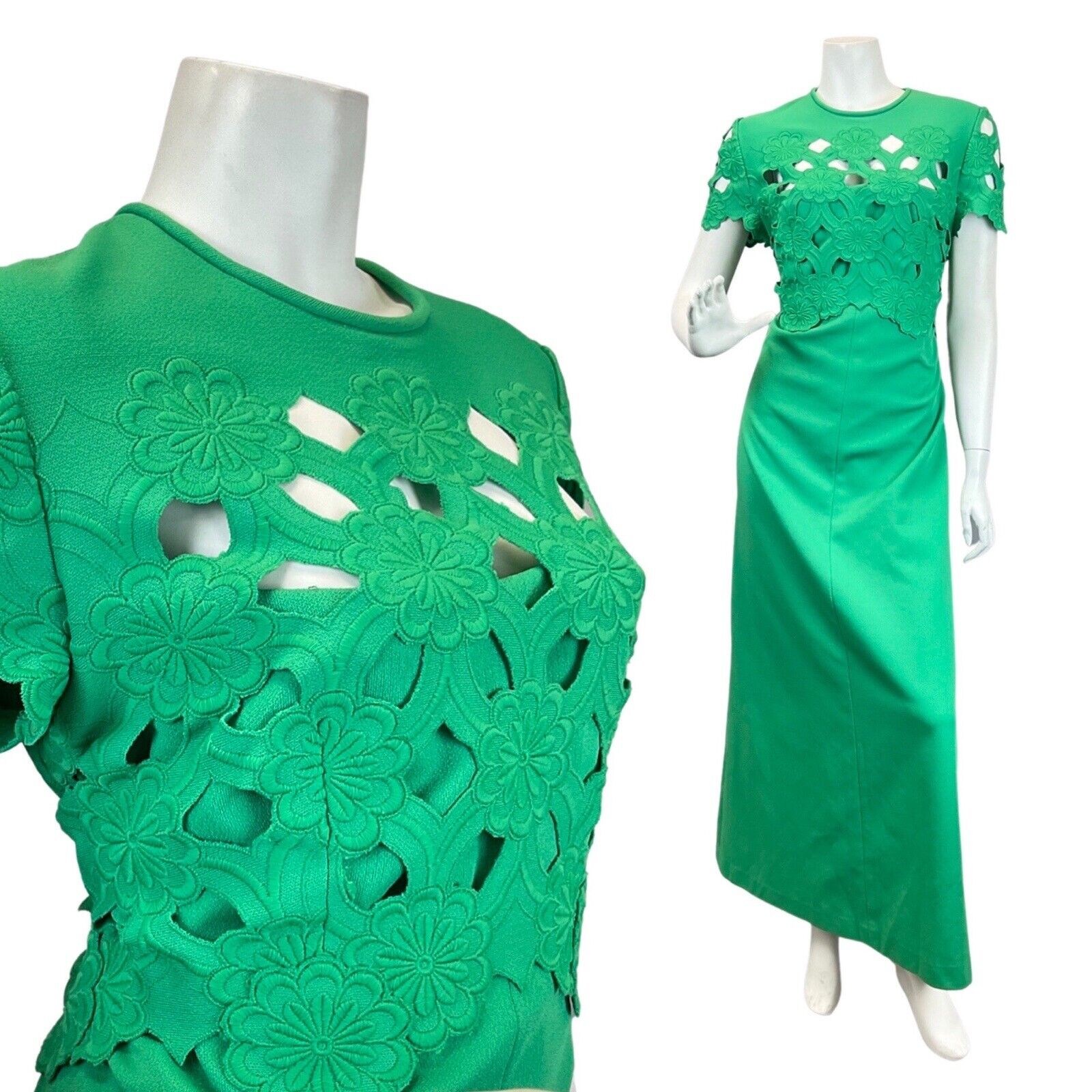 VINTAGE 60s 70s APPLE GREEN FLORAL EMBROIDERED CUT-OUT MOD MAXI DRESS 14