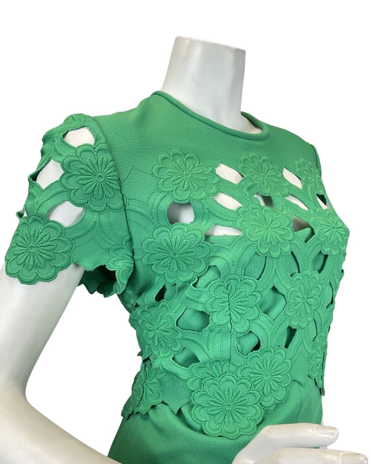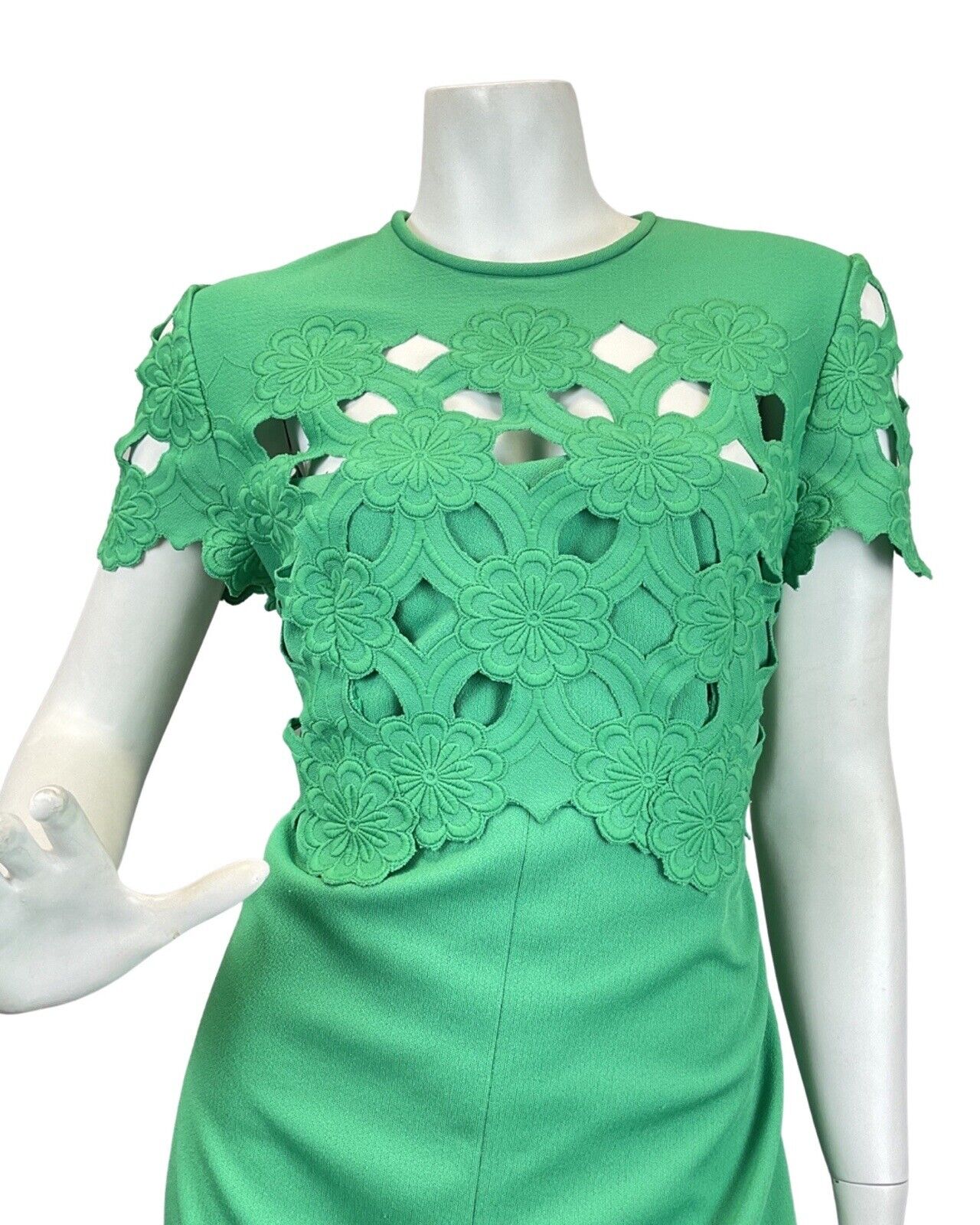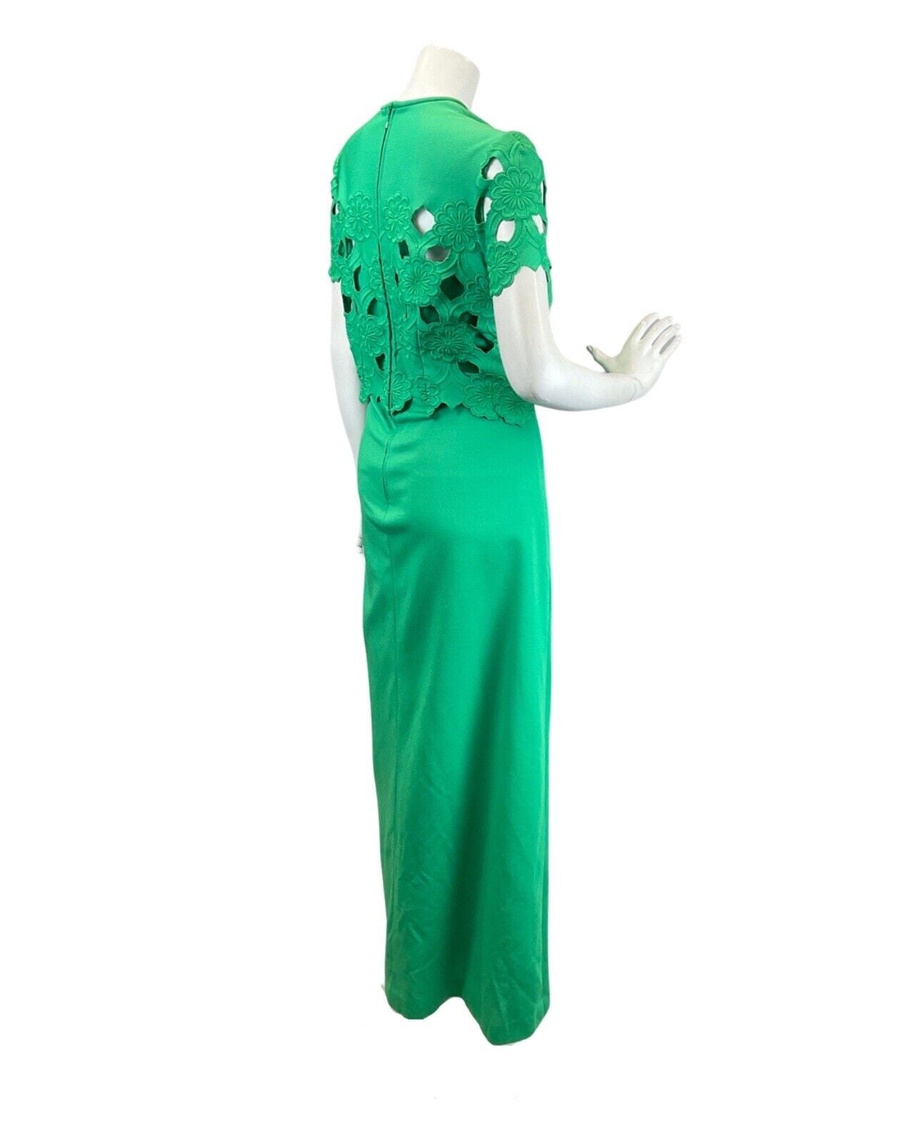 VINTAGE 60s 70s APPLE GREEN FLORAL EMBROIDERED CUT-OUT MOD MAXI DRESS 14