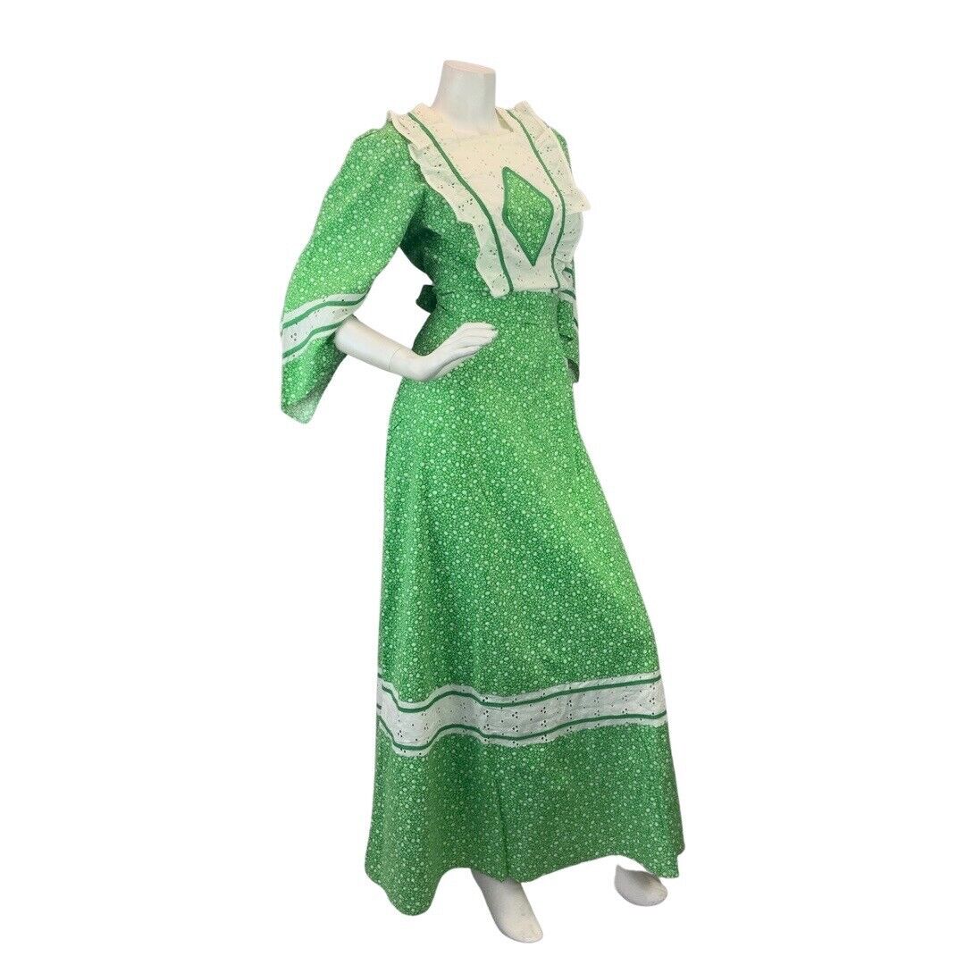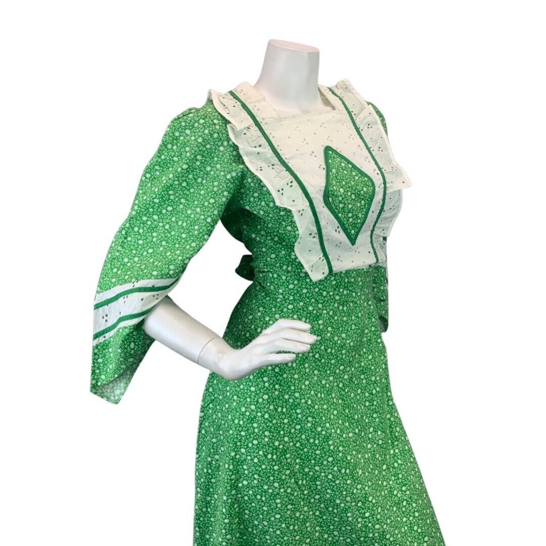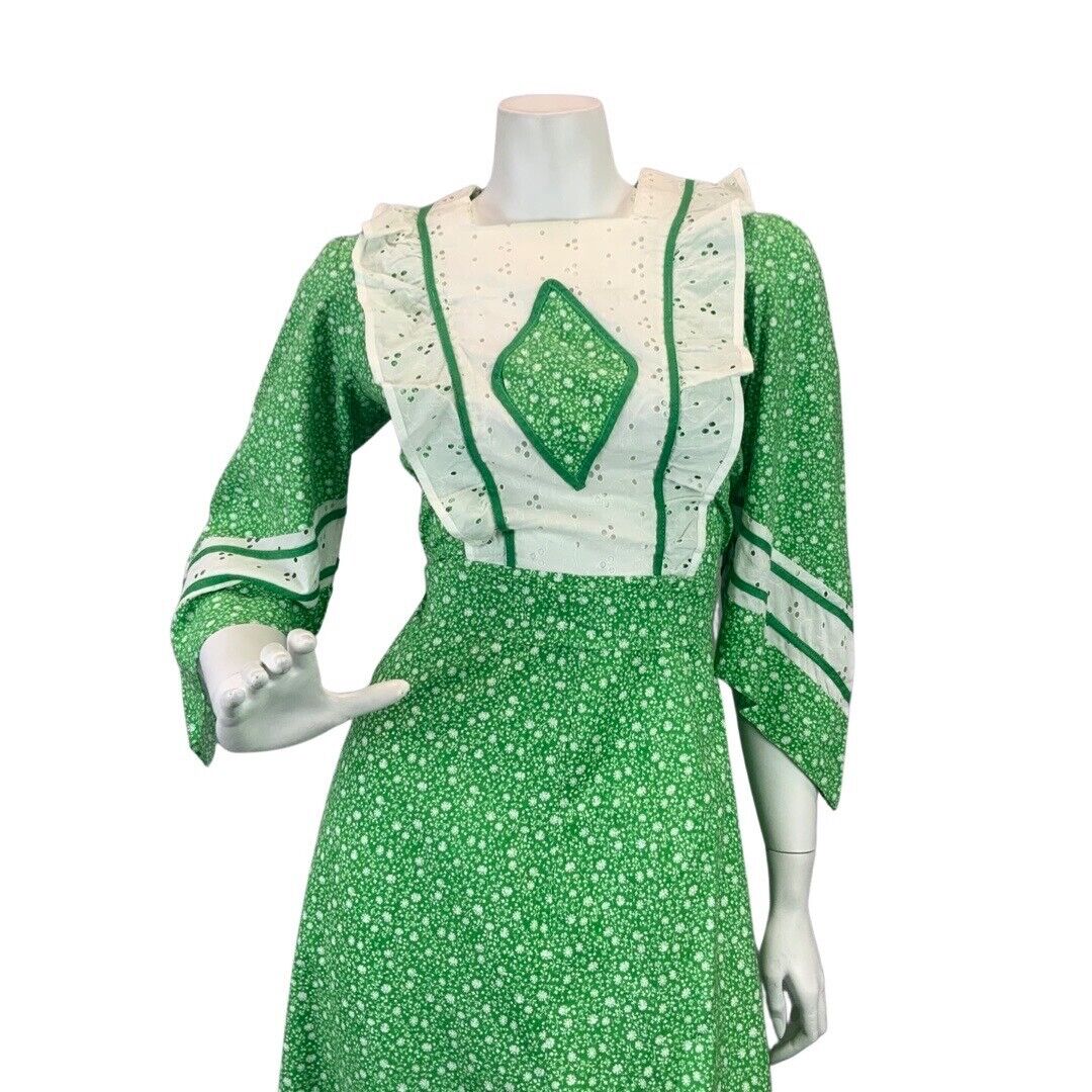 VINTAGE 60s 70s APPLE GREEN WHITE FLORAL DITSY LACE BOHO PRAIRIE MAXI DRESS 8 10