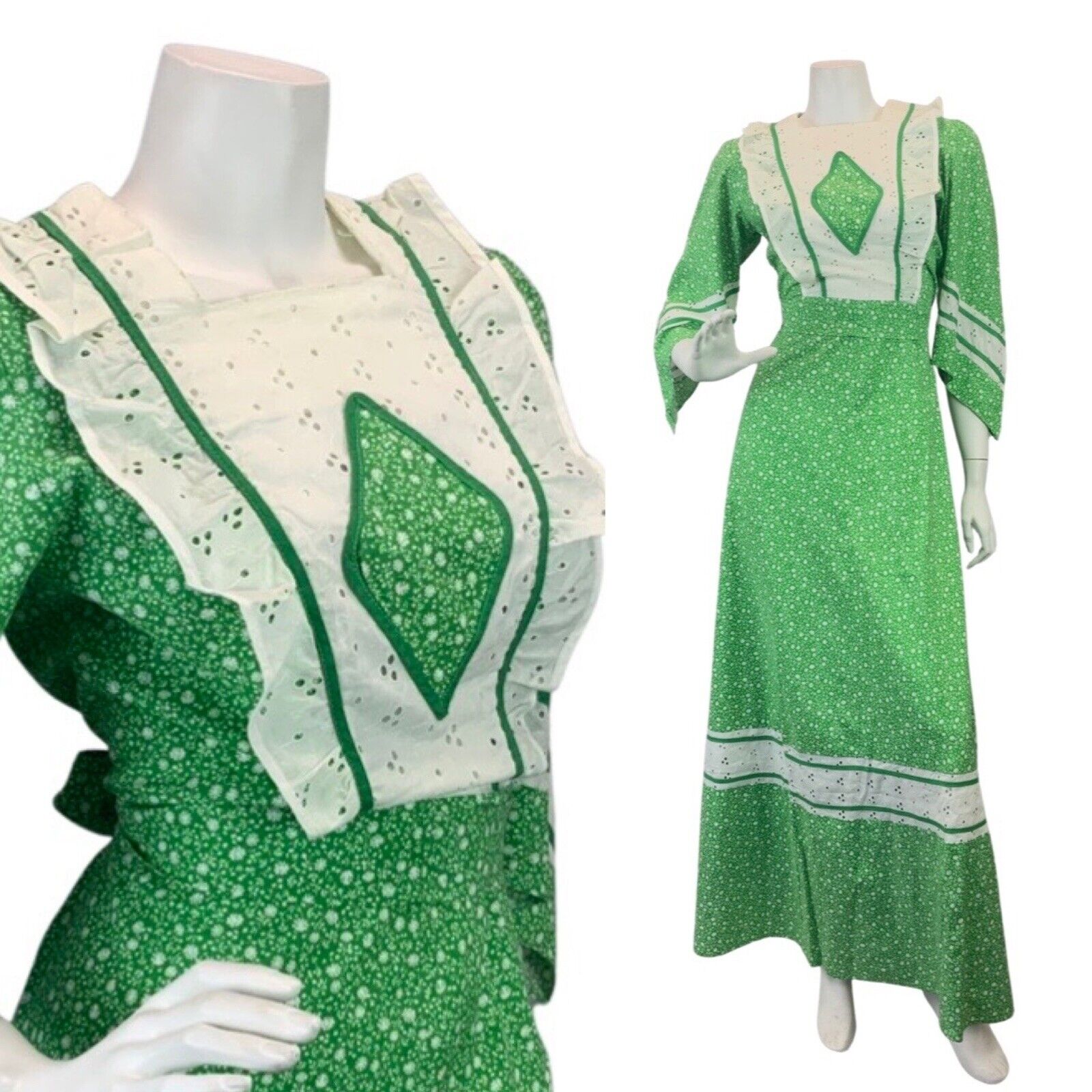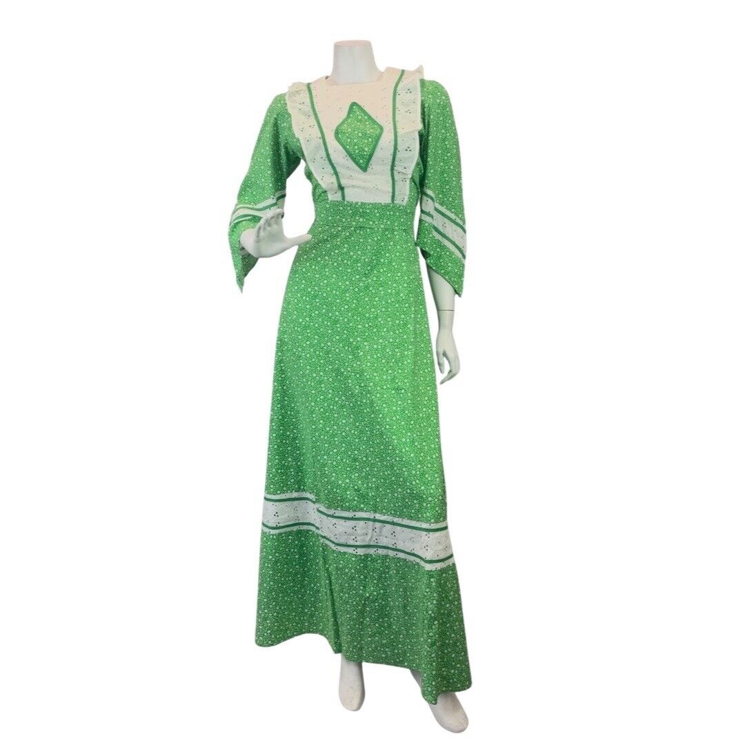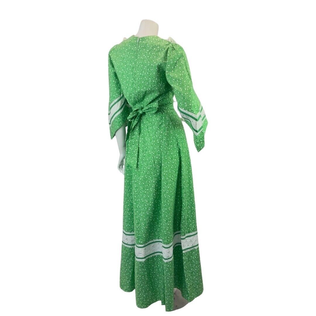 VINTAGE 60s 70s APPLE GREEN WHITE FLORAL DITSY LACE BOHO PRAIRIE MAXI DRESS 8 10