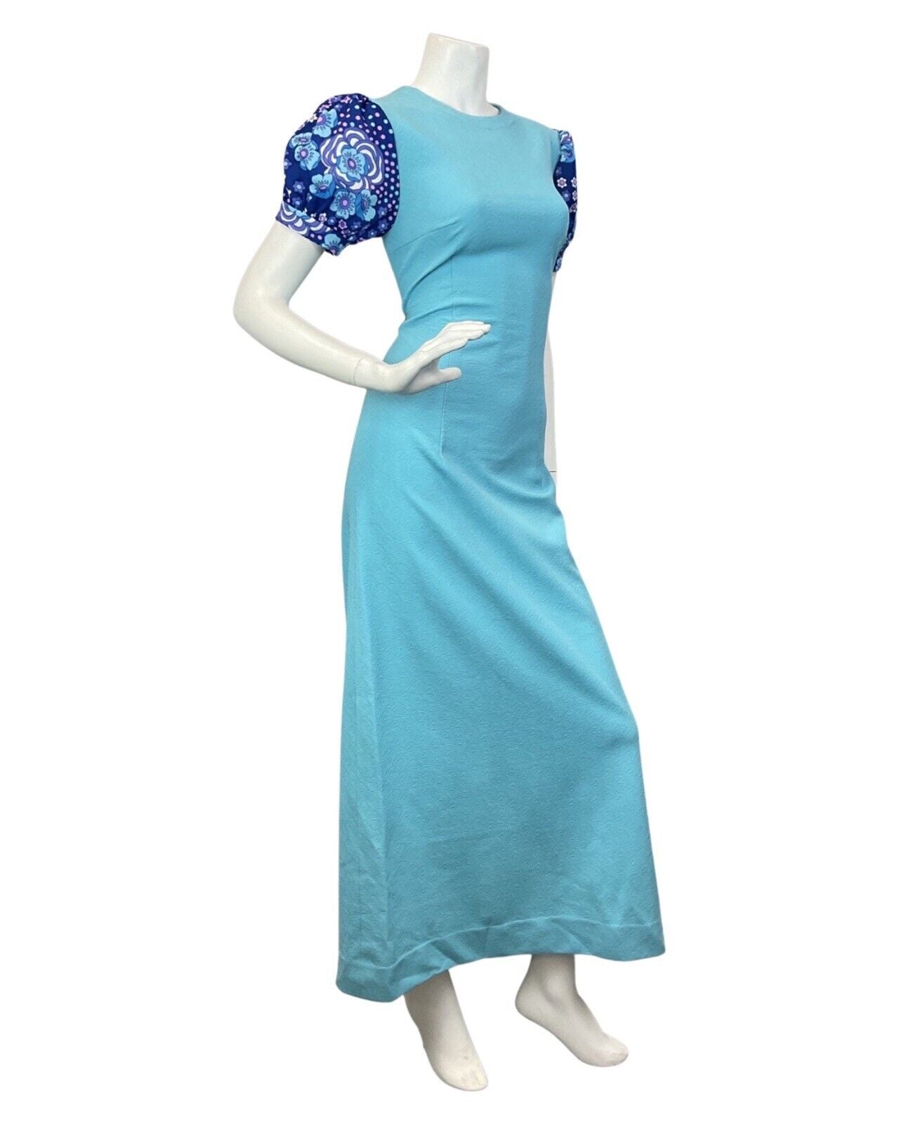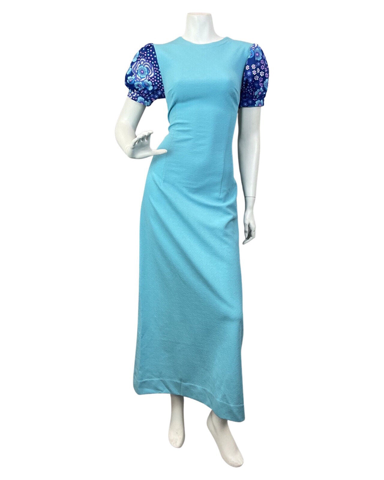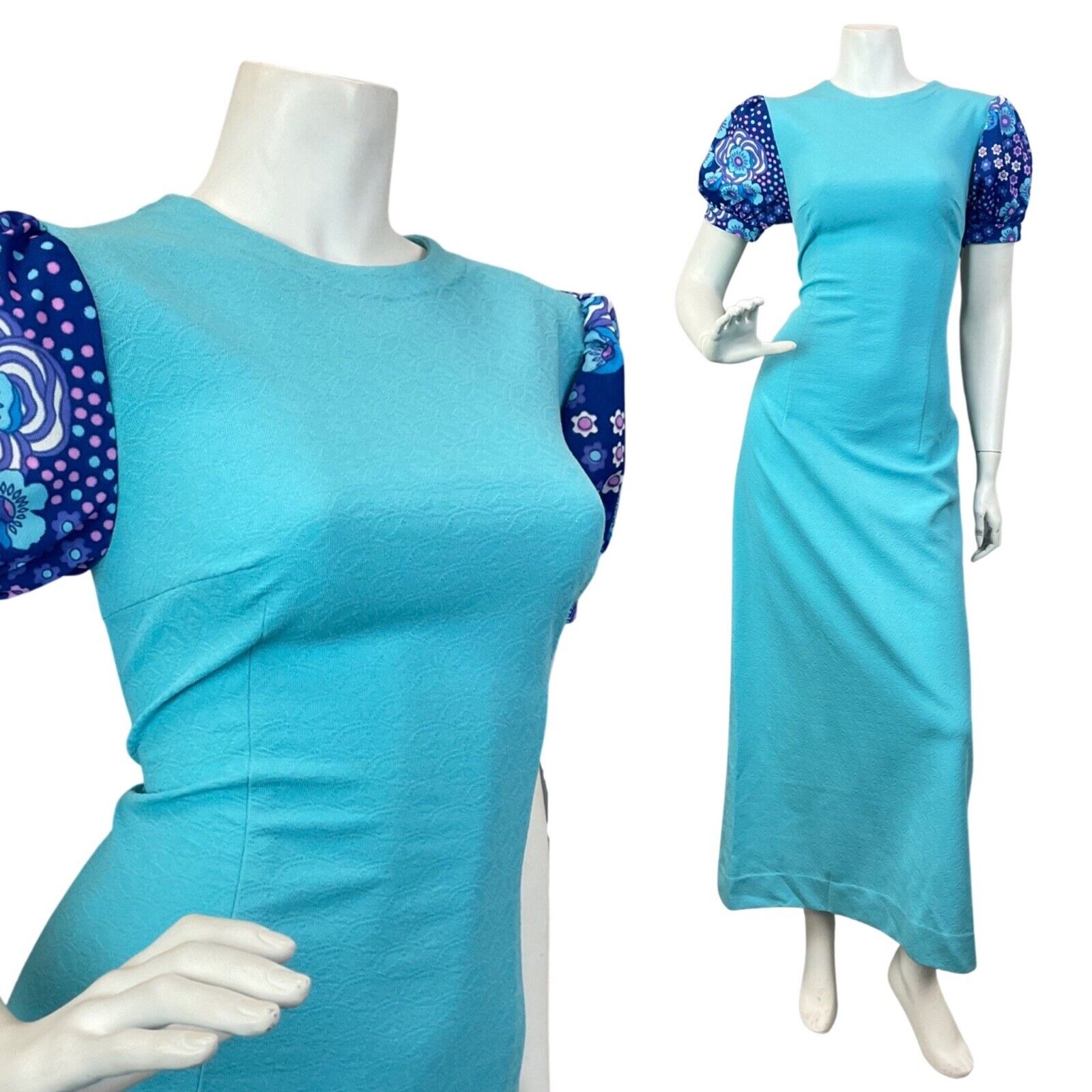 VINTAGE 60s 70s BABY BLUE NAVY PURPLE DAISY FLOWER PUFF SLEEVE MAXI DRESS 6 8