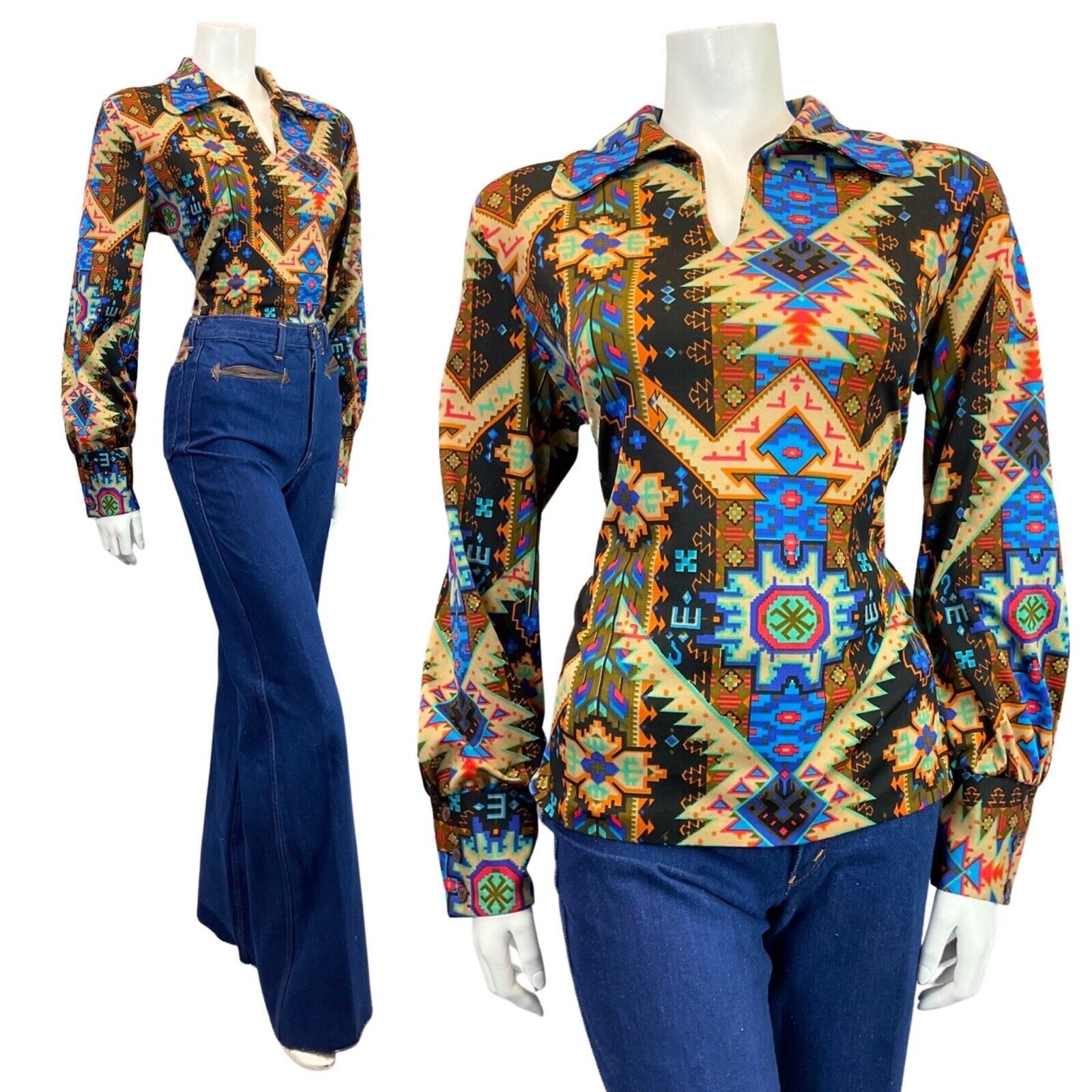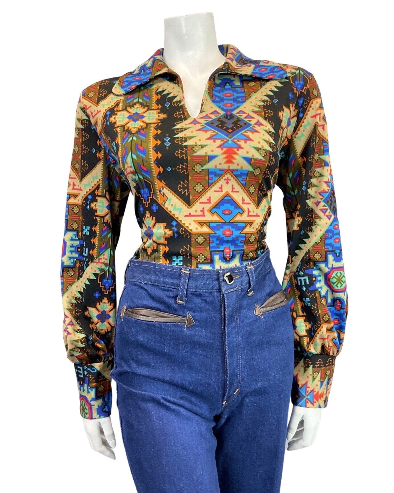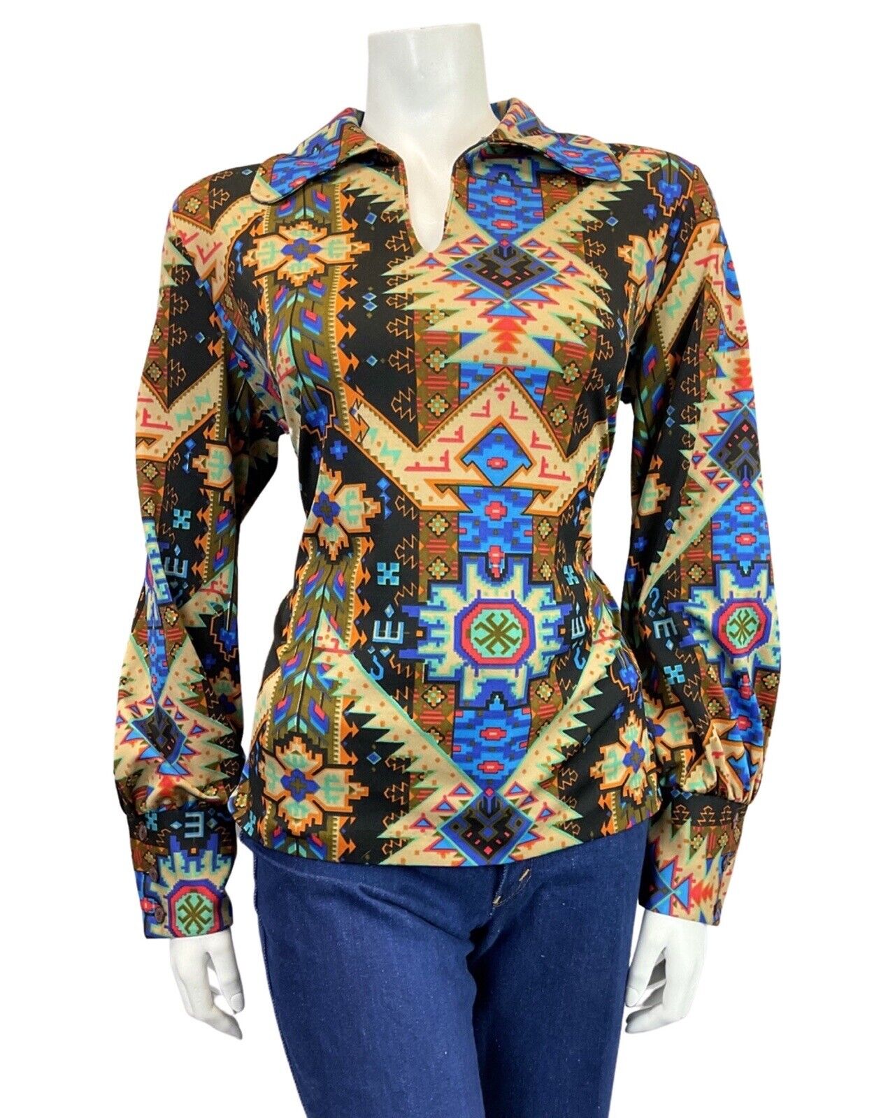 VINTAGE 60s 70s BEIGE BLACK BLUE RED AZTEC GEOMETRIC MOD BLOUSE 14 16