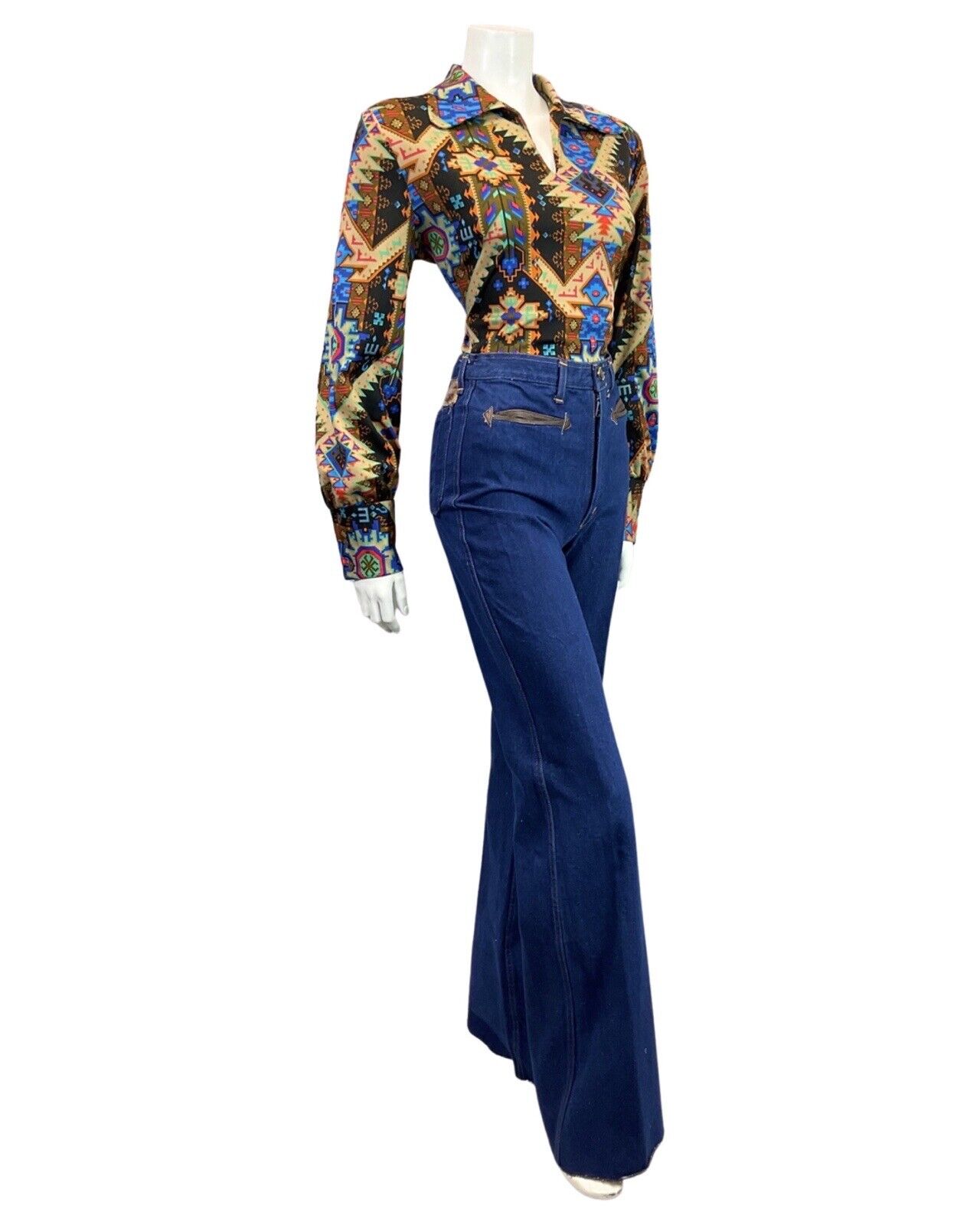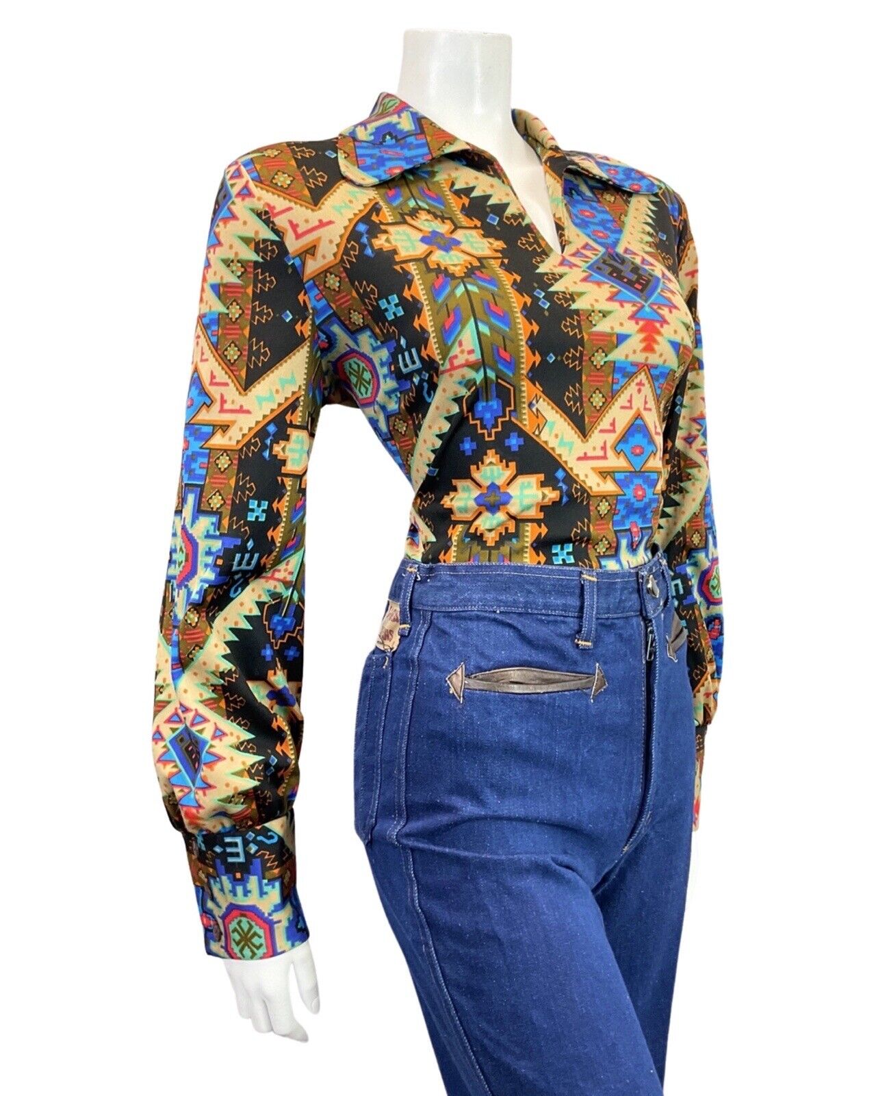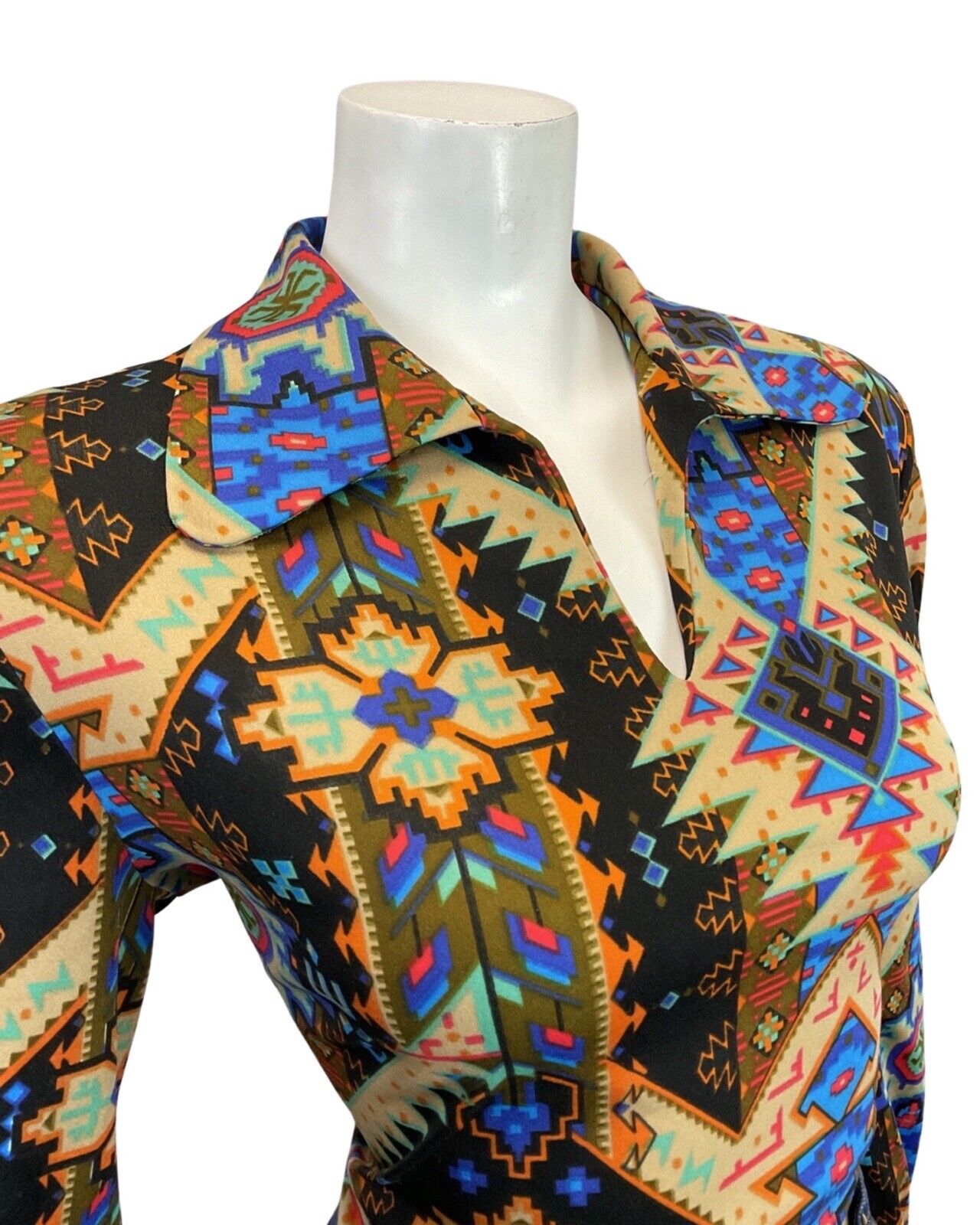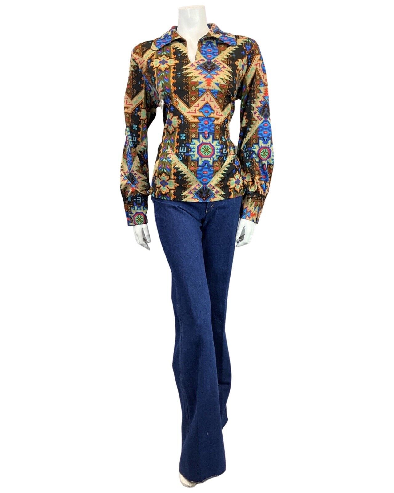 VINTAGE 60s 70s BEIGE BLACK BLUE RED AZTEC GEOMETRIC MOD BLOUSE 14 16