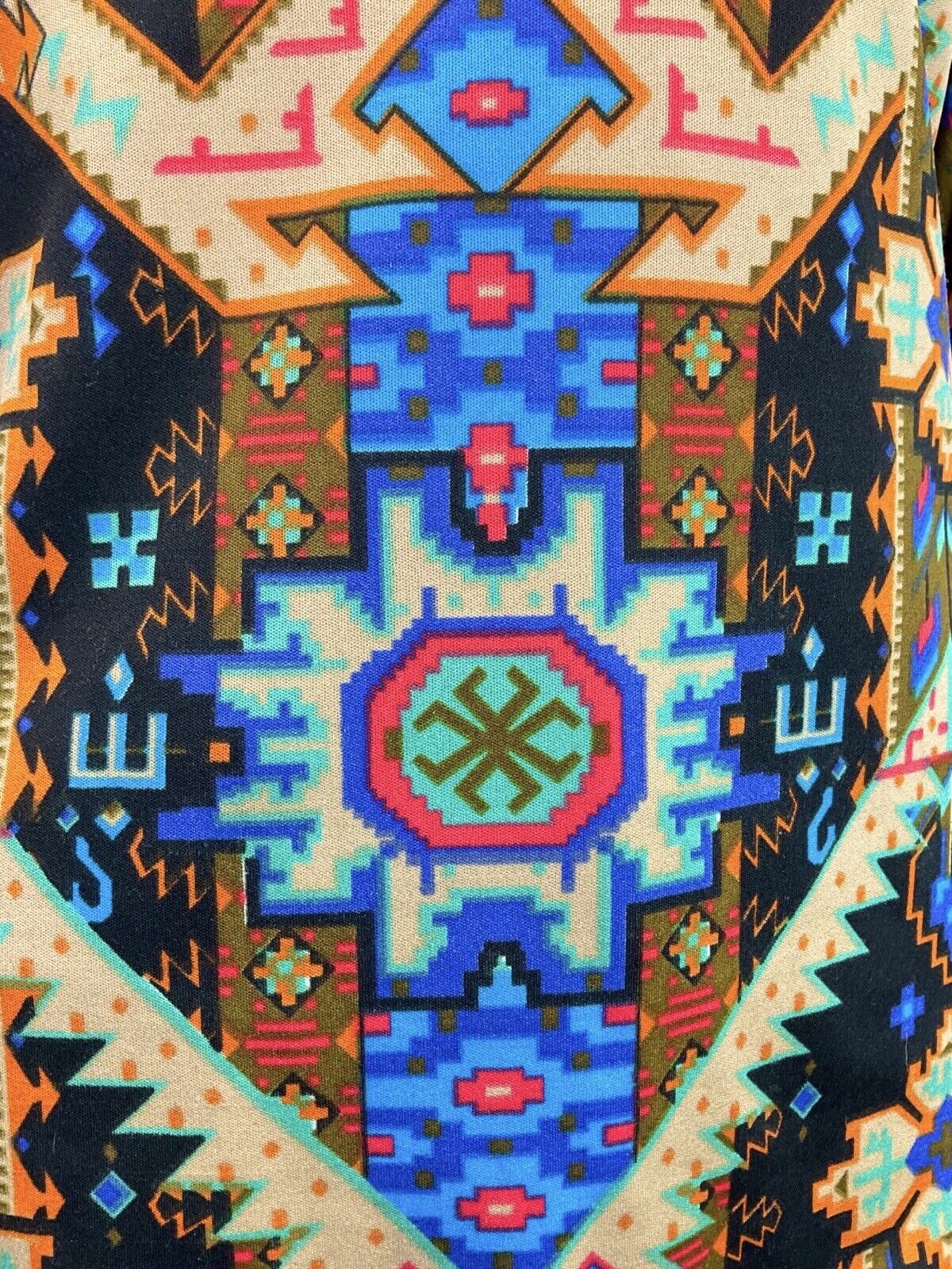 Covering the top is a bold aztec-inspired geometric pattern in bright colours of blue, beige, red, brown, and orange.
