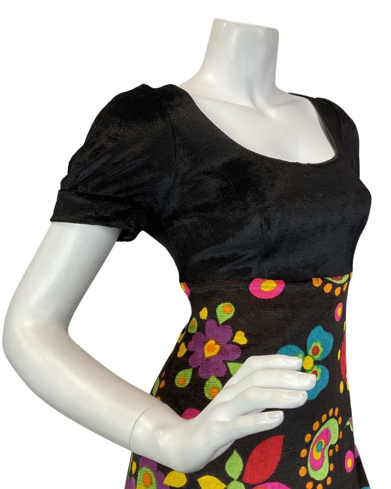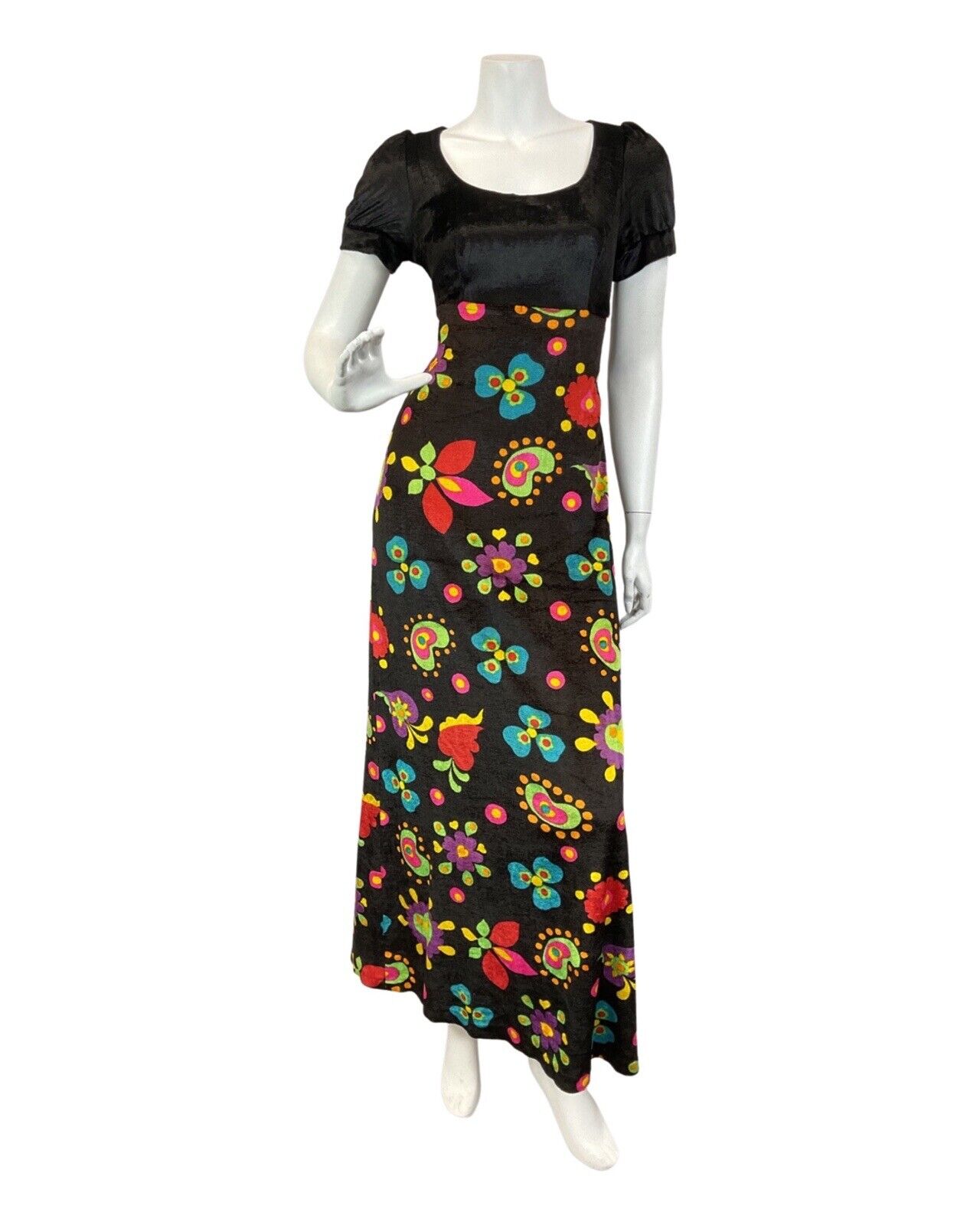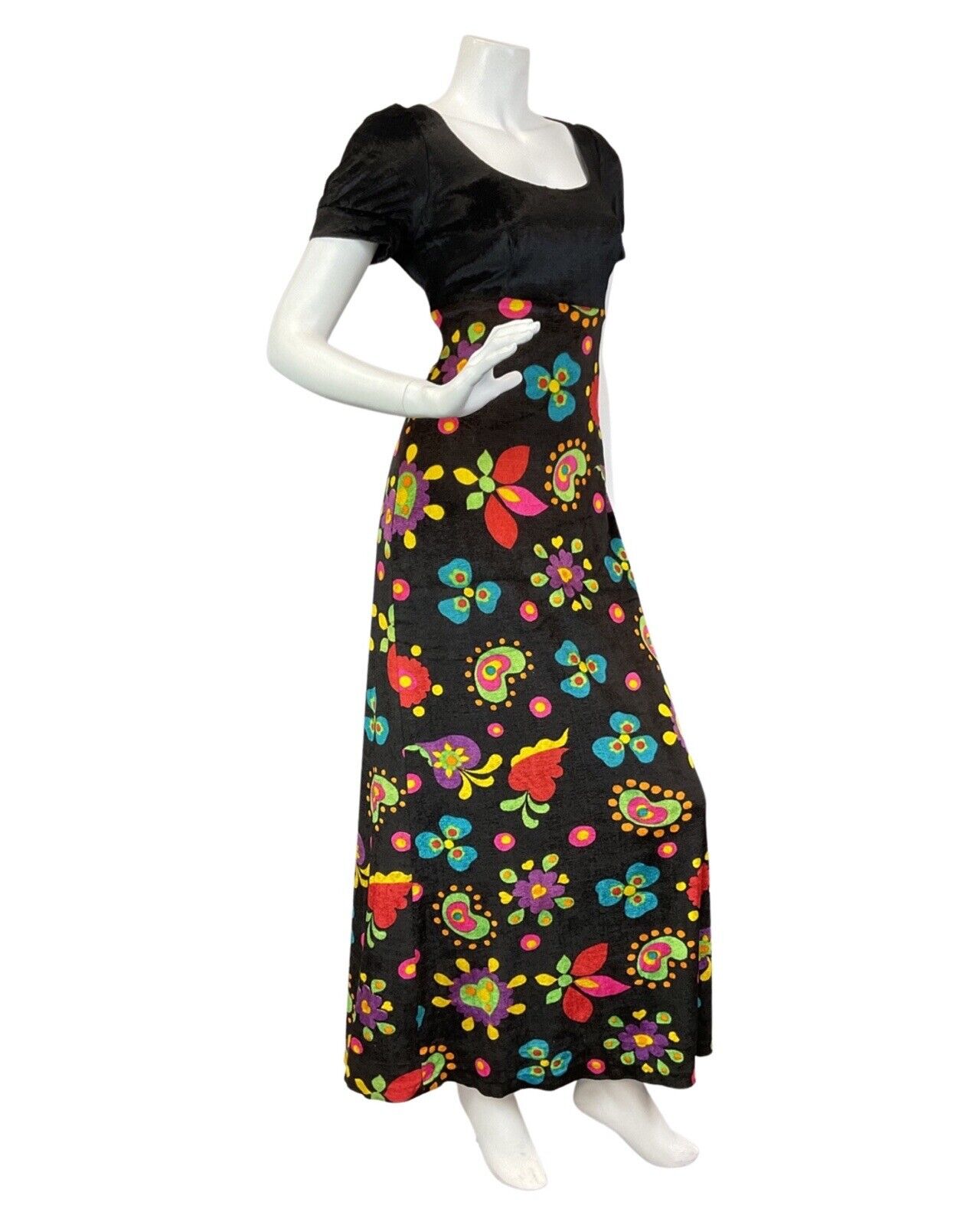 VINTAGE 60s 70s BLACK BLUE PINK FLOWER POWER MOD EMPIRE VELVET MAXI DRESS 10 12