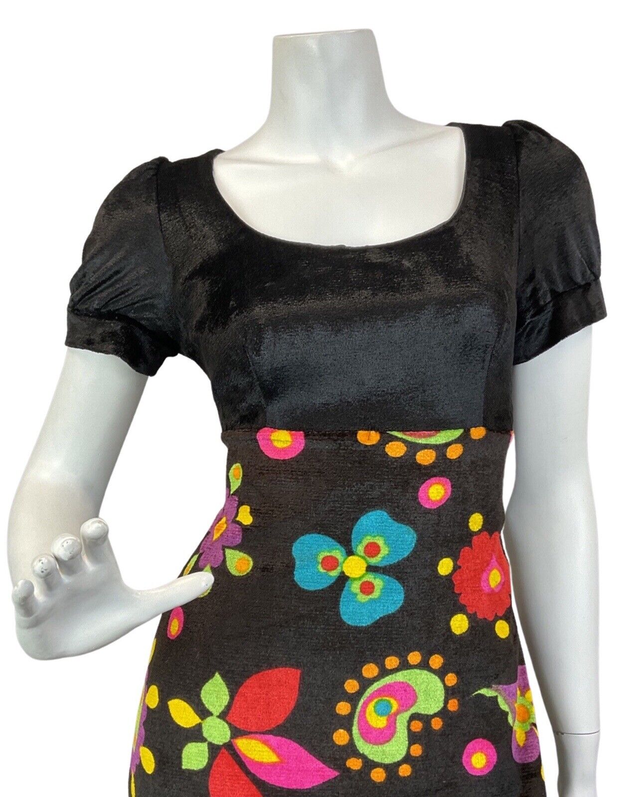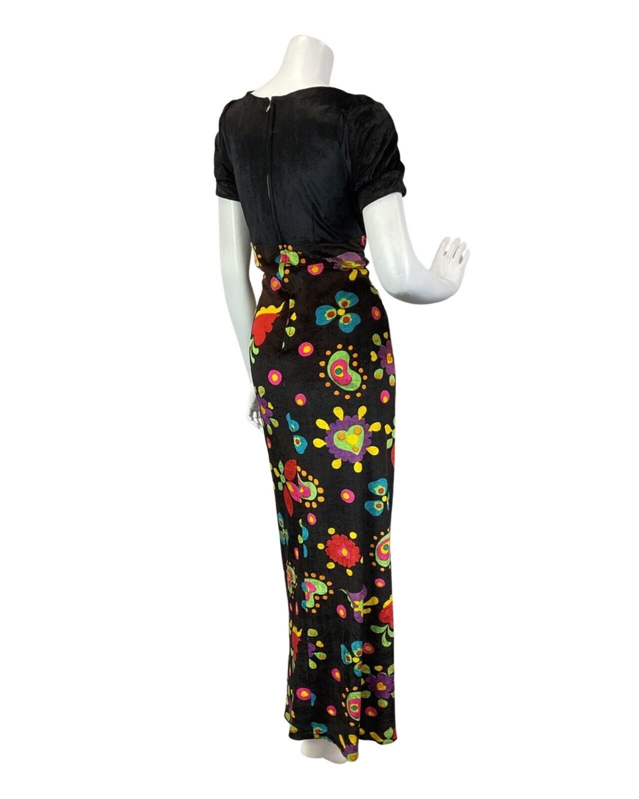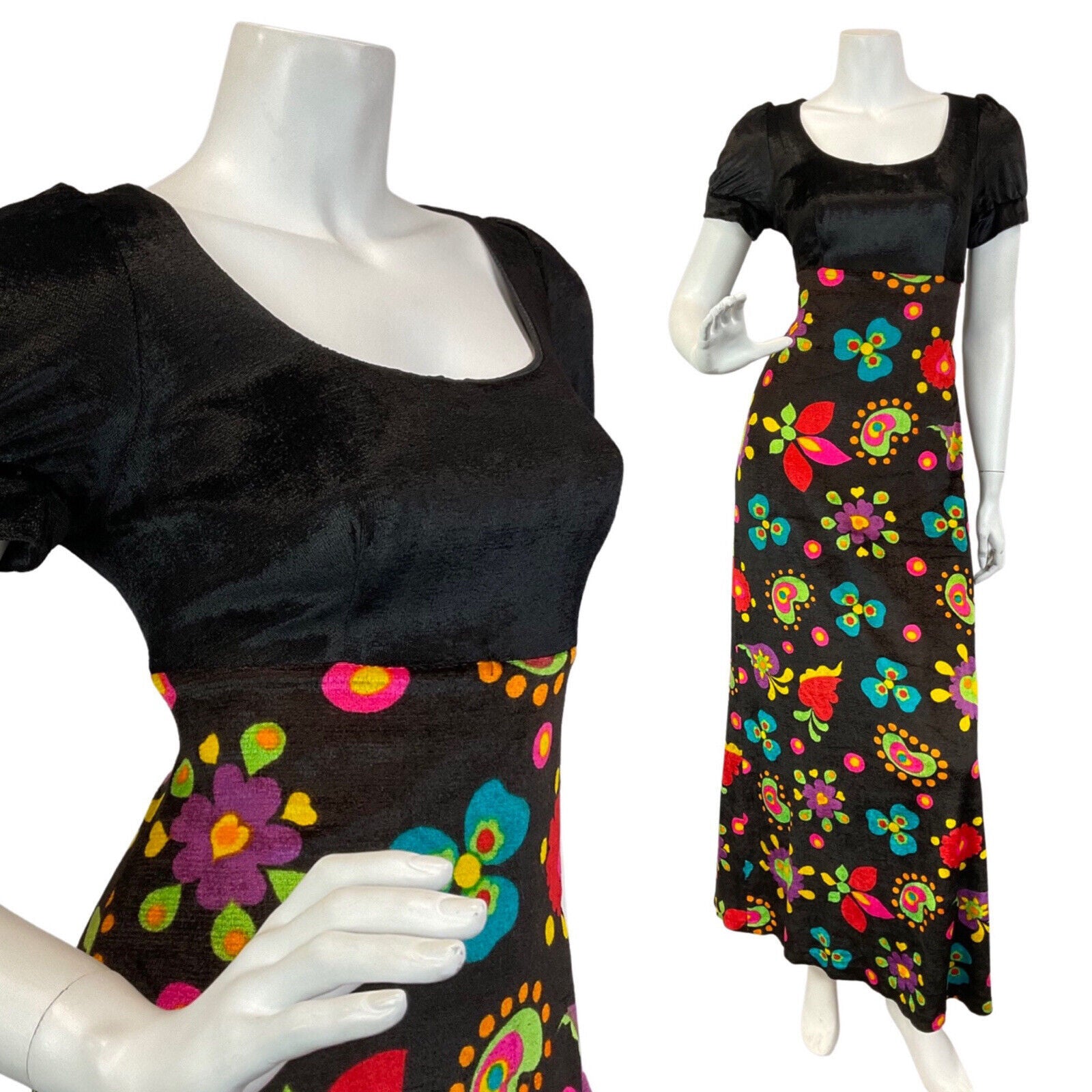 VINTAGE 60s 70s BLACK BLUE PINK FLOWER POWER MOD EMPIRE VELVET MAXI DRESS 10 12