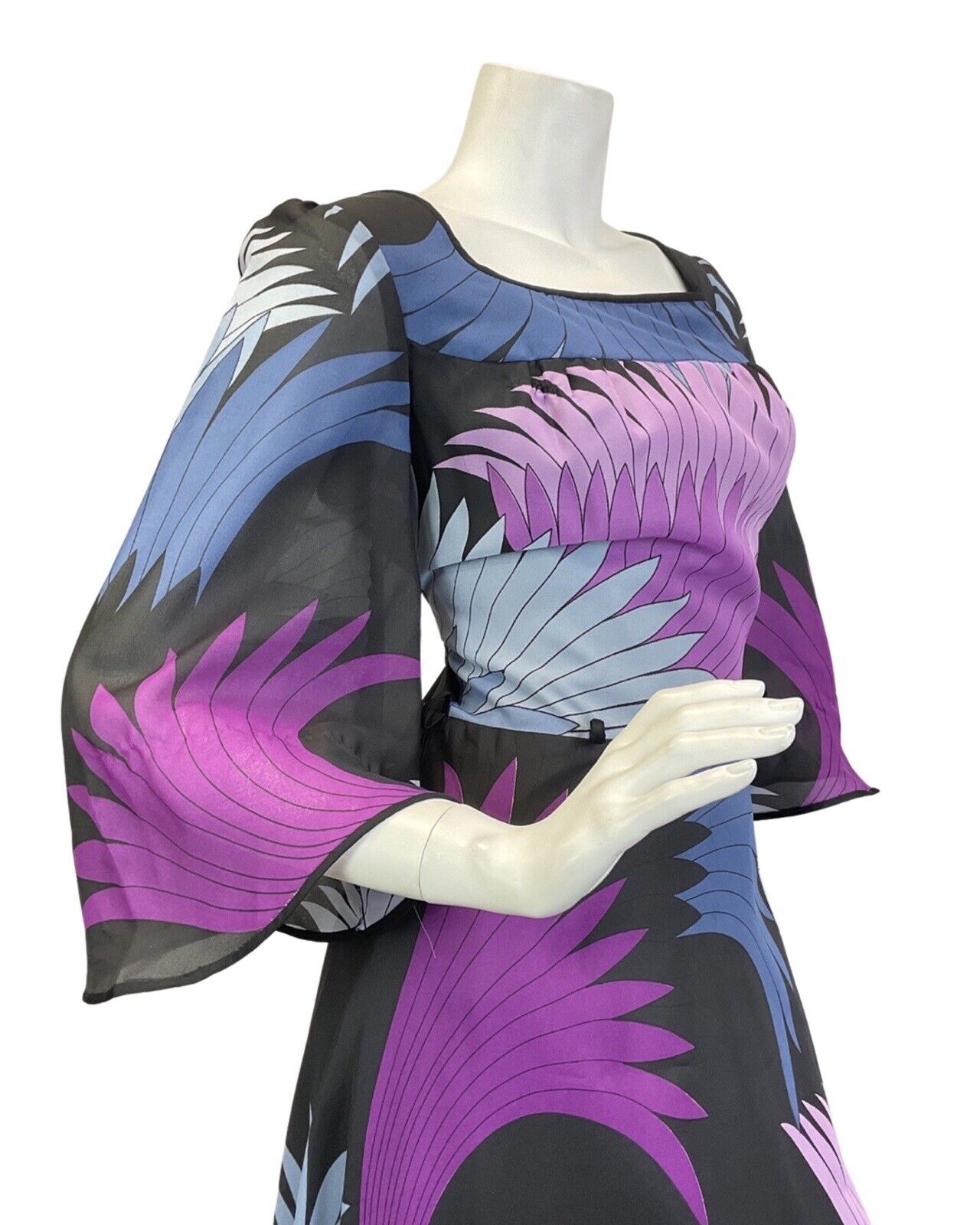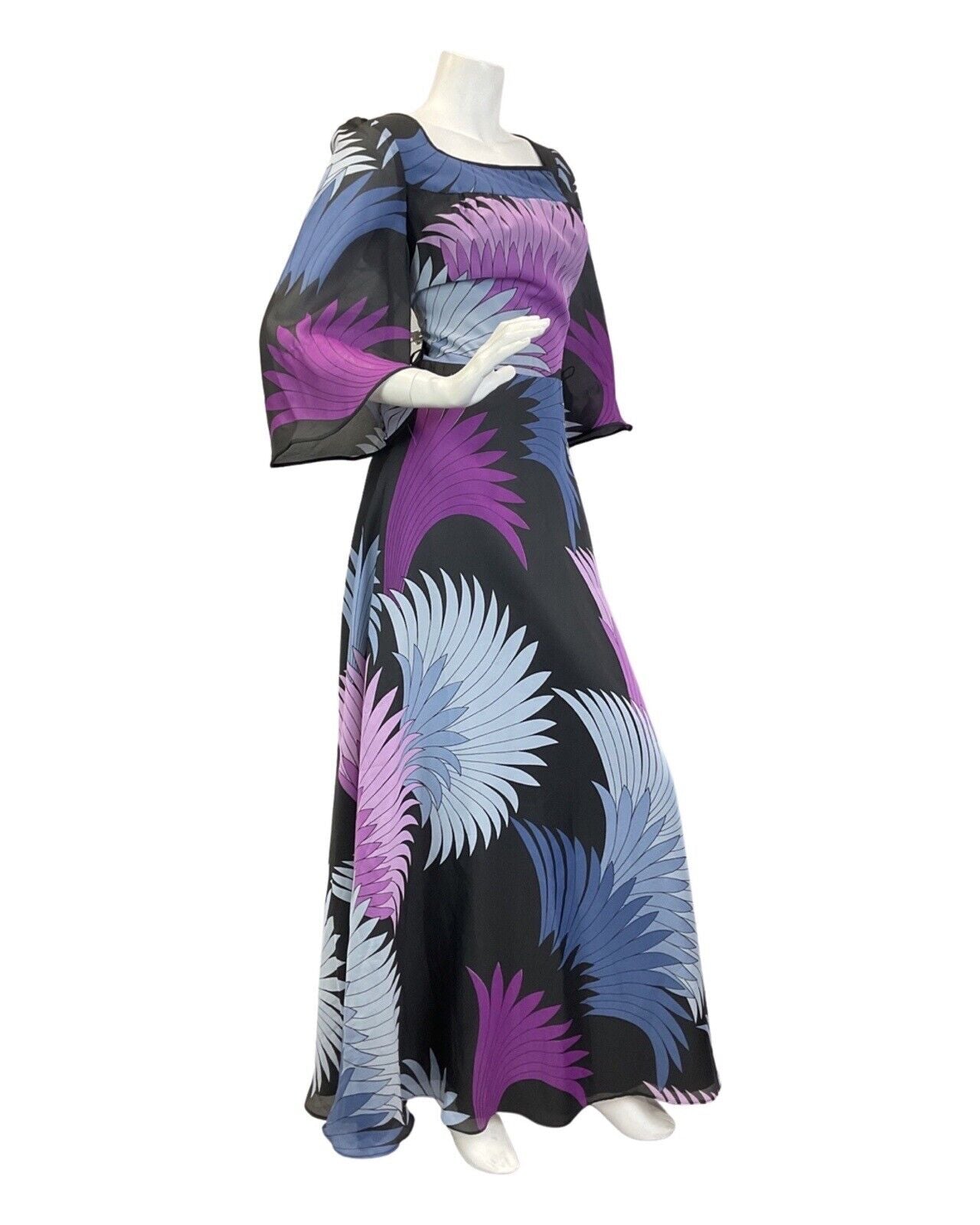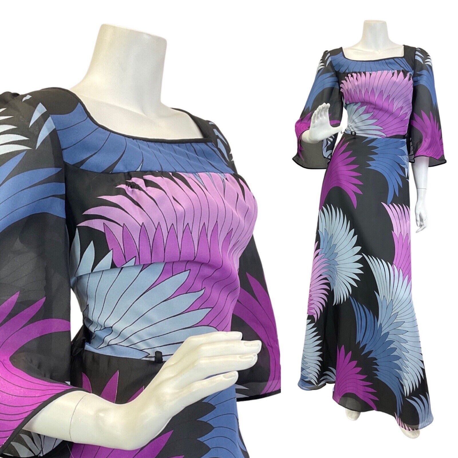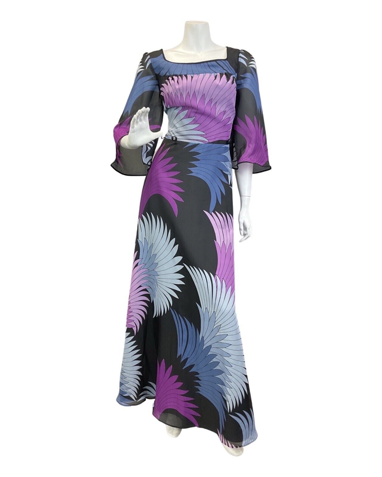 VINTAGE 60s 70s BLACK BLUE PURPLE FAN FEATHER MOD MAXI DRESS 12