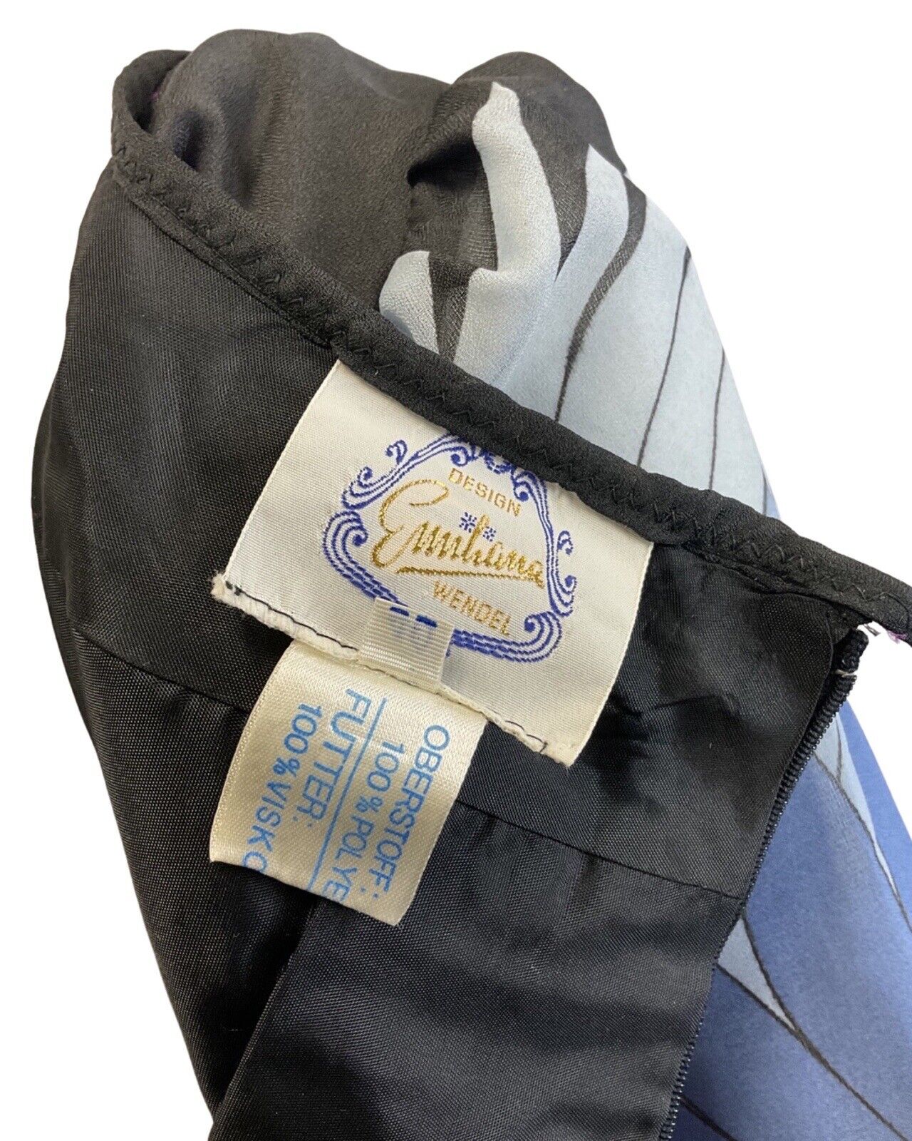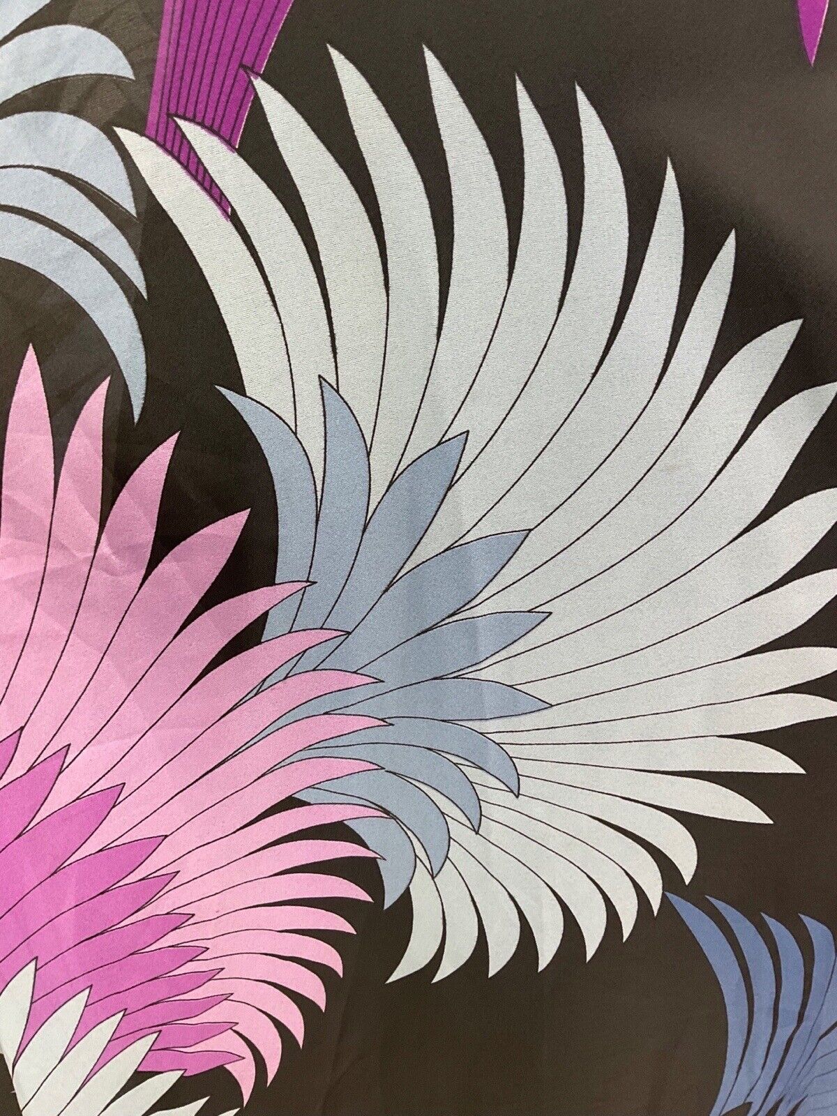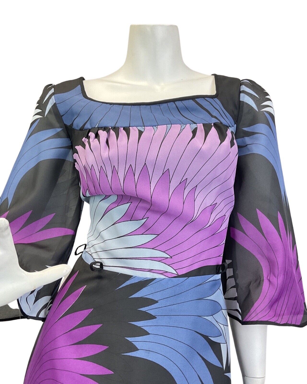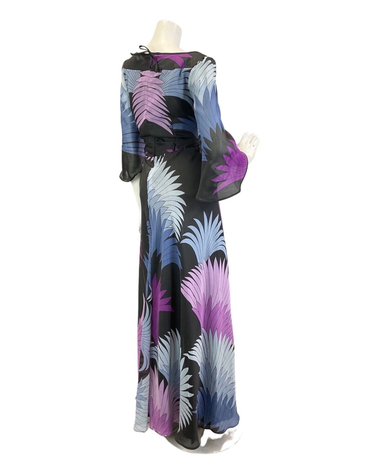 VINTAGE 60s 70s BLACK BLUE PURPLE FAN FEATHER MOD MAXI DRESS 12