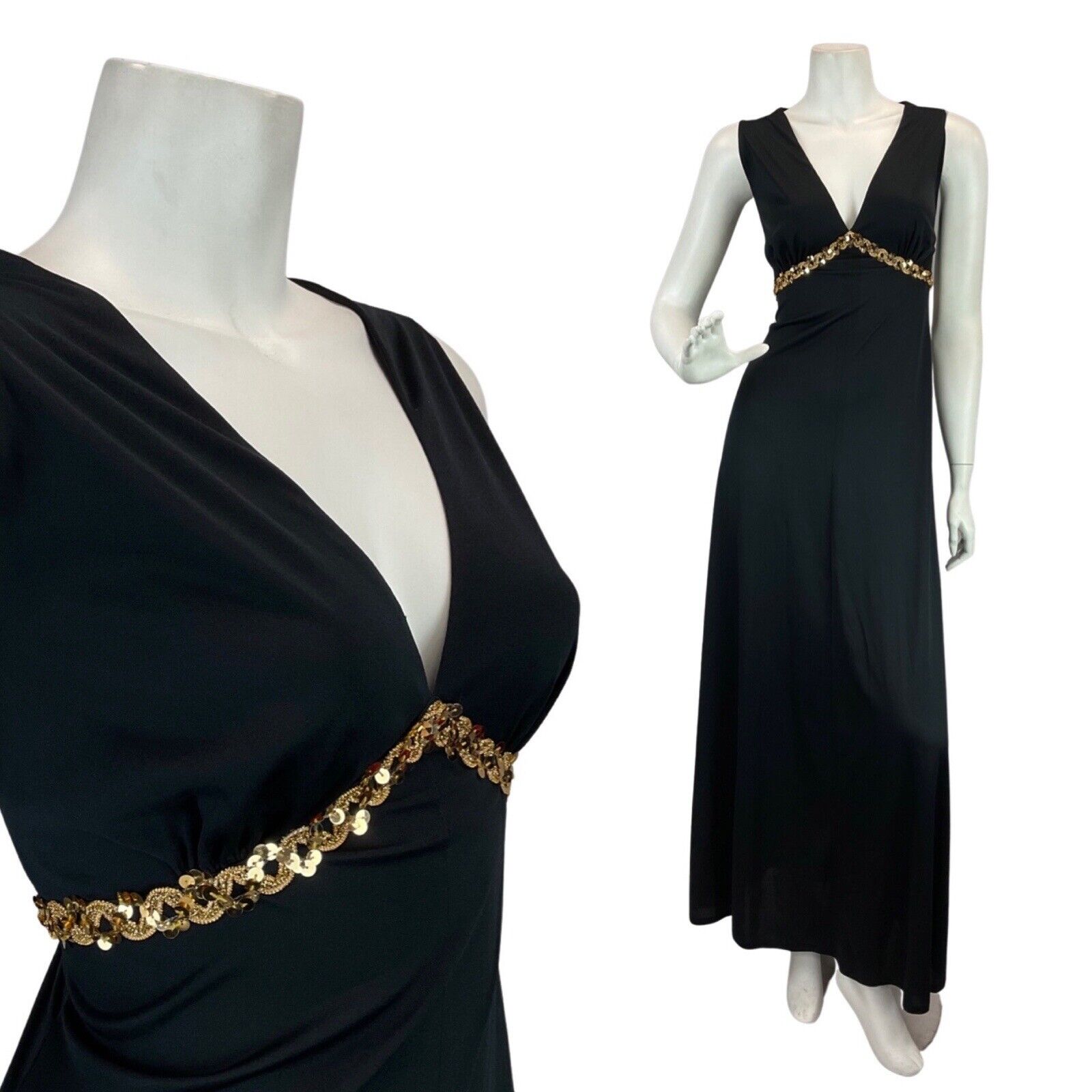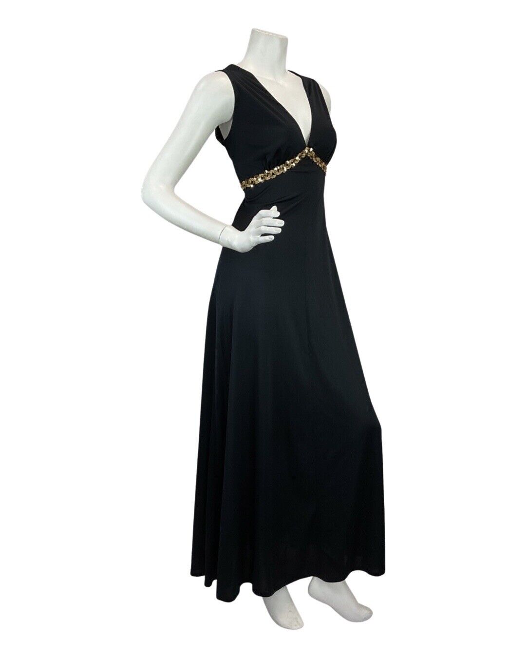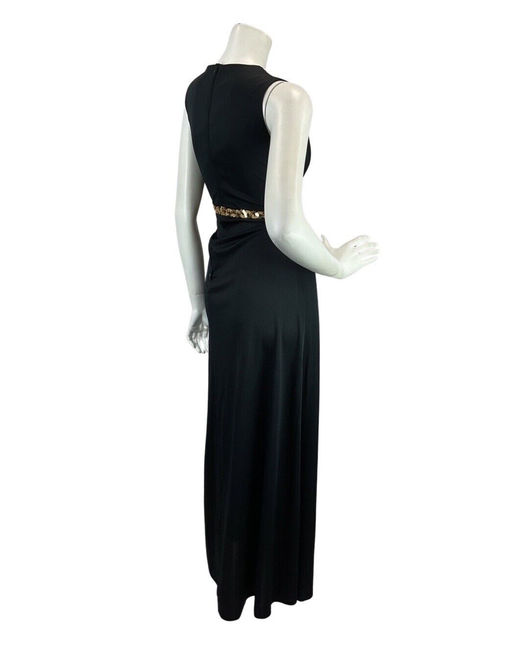 VINTAGE 60s 70s BLACK GOLD SEQUIN GLAM SLEEVELESS EVENING GOWN MAXI DRESS 10