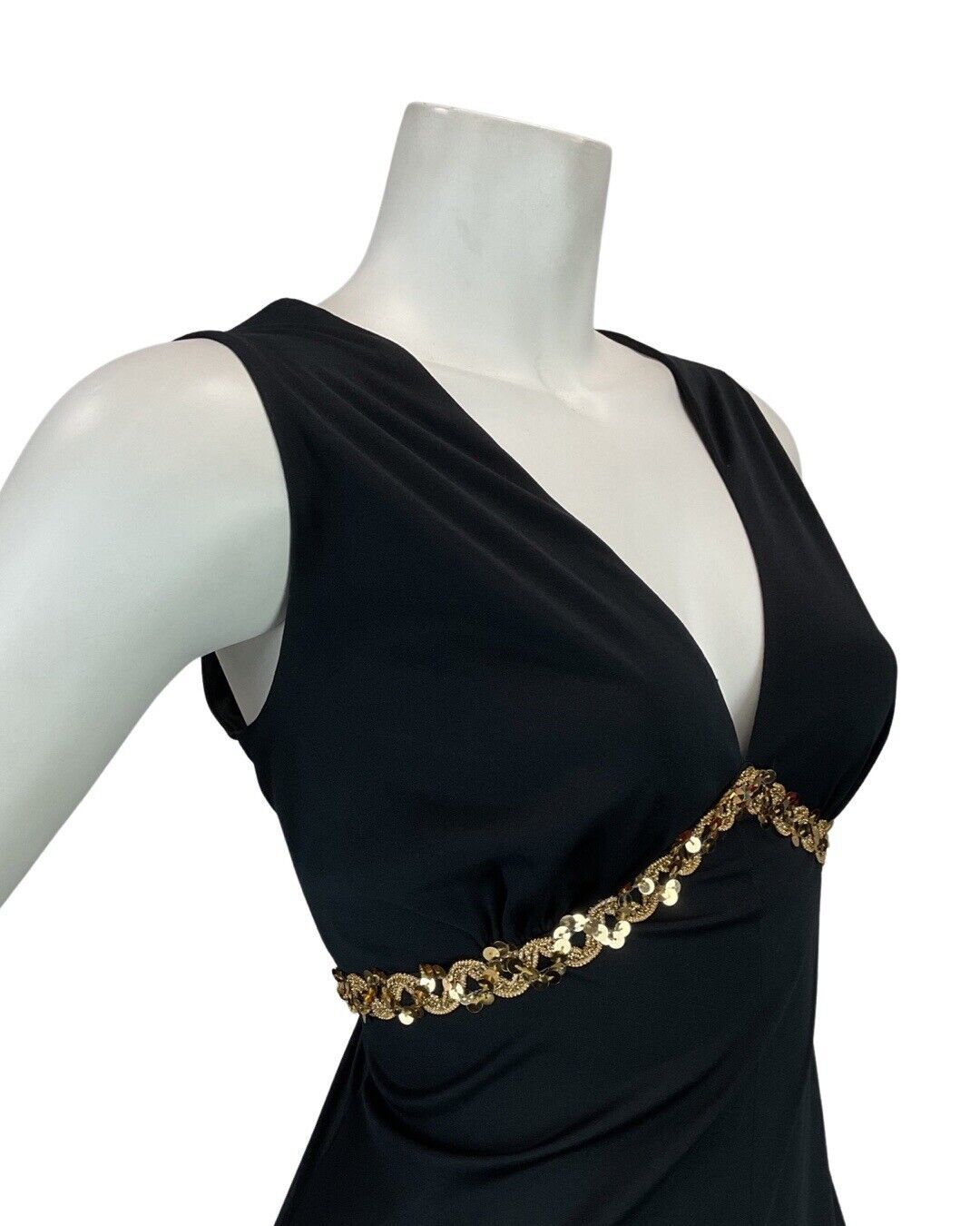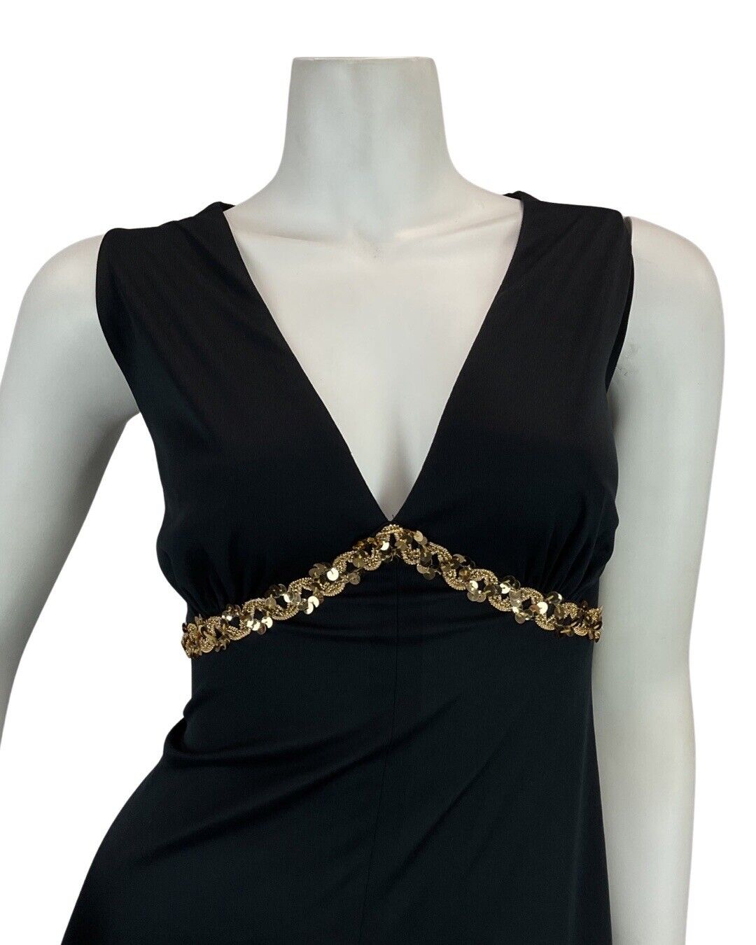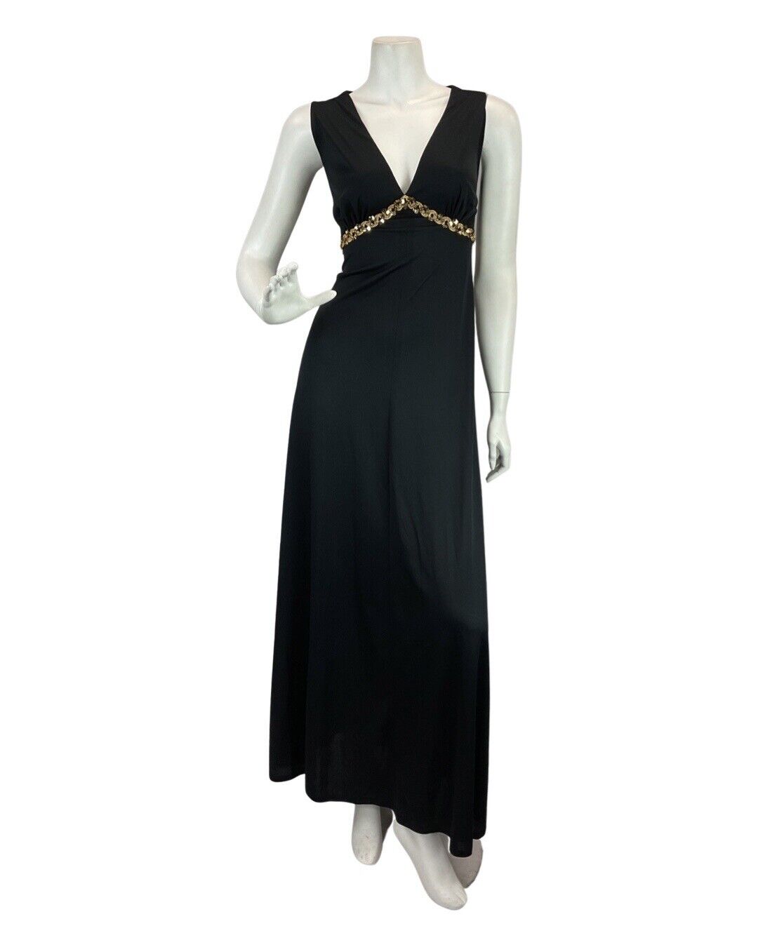 VINTAGE 60s 70s BLACK GOLD SEQUIN GLAM SLEEVELESS EVENING GOWN MAXI DRESS 10