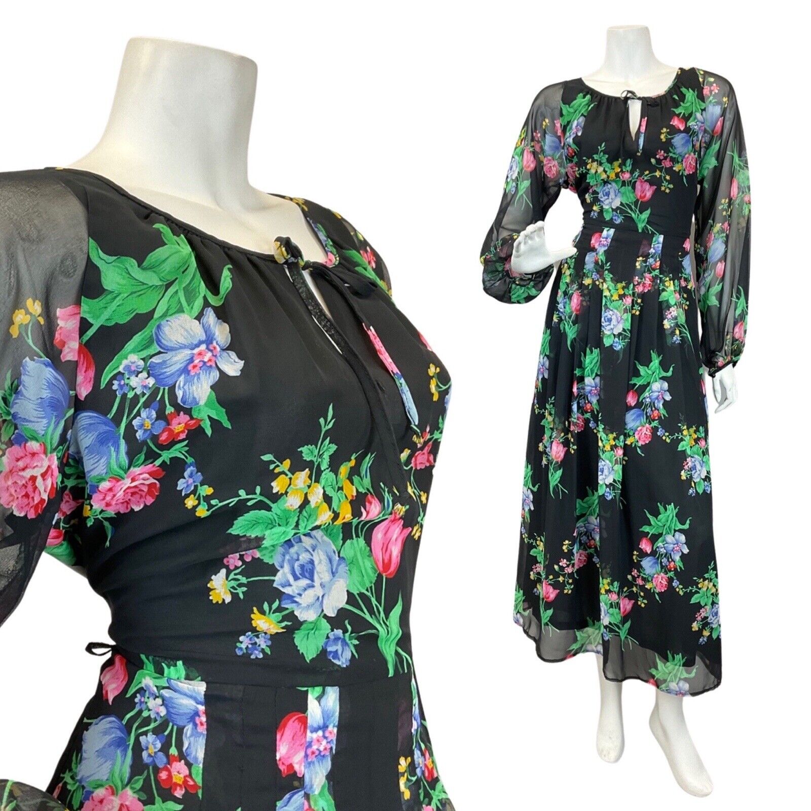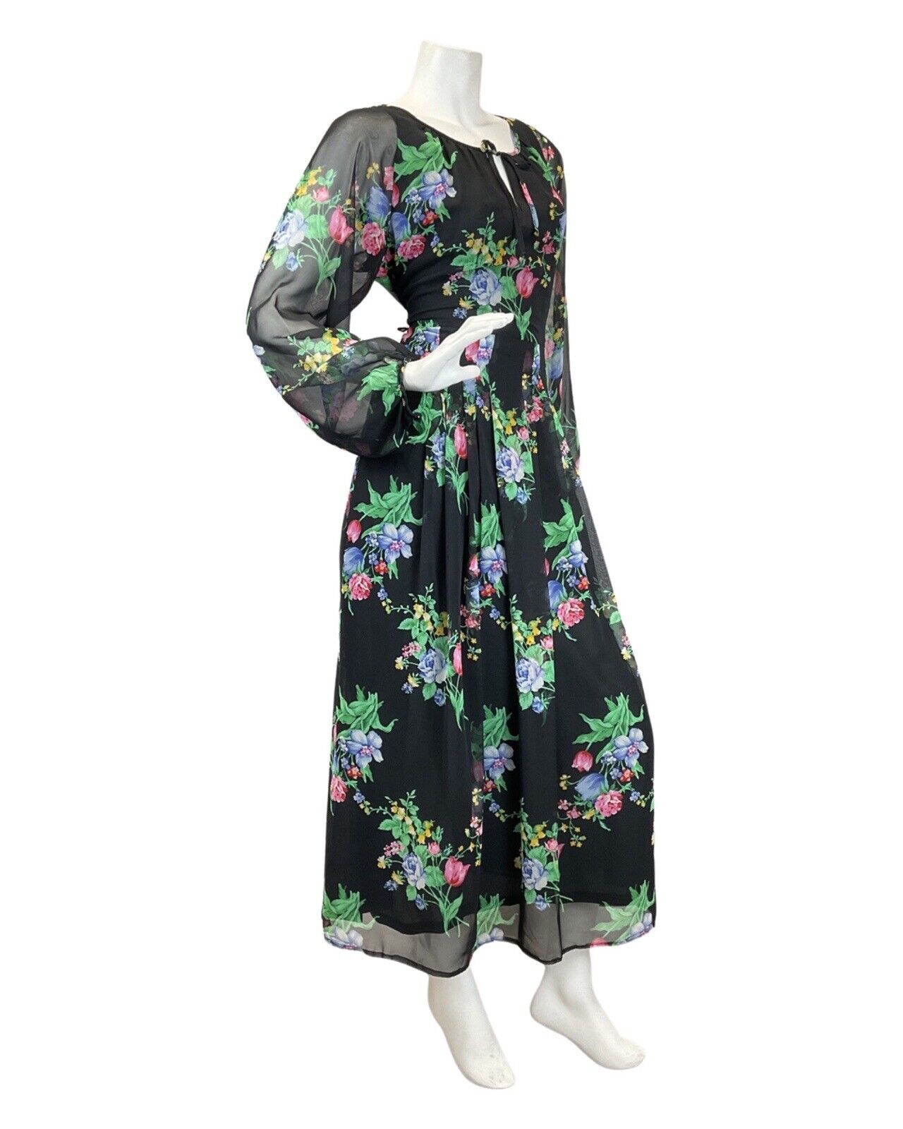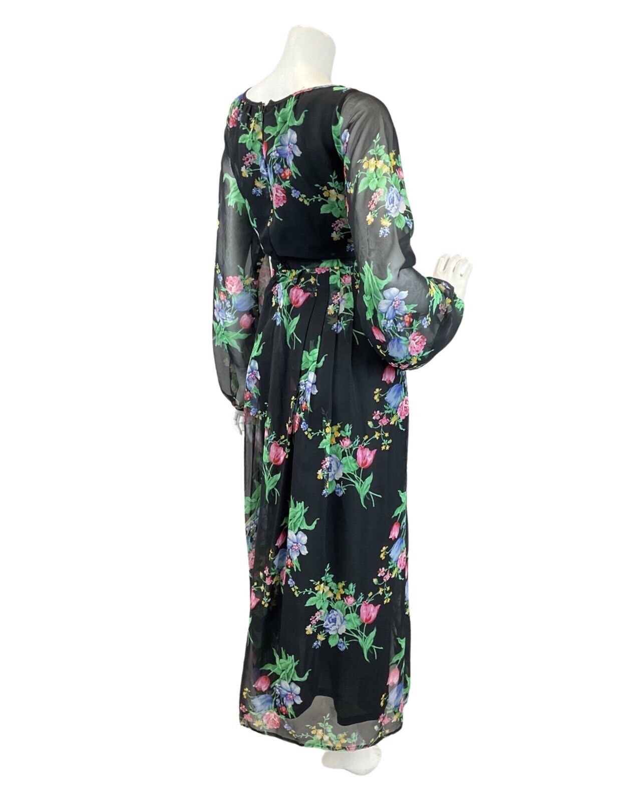 VINTAGE 60s 70s BLACK GREEN BLUE FLORAL BOUQUET ROSE SHEER MAXI DRESS 14