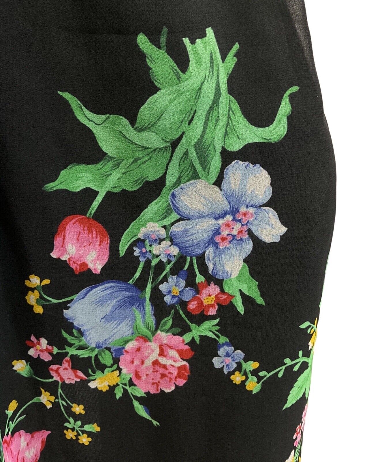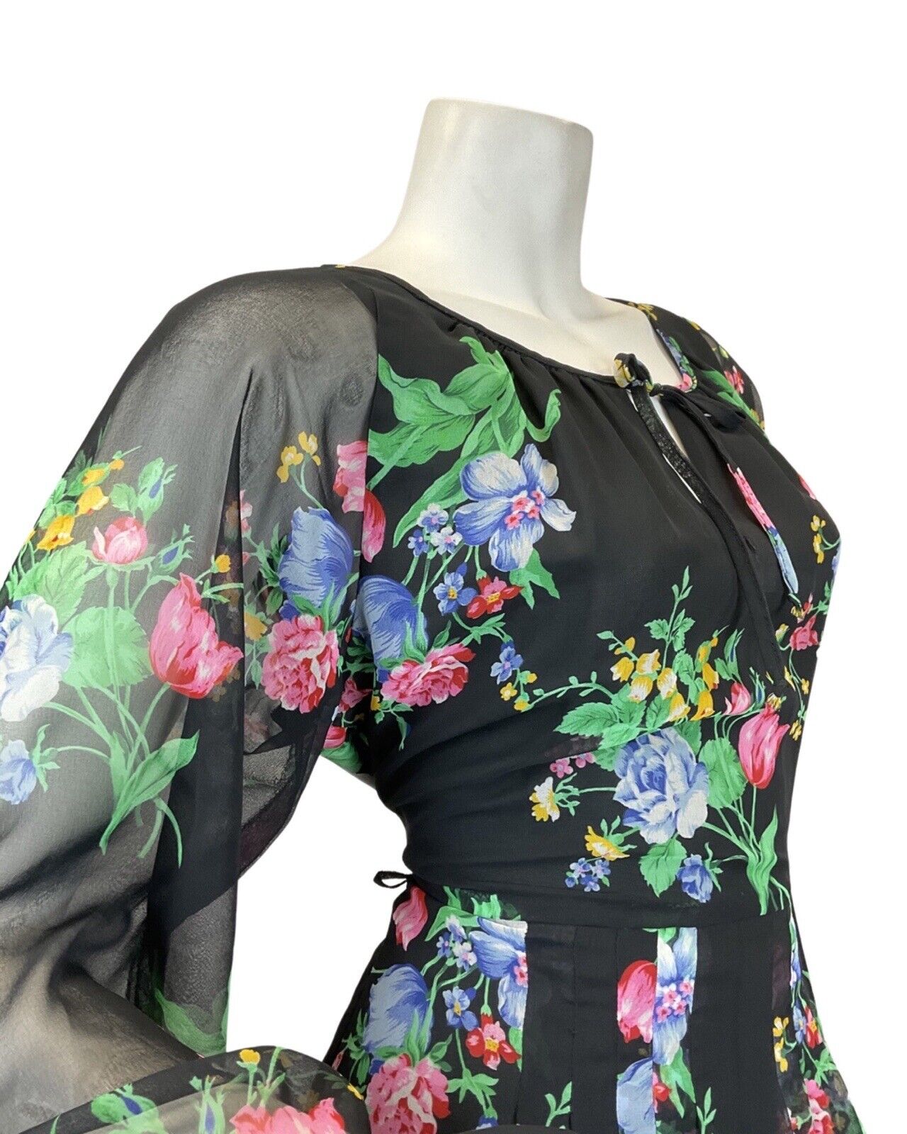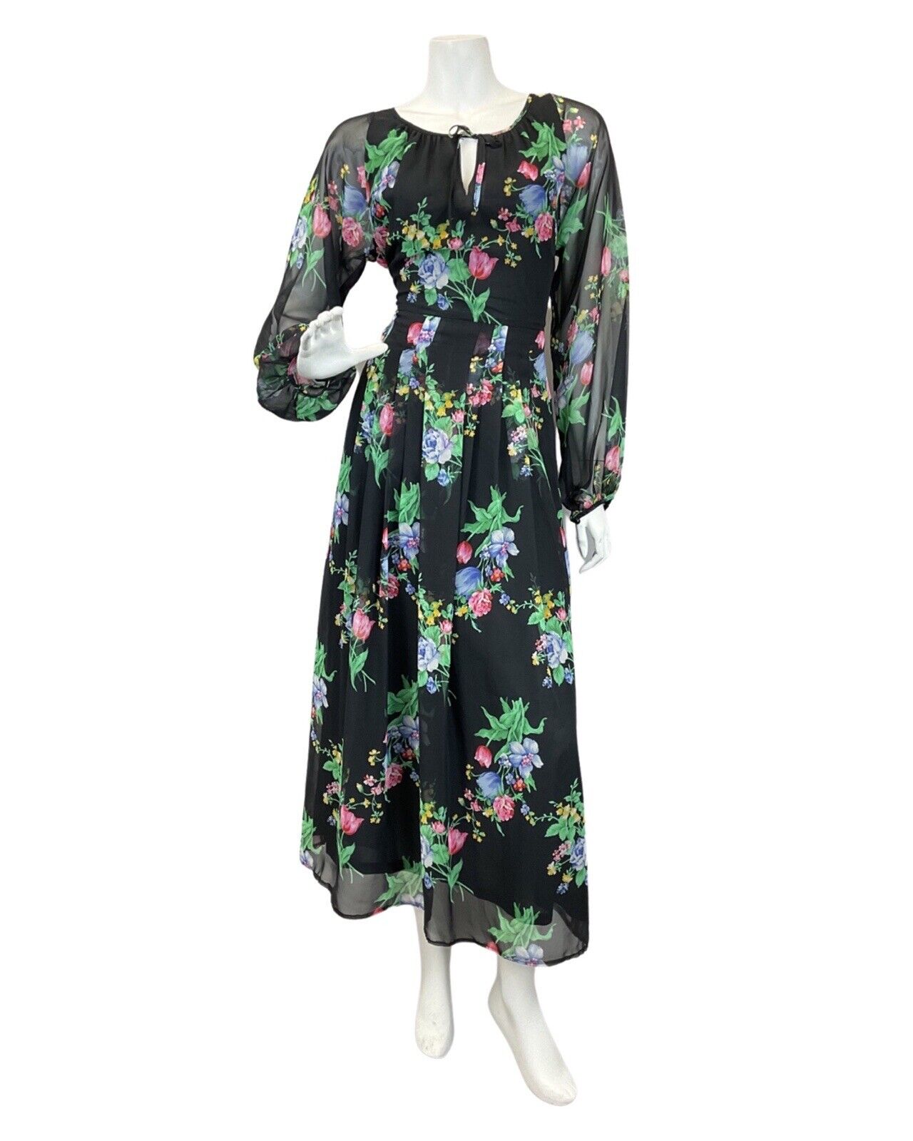 VINTAGE 60s 70s BLACK GREEN BLUE FLORAL BOUQUET ROSE SHEER MAXI DRESS 14
