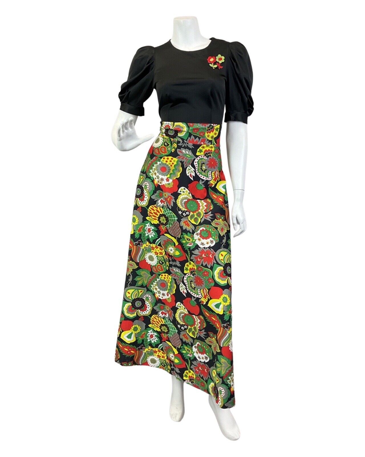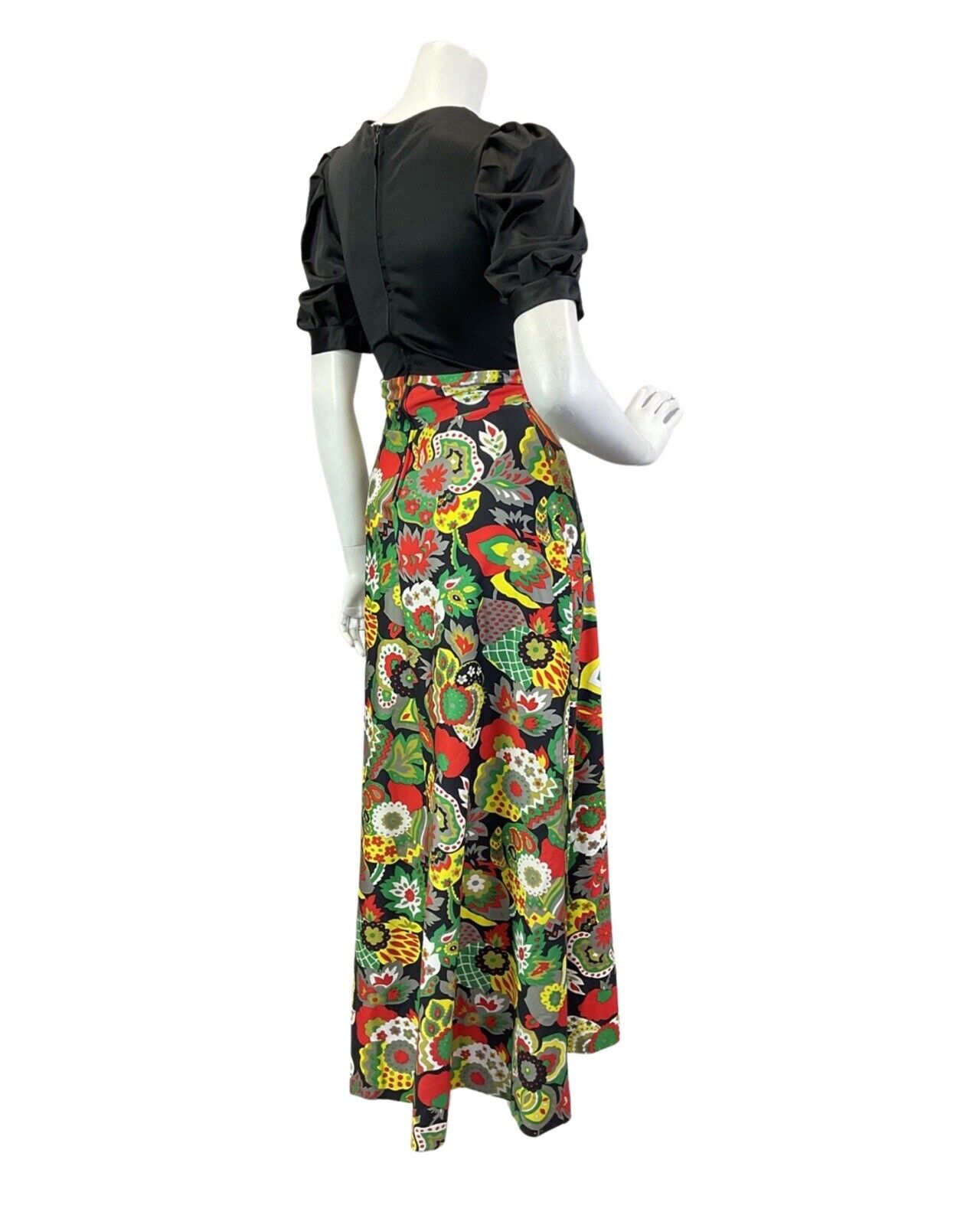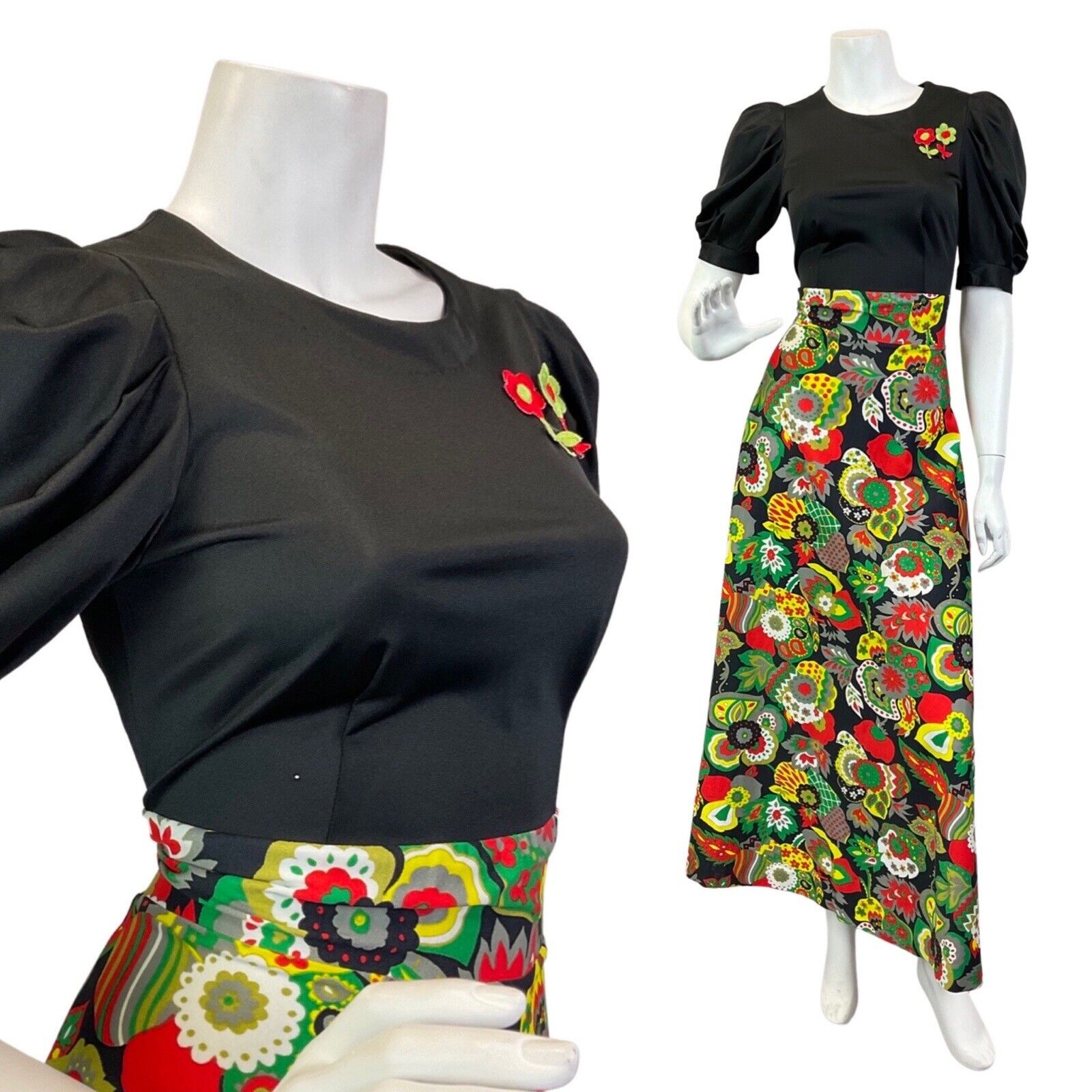 VINTAGE 60s 70s BLACK GREEN YELLOW PSYCHEDELIC FLORAL MANDALA MOD MAXI DRESS 8