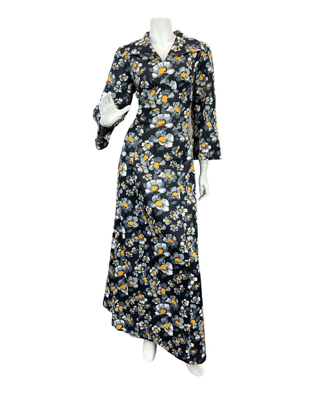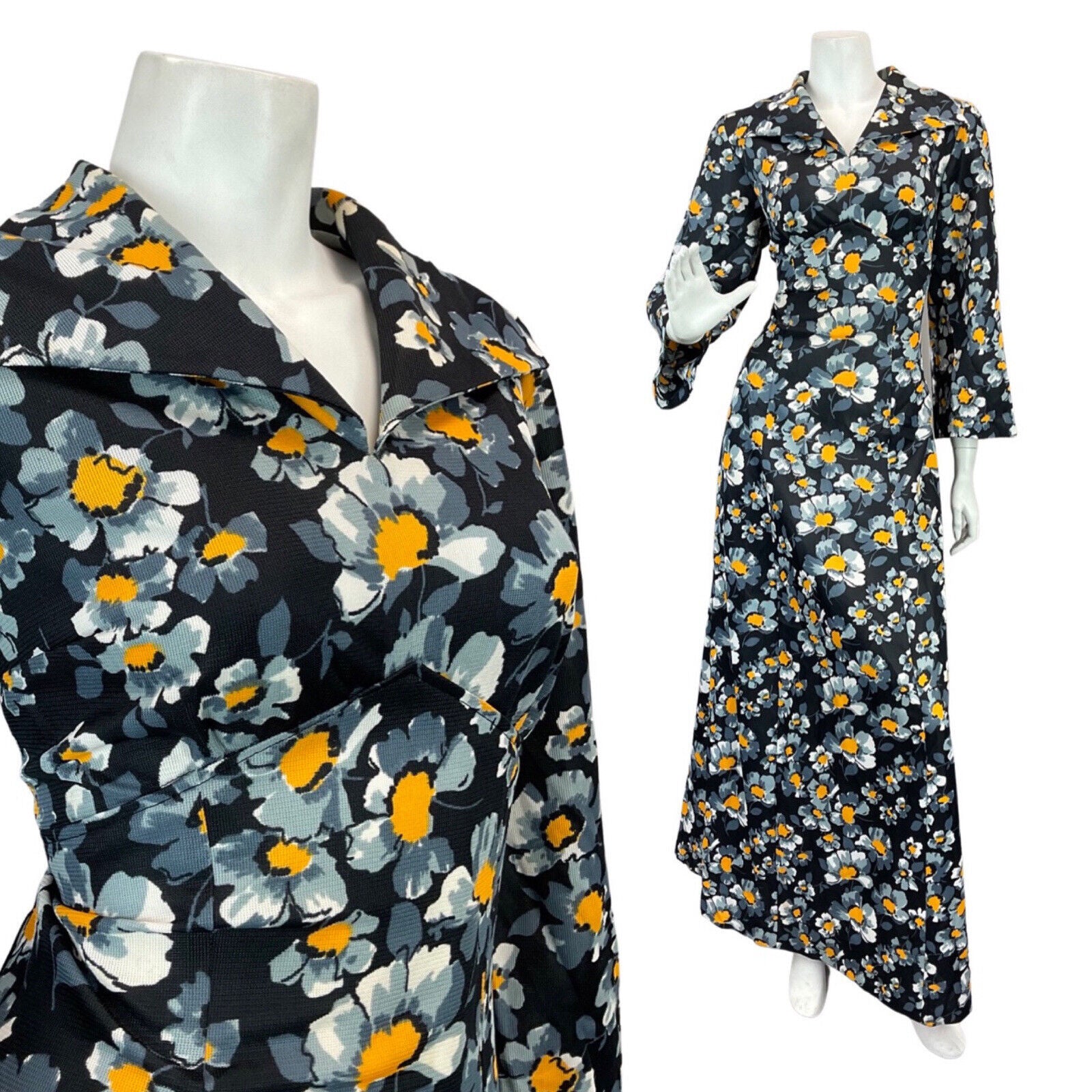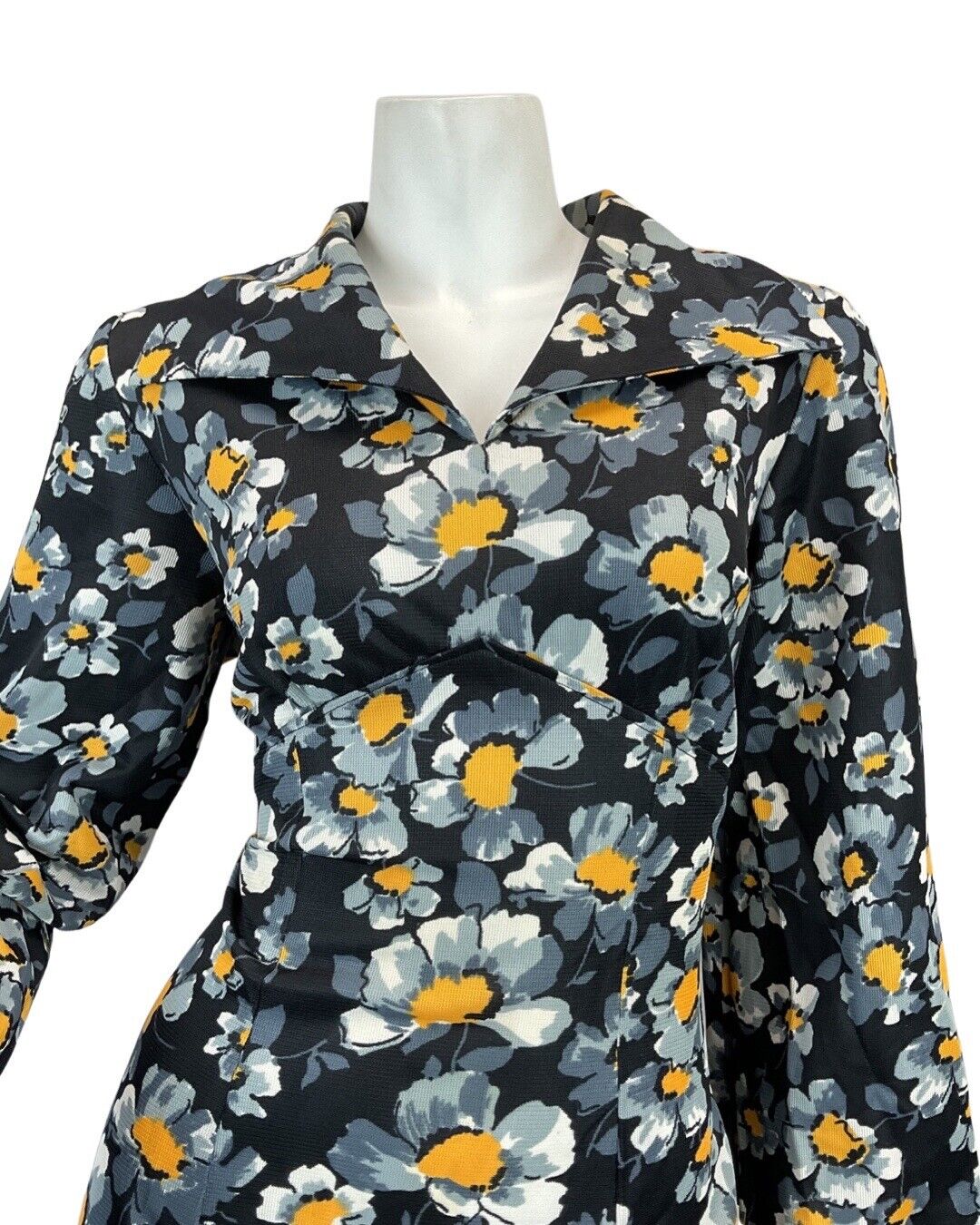 VINTAGE 60s 70s BLACK GREY YELLOW FLORAL PSYCHEDELIC MOD SHIRT MAXI DRESS 12