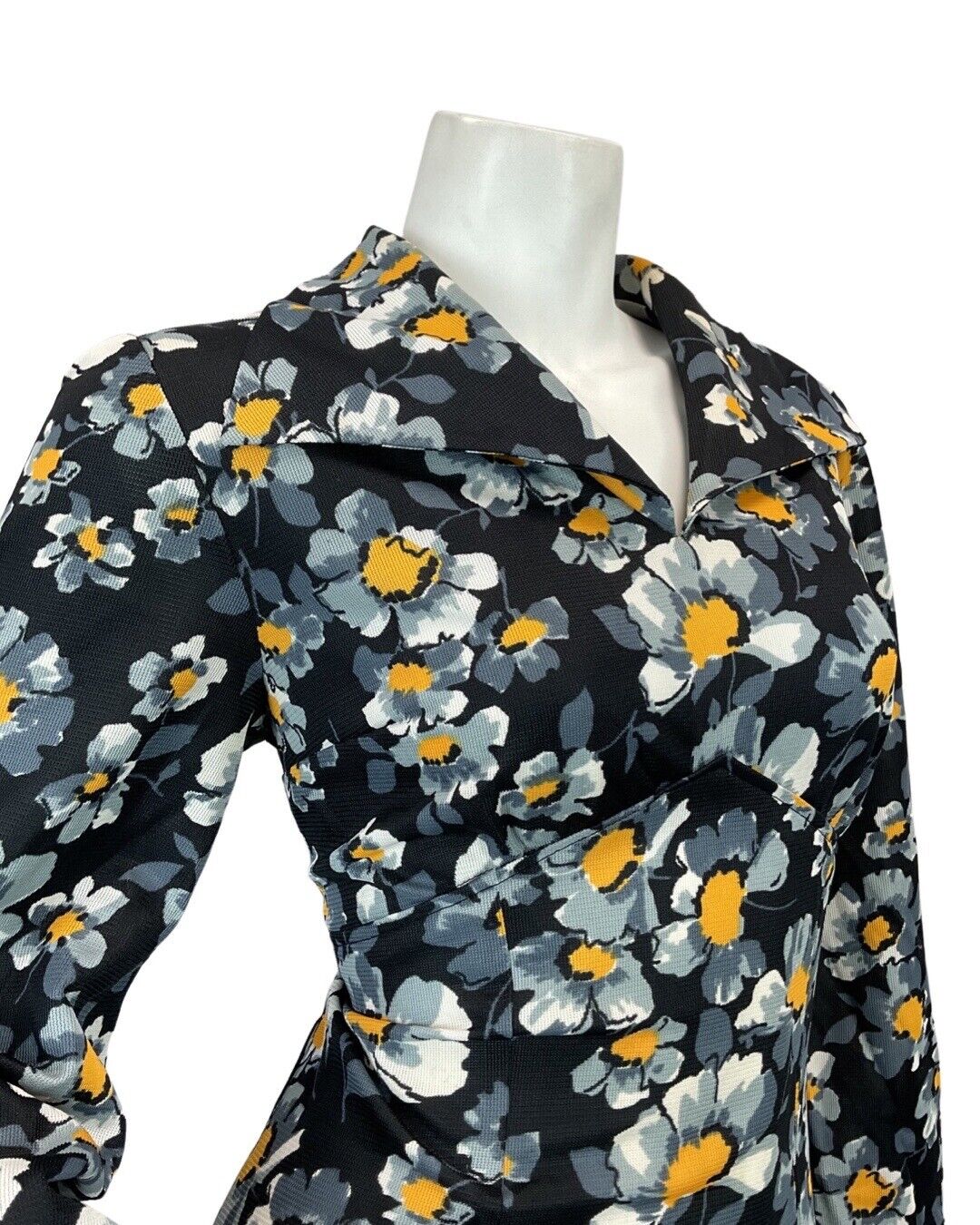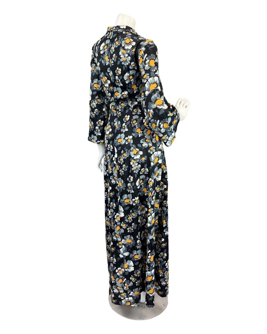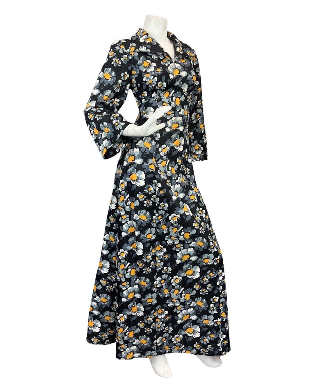 VINTAGE 60s 70s BLACK GREY YELLOW FLORAL PSYCHEDELIC MOD SHIRT MAXI DRESS 12