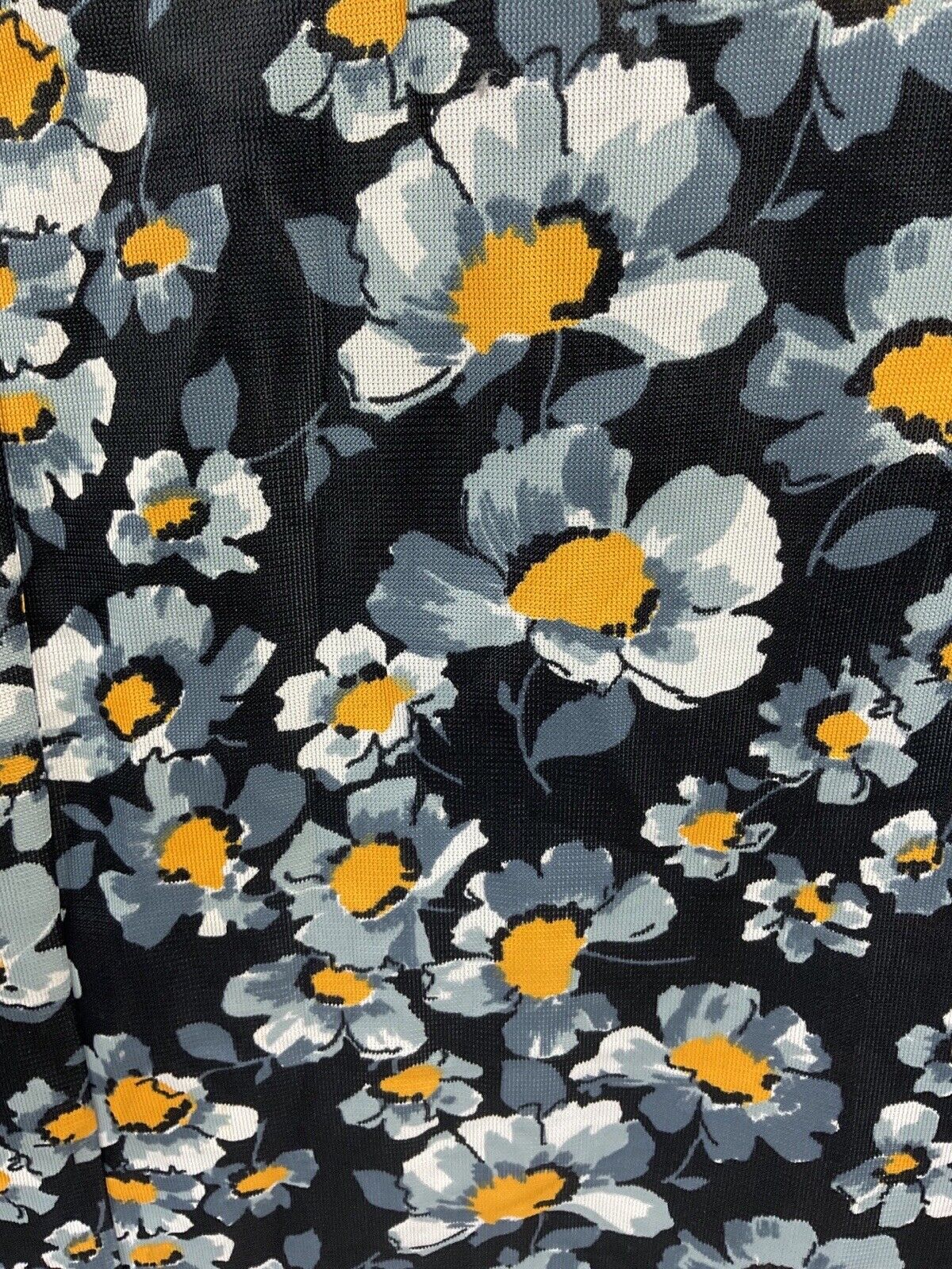Covering the fabric is a busy floral pattern in shades of grey, black, white and yellow.