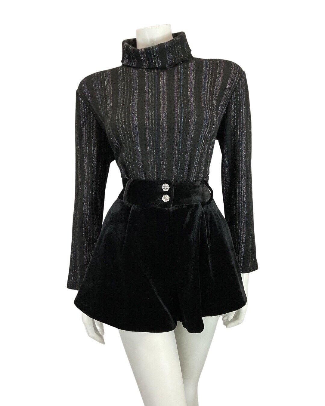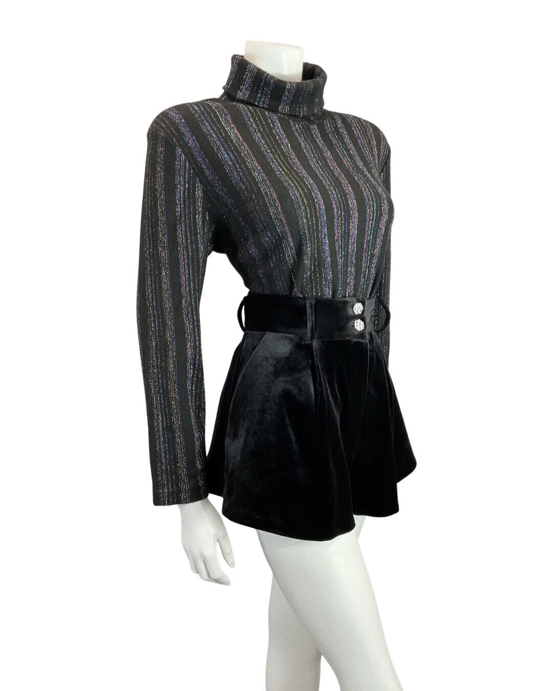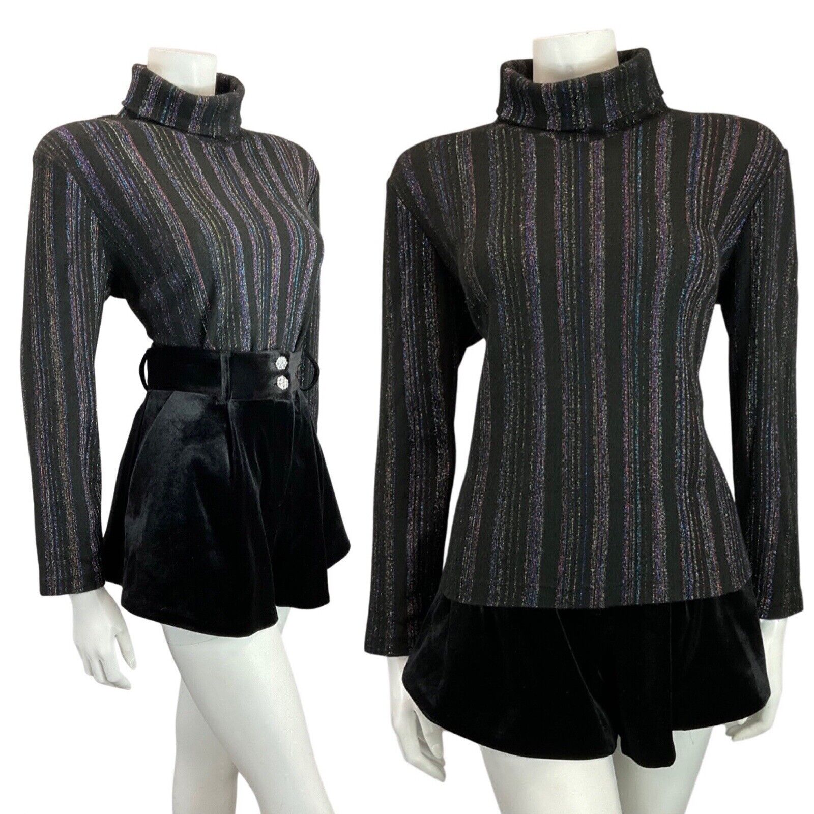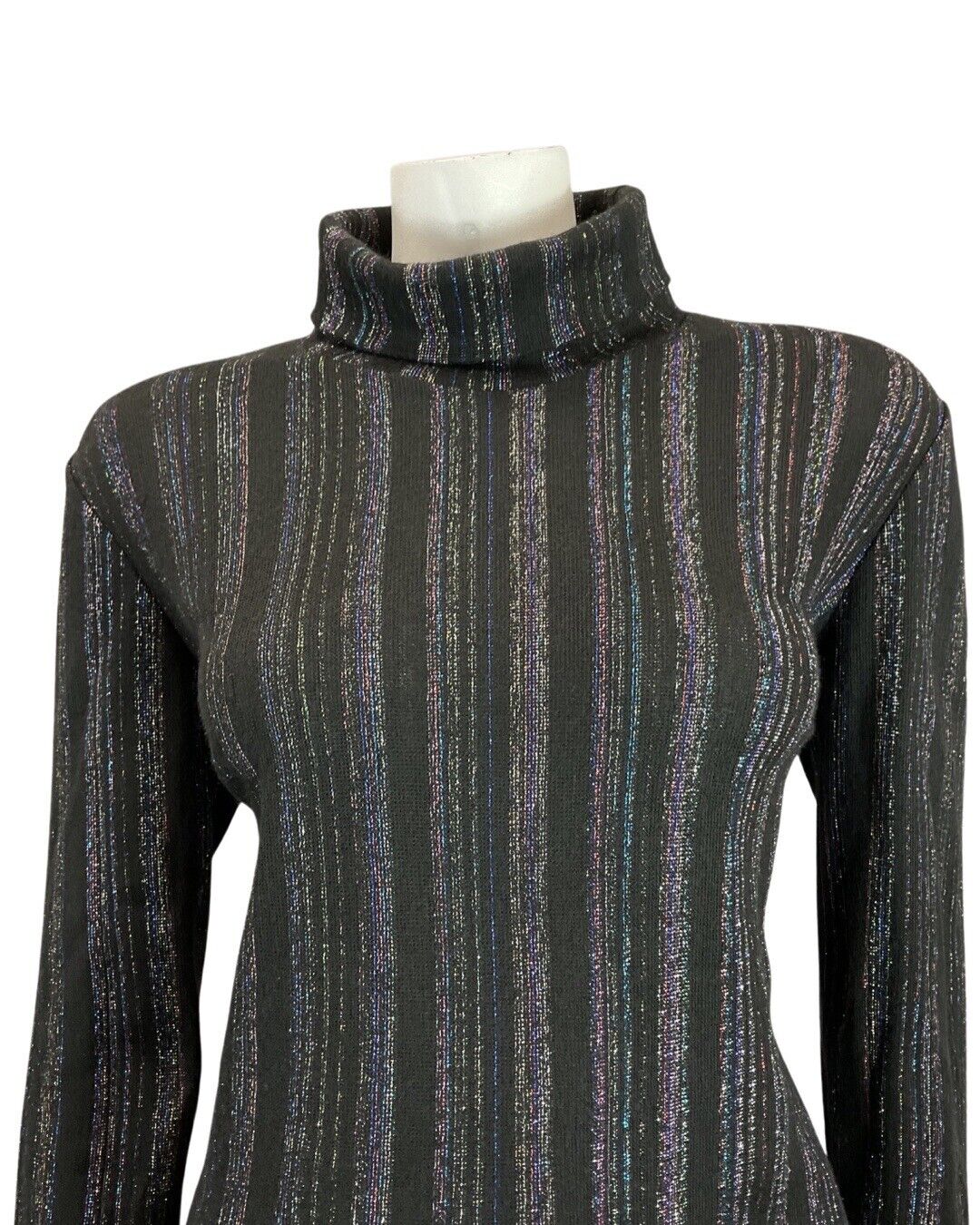 VINTAGE 60s 70s BLACK IRIDESCENT STRIPED ROLL-NECK TURTLENECK KNIT TOP 12 14