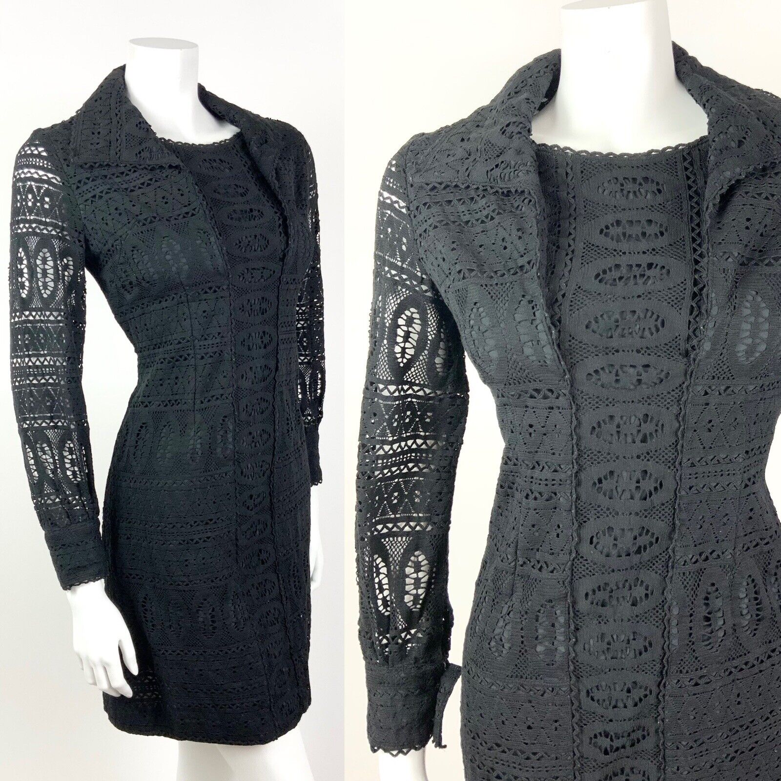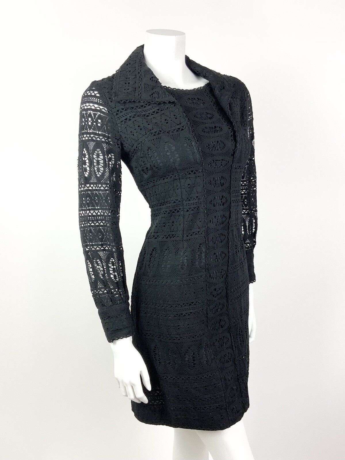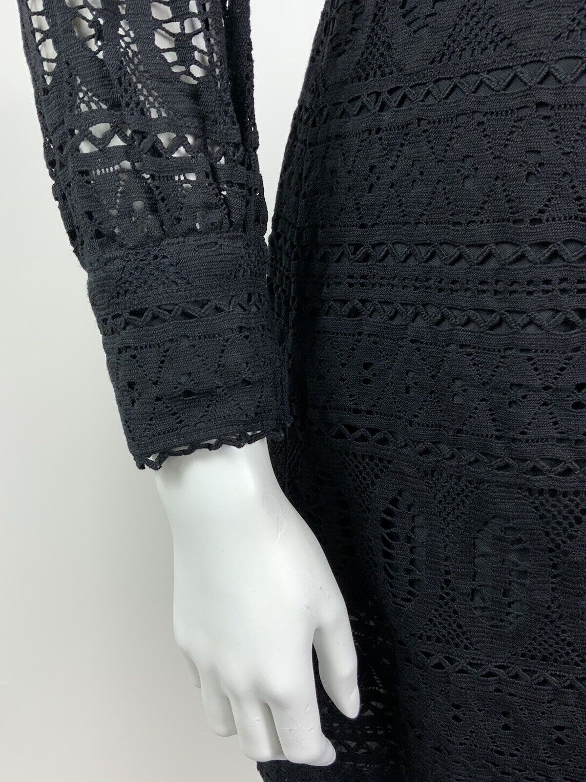 VINTAGE 60s 70s BLACK LACE CROCHET MOD COVEN GLAM WING COLLAR DRESS 10 12