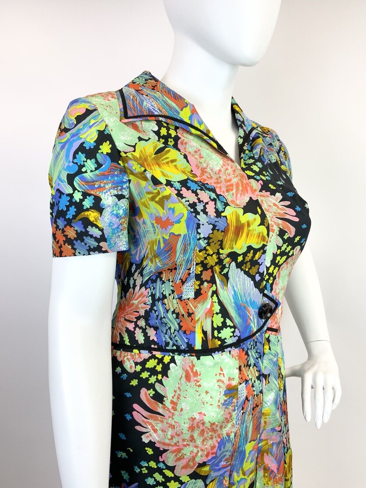 VINTAGE 60s 70s BLACK MULTICOLOURED PSYCHEDELIC ACID FLORAL LEAFY SHIRT DRESS 18