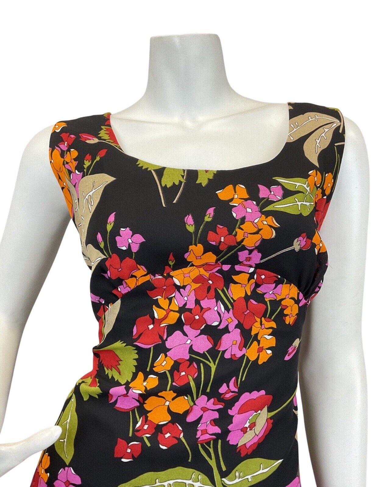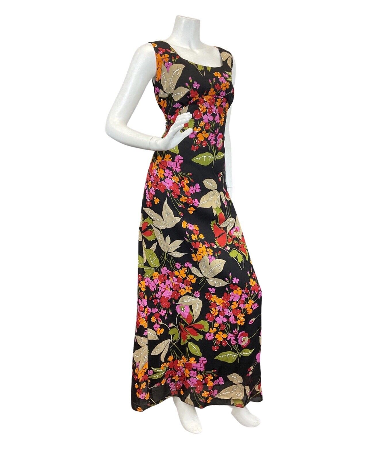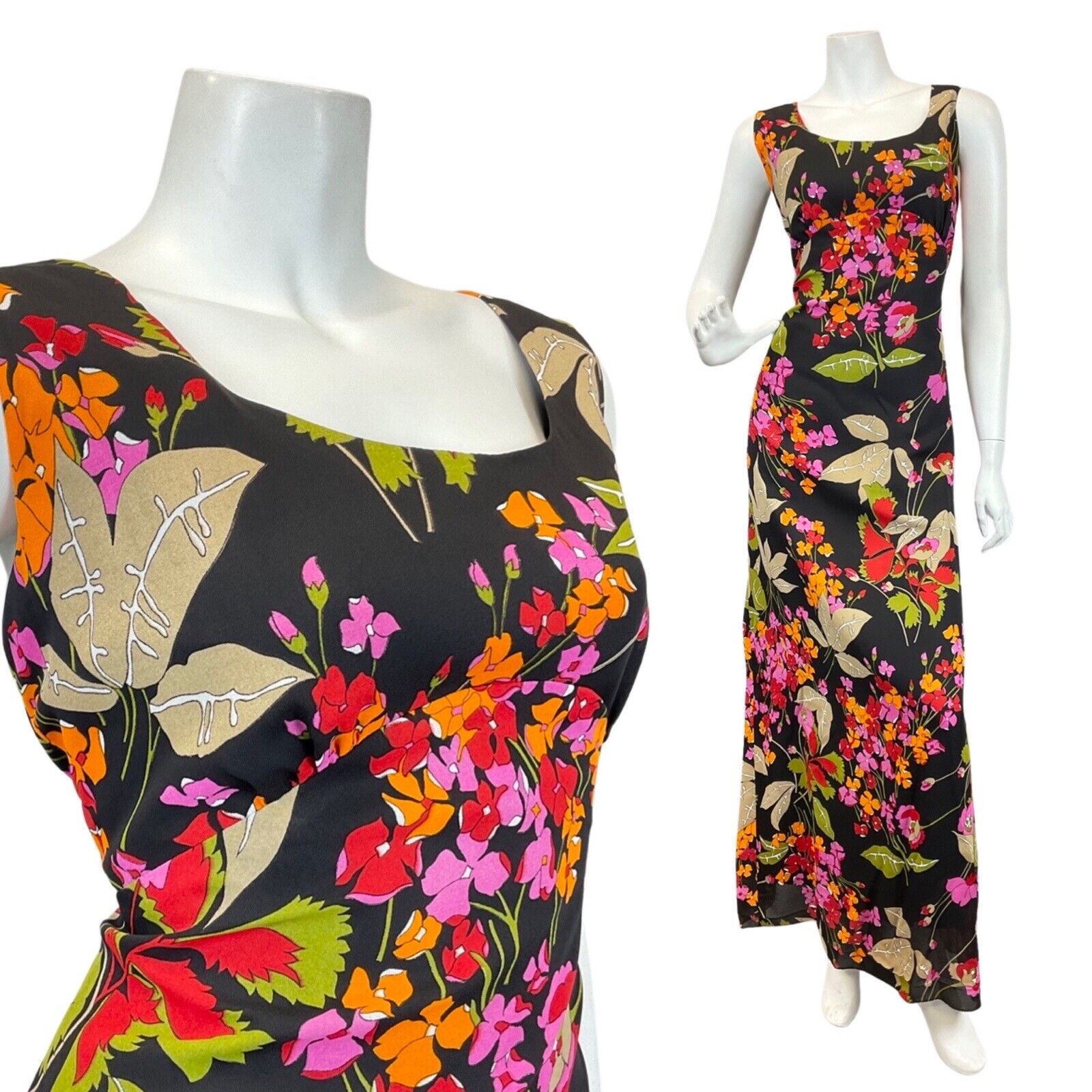 VINTAGE 60s 70s BLACK ORANGE RED FLORAL PSYCHEDELIC SLEEVELESS MAXI DRESS 12 14