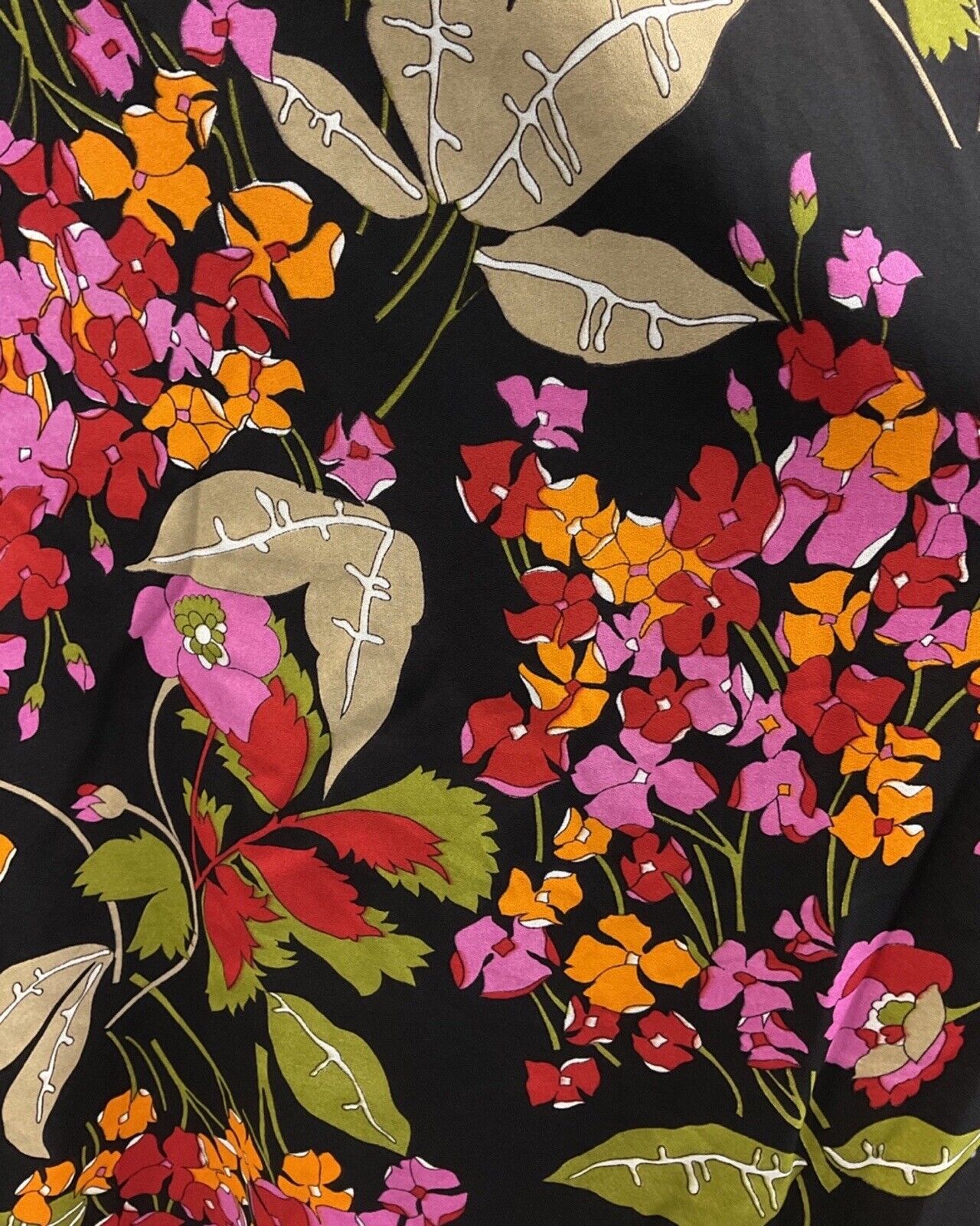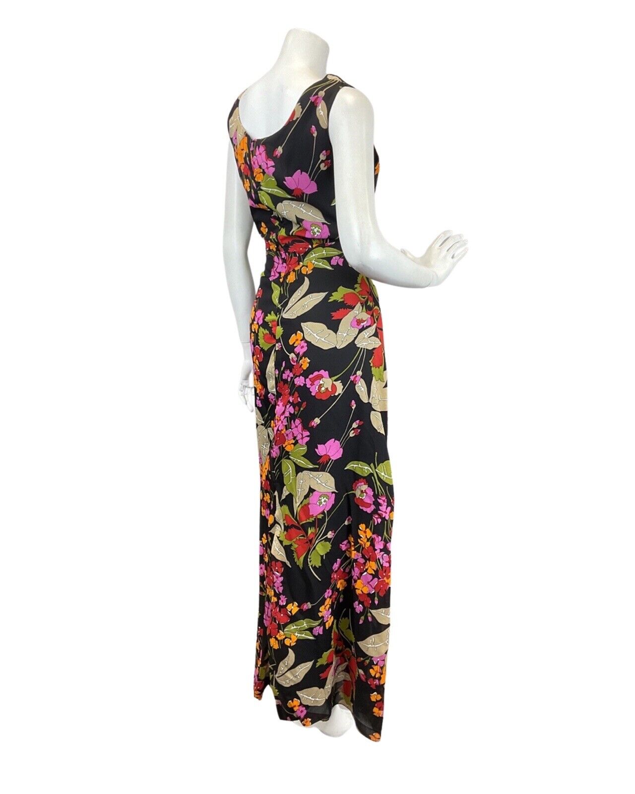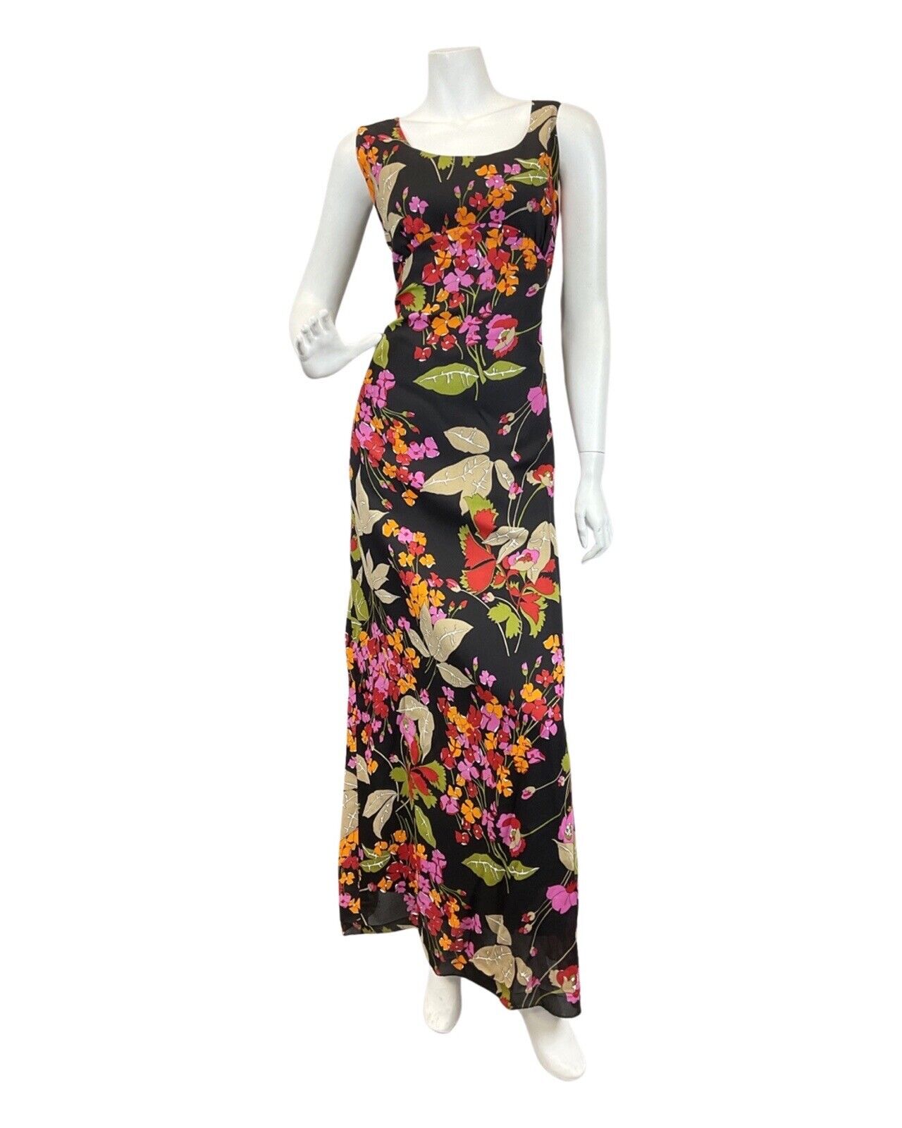VINTAGE 60s 70s BLACK ORANGE RED FLORAL PSYCHEDELIC SLEEVELESS MAXI DRESS 12 14