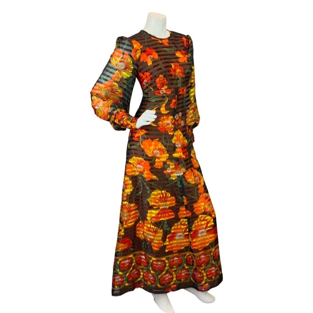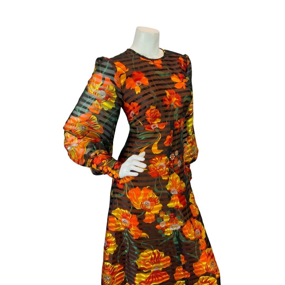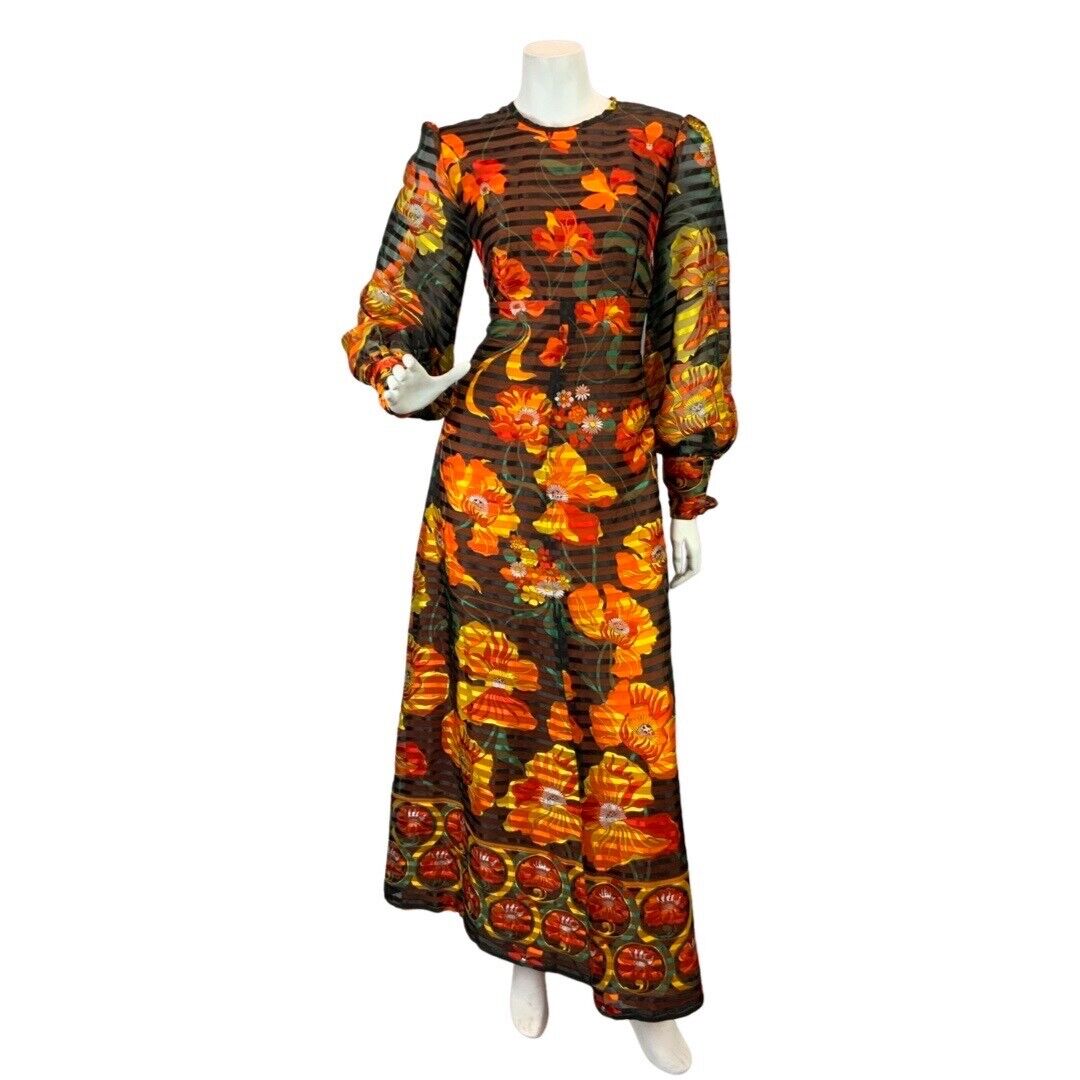 VINTAGE 60s 70s BLACK ORANGE RED SHEER STRIPED FLORAL MOD PSYCH MAXI DRESS 10