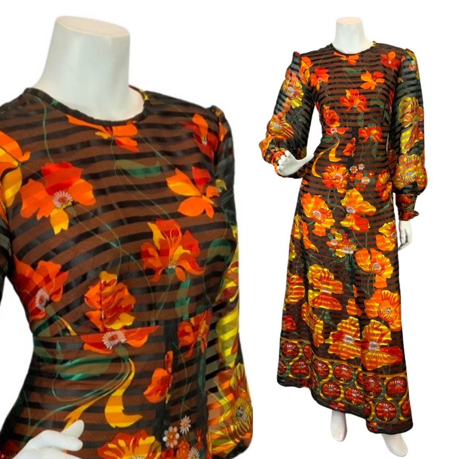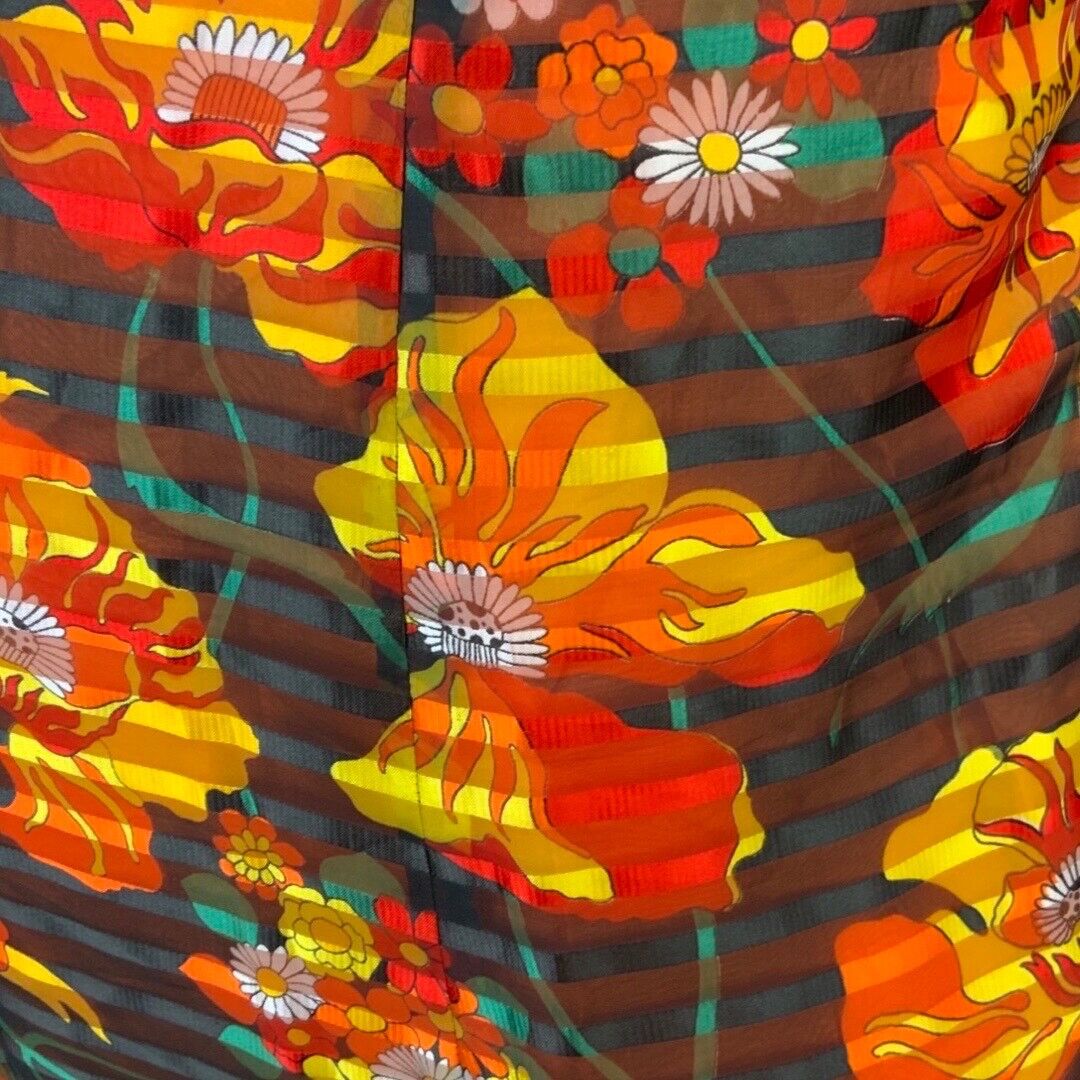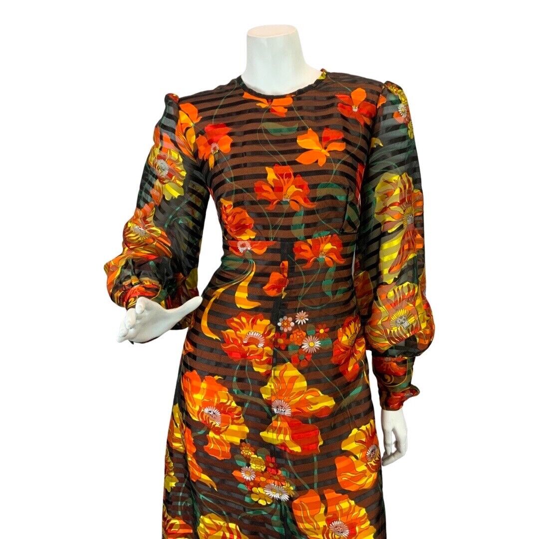 VINTAGE 60s 70s BLACK ORANGE RED SHEER STRIPED FLORAL MOD PSYCH MAXI DRESS 10