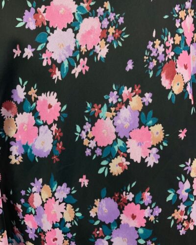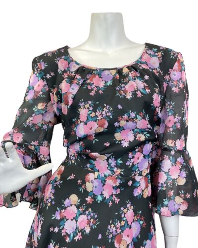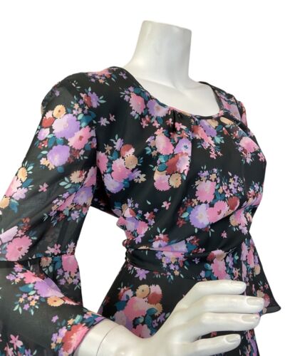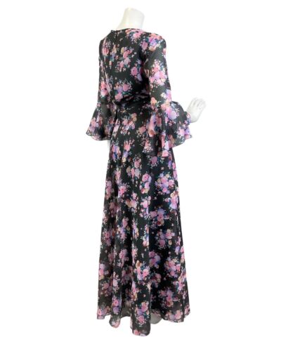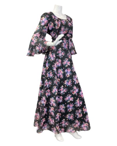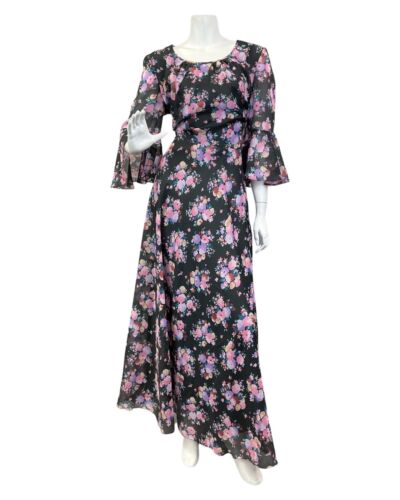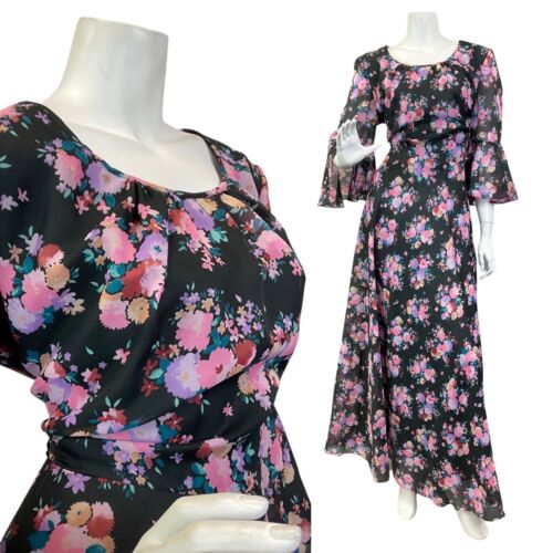VINTAGE 60s 70s BLACK PINK BLUE FLORAL BOUQUET FLOUNCE SLEEVE BOHO MAXI DRESS 16