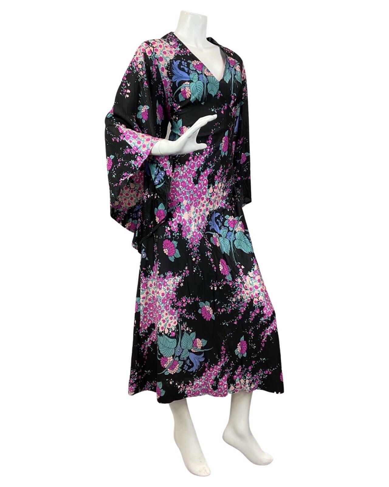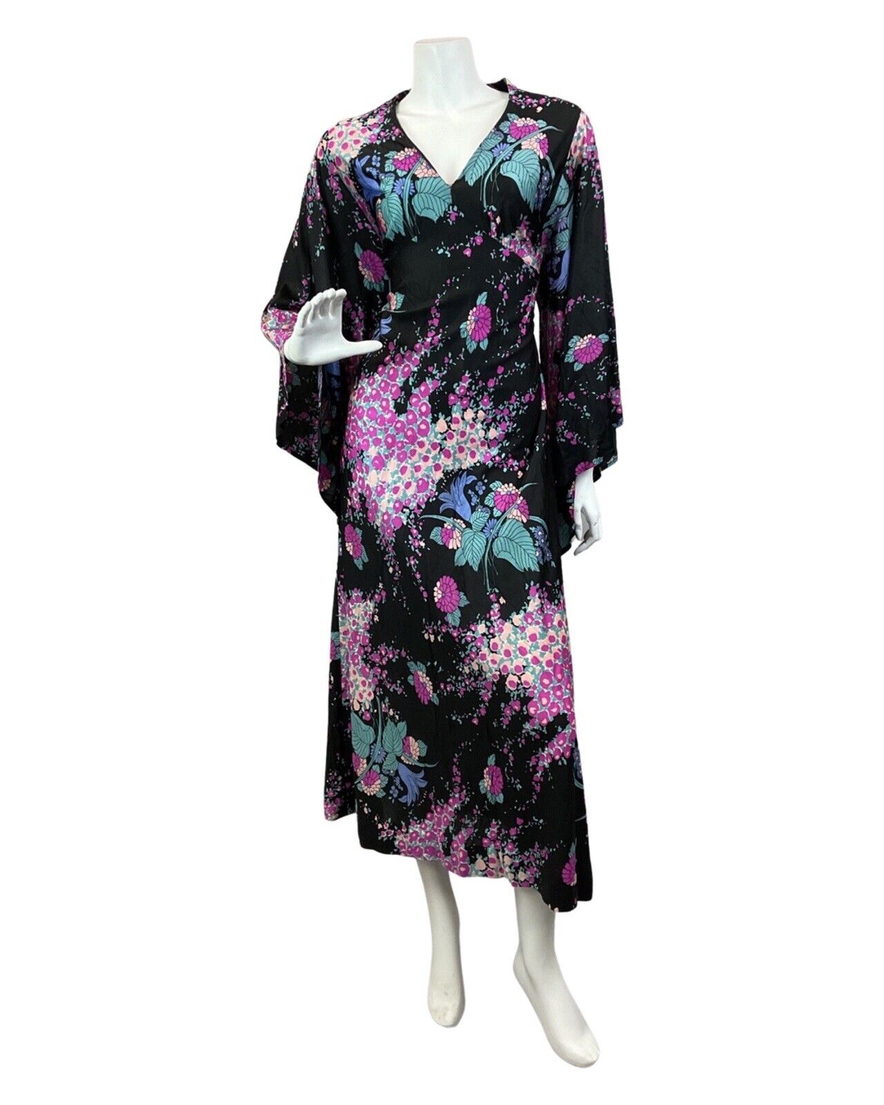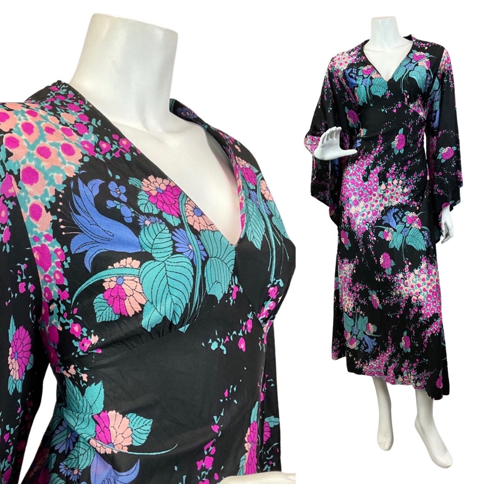 VINTAGE 60s 70s BLACK PINK BLUE FLORAL LEAFY ANGEL SLEEVE MAXI DRESS 12 14