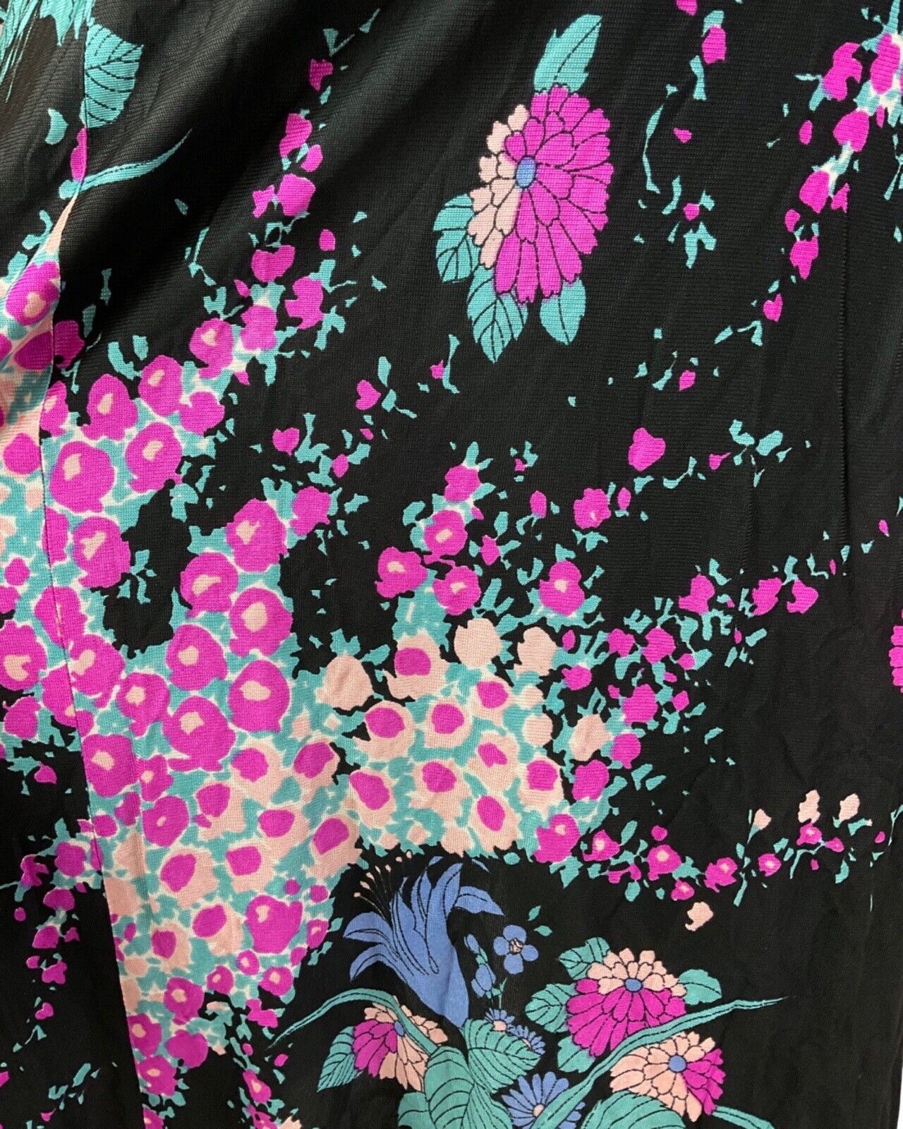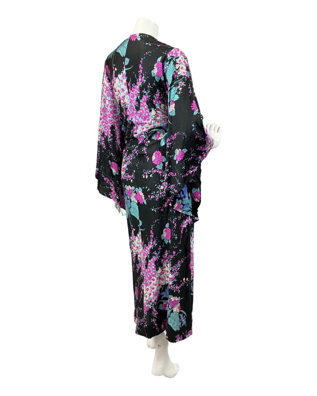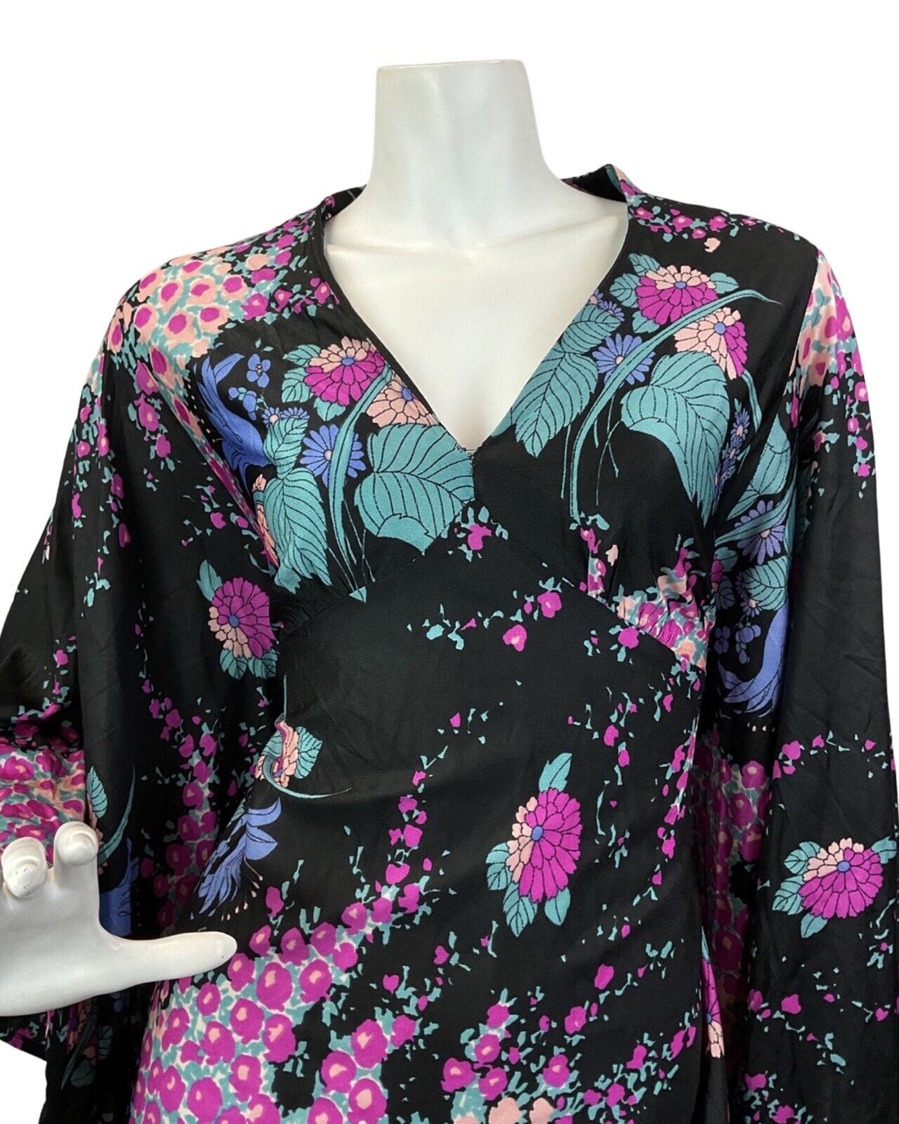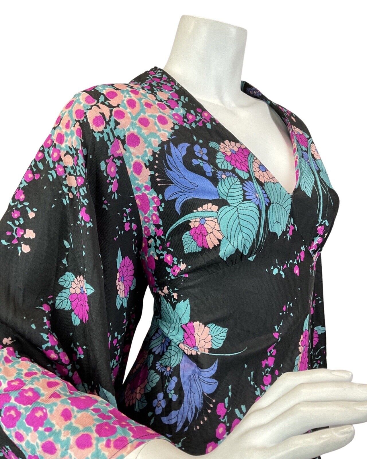 VINTAGE 60s 70s BLACK PINK BLUE FLORAL LEAFY ANGEL SLEEVE MAXI DRESS 12 14