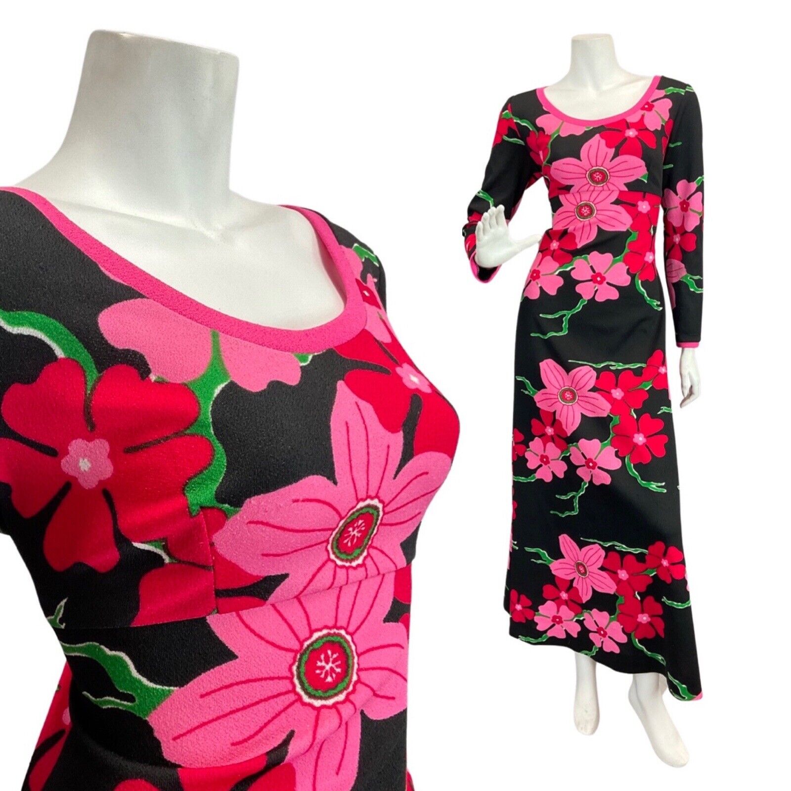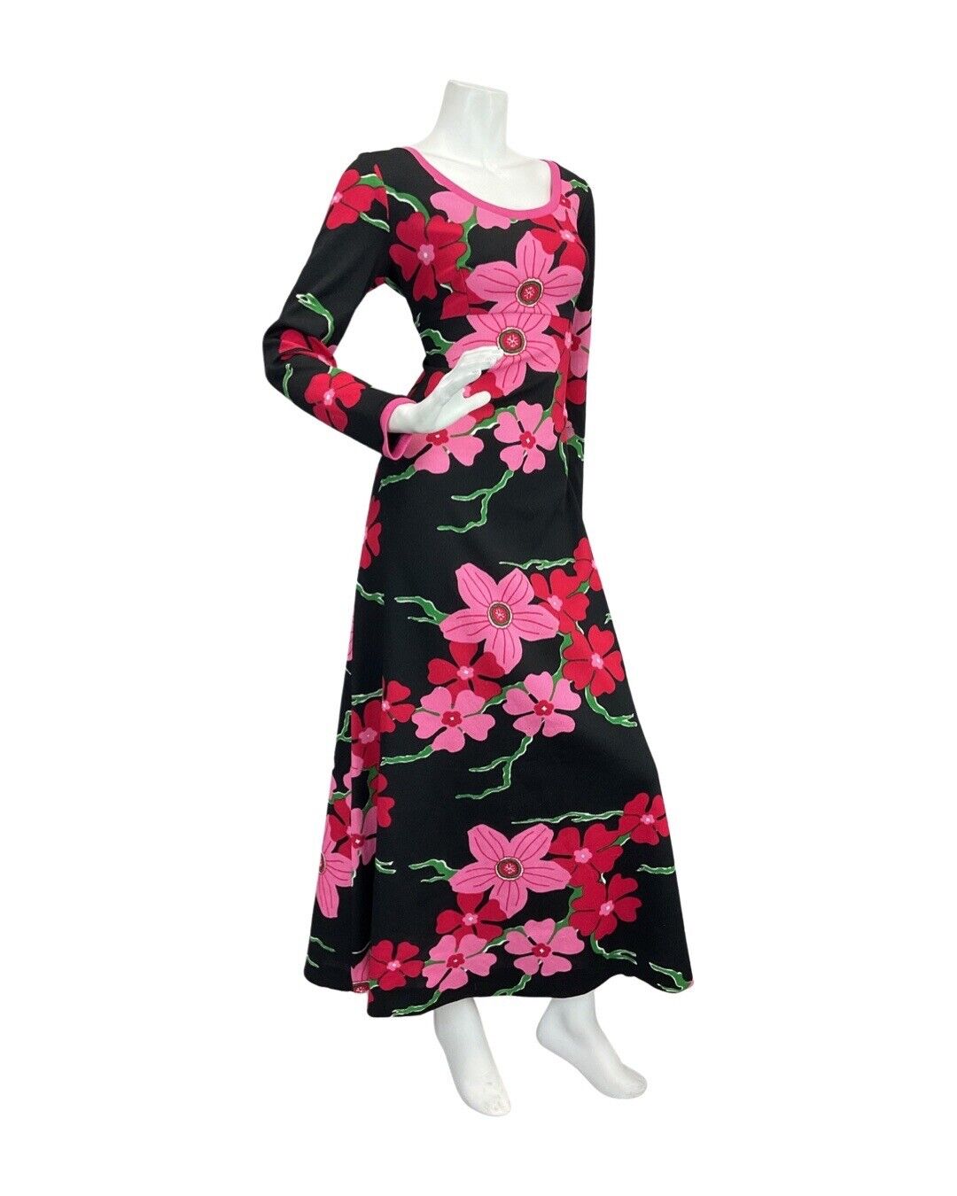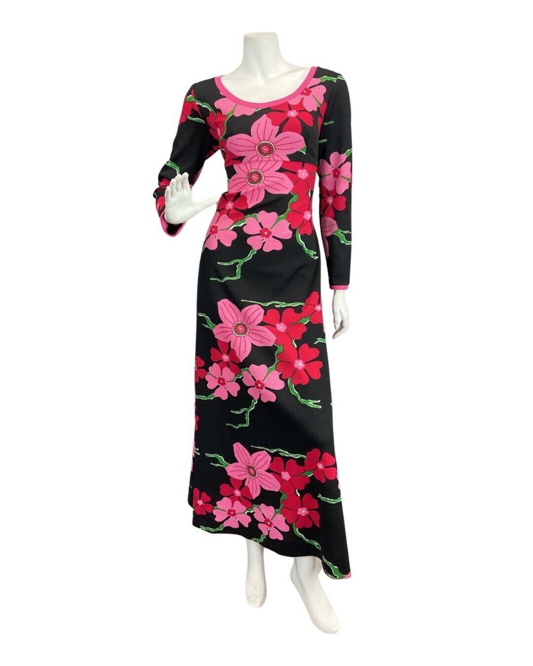 VINTAGE 60s 70s BLACK PINK GREEN FLORAL BLOSSOM MOD ALMEDAHL MAXI DRESS 12