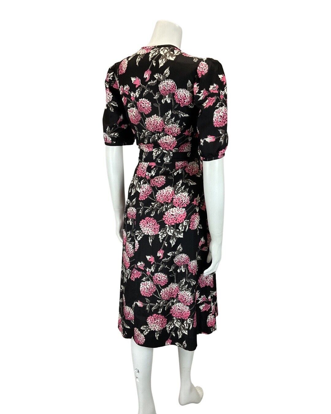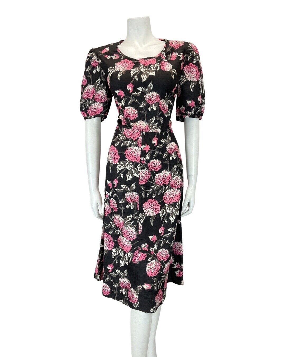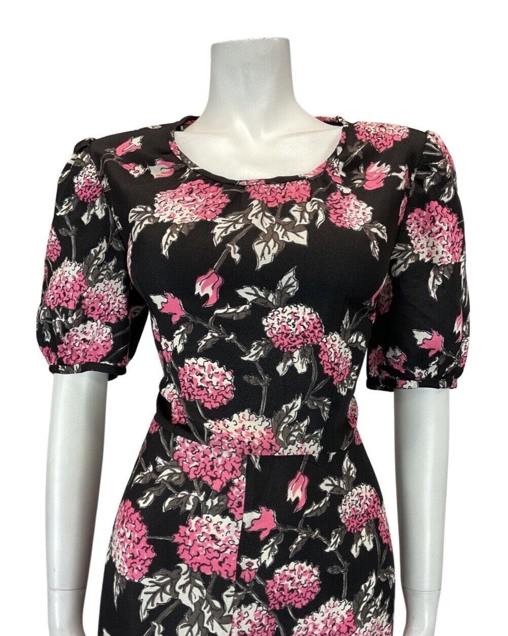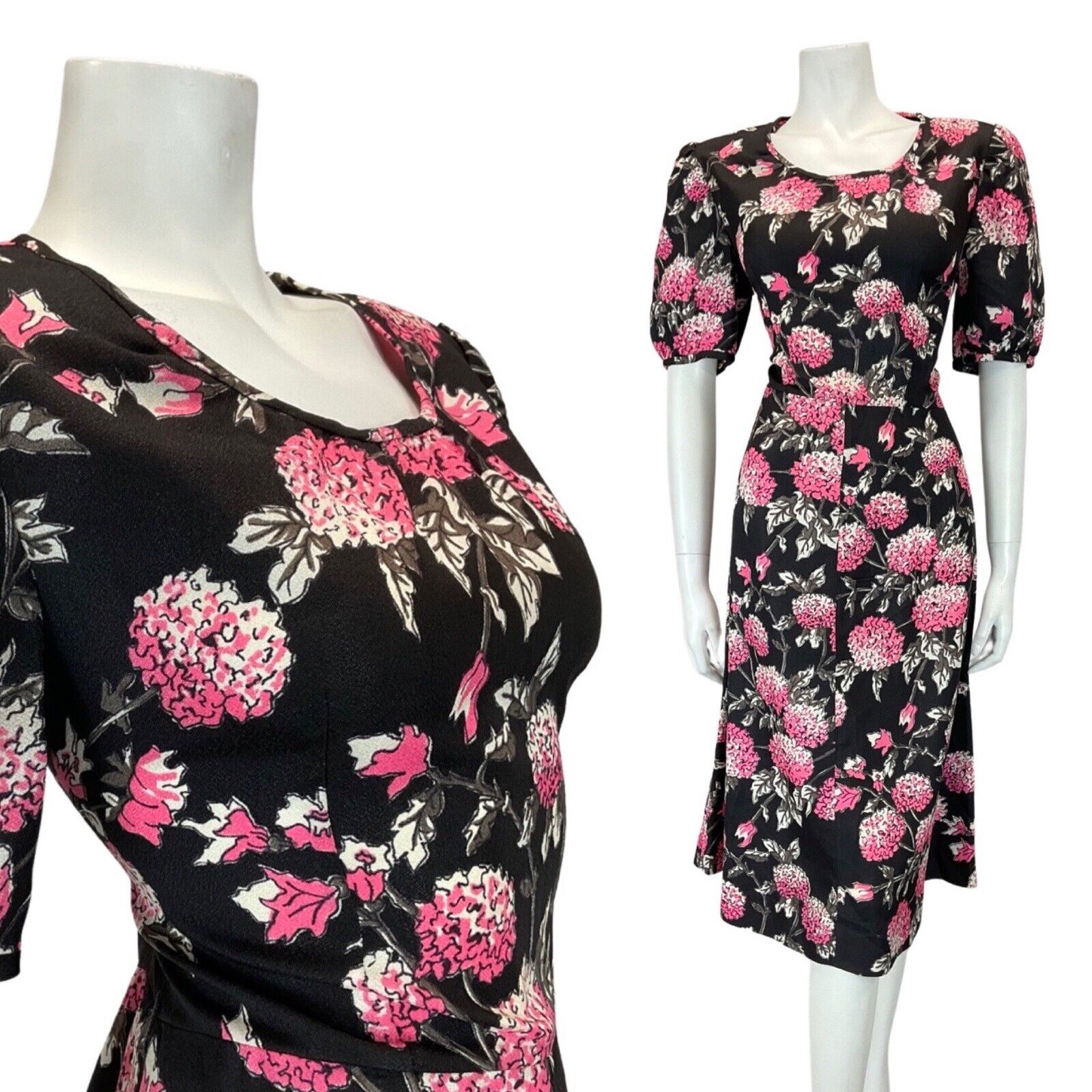 VINTAGE 60s 70s BLACK PINK GREY FLORAL HYDRANGEA MOD KNEE-LENGTH DRESS 12 14