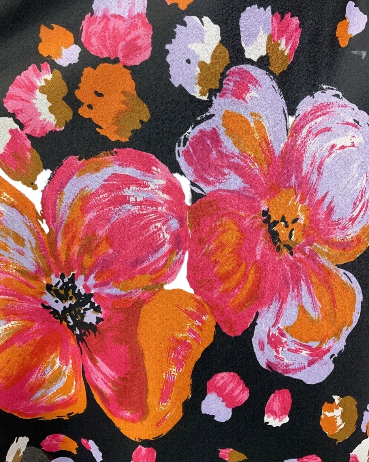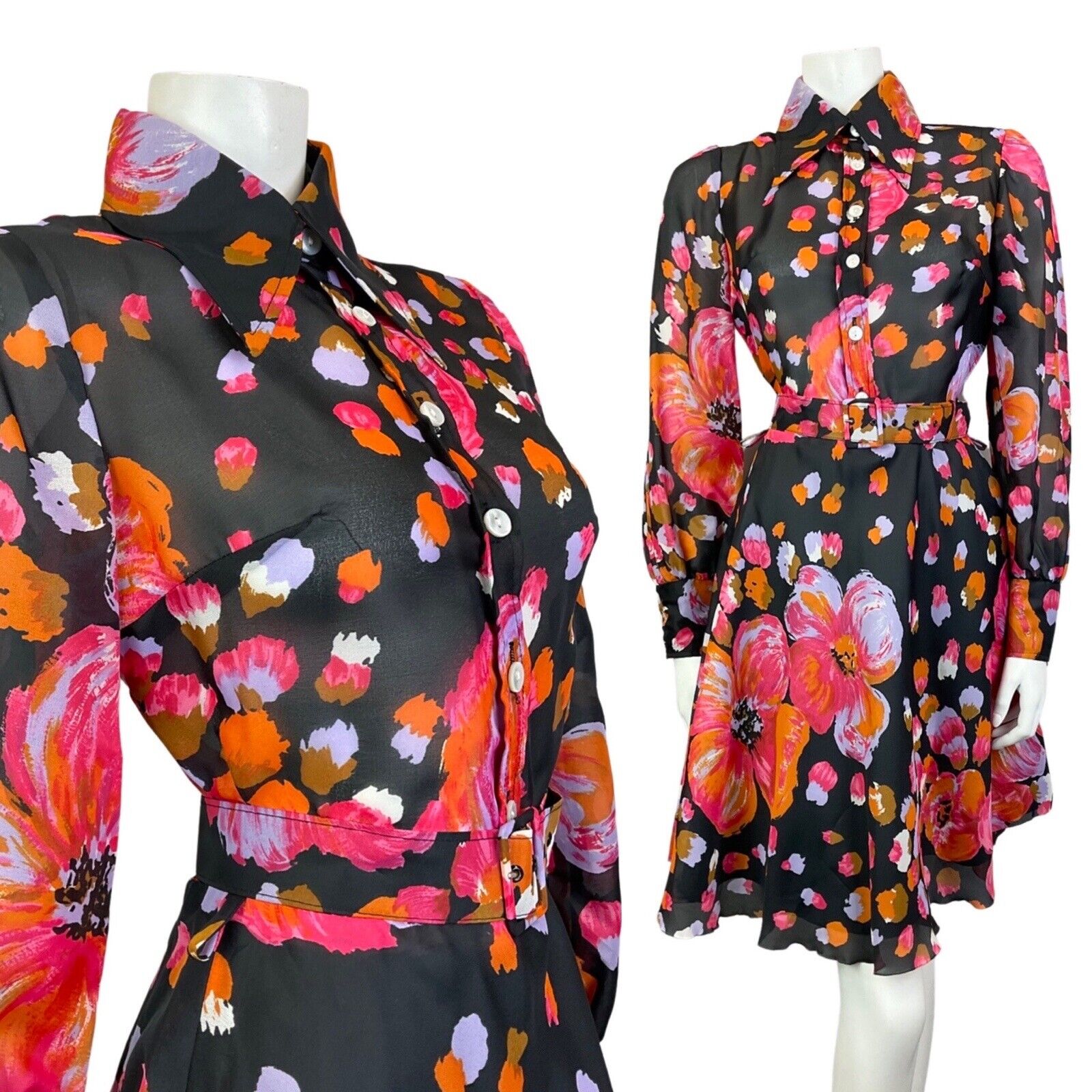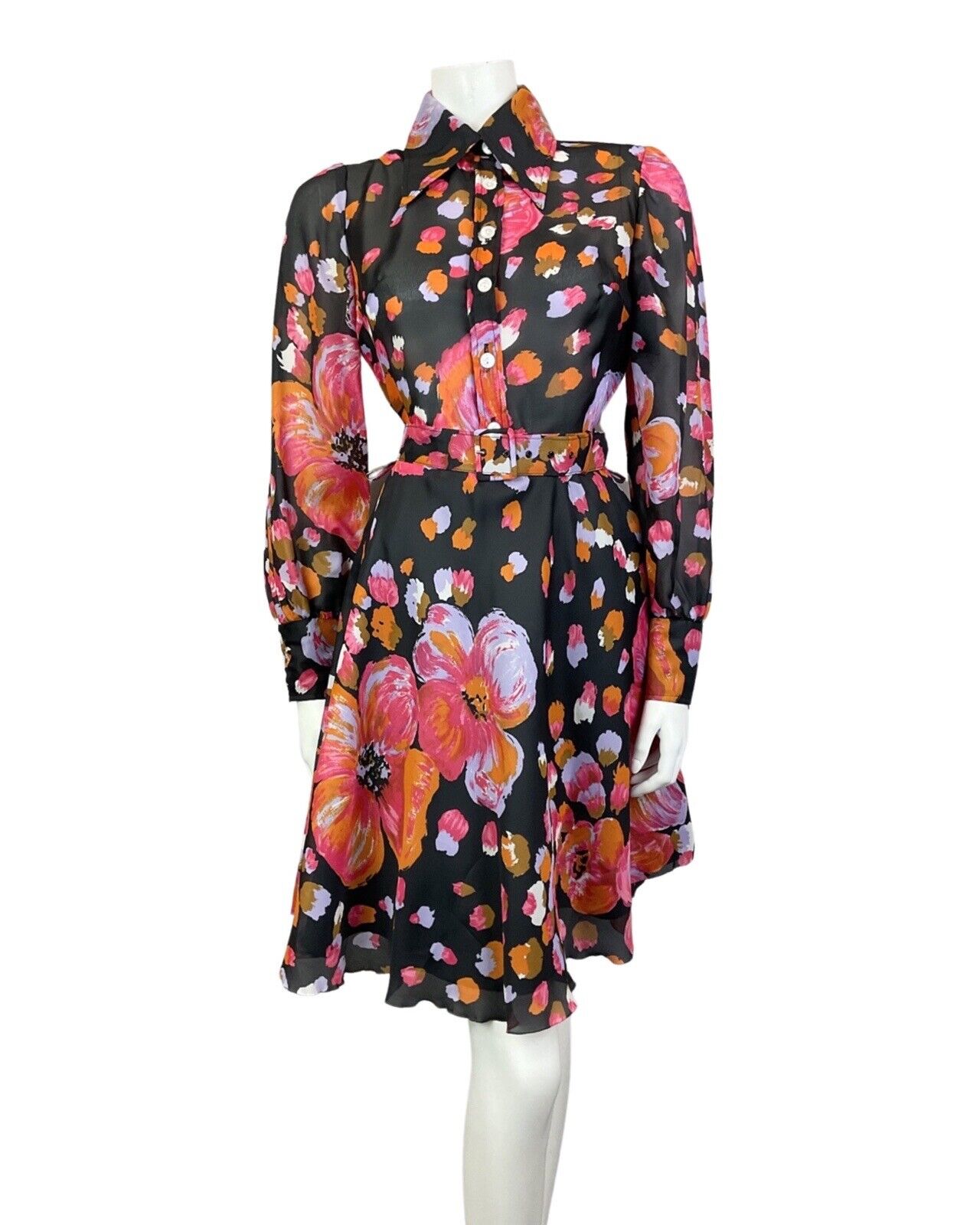 VINTAGE 60s 70s BLACK PINK LILAC FLORAL DAGGER COLLAR SWING SHIRT DRESS 8 10