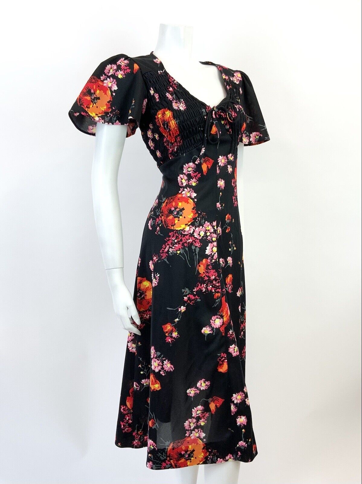 VINTAGE 60s 70s BLACK PINK ORANGE FLORAL BELL SLEEVE SUMMER FLARED DRESS 12 14