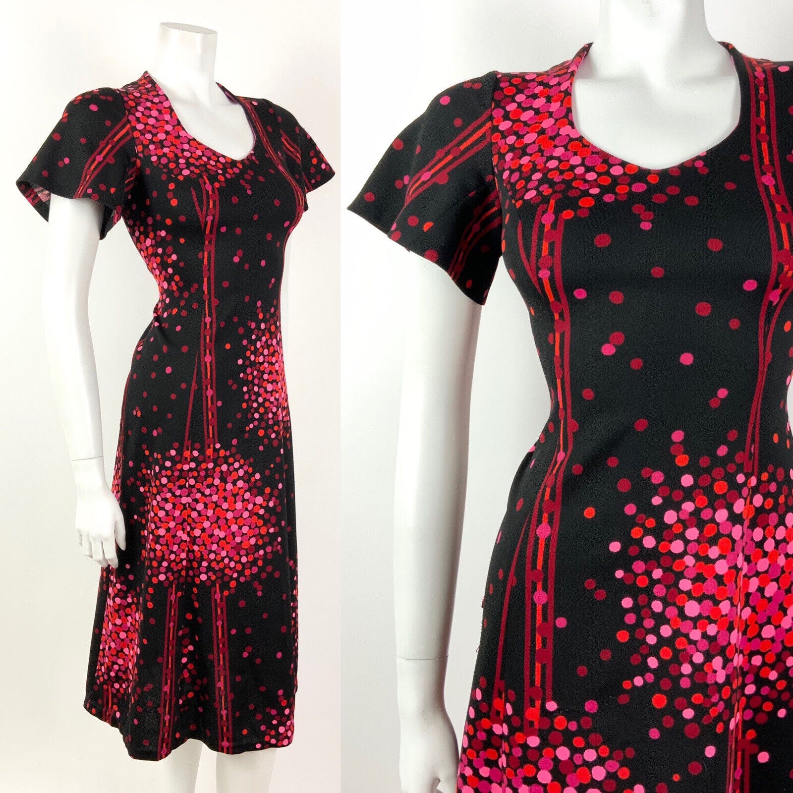 VINTAGE 60s 70s BLACK PINK RED ORANGE DOTTY STRIPE FIT & FLARE DRESS 12 14