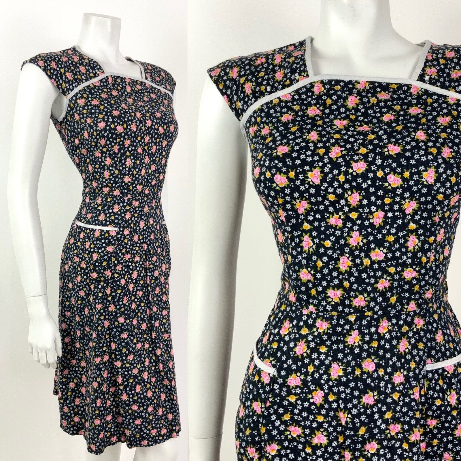 VINTAGE 60s 70s BLACK PINK WHITE DITSY FLORAL PRAIRIE DRESS 10 12