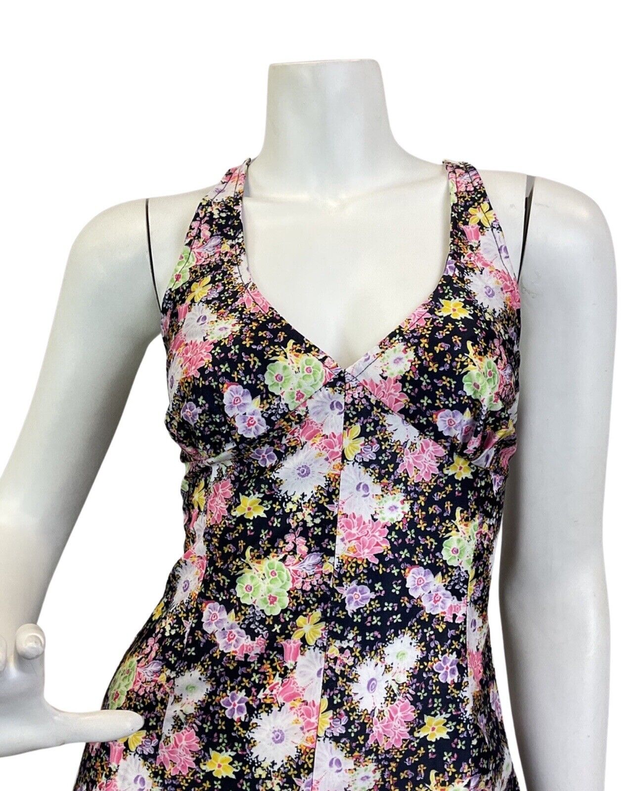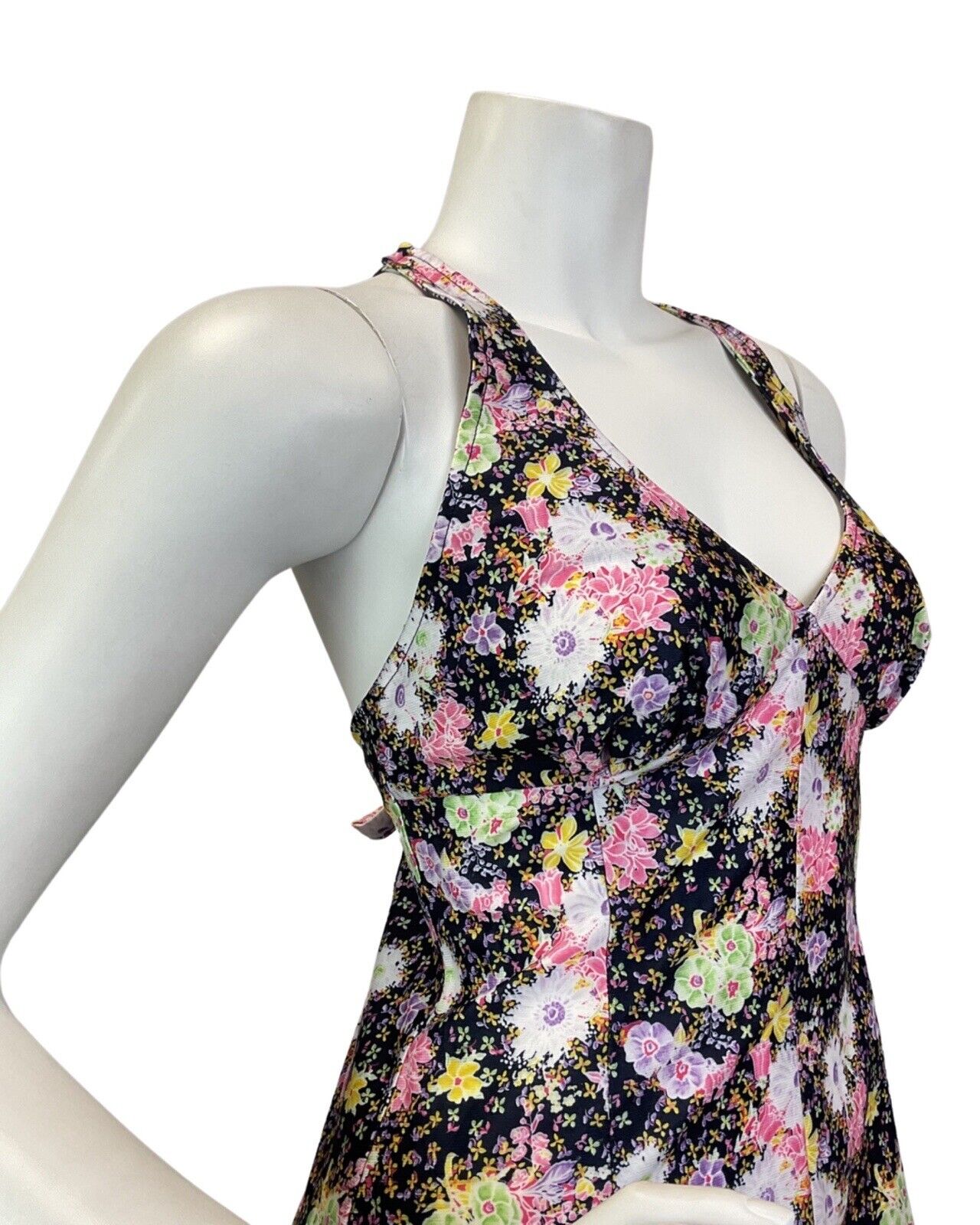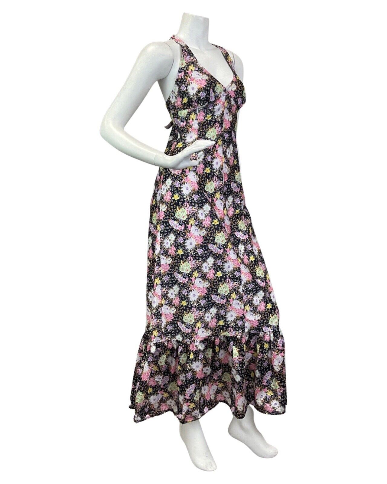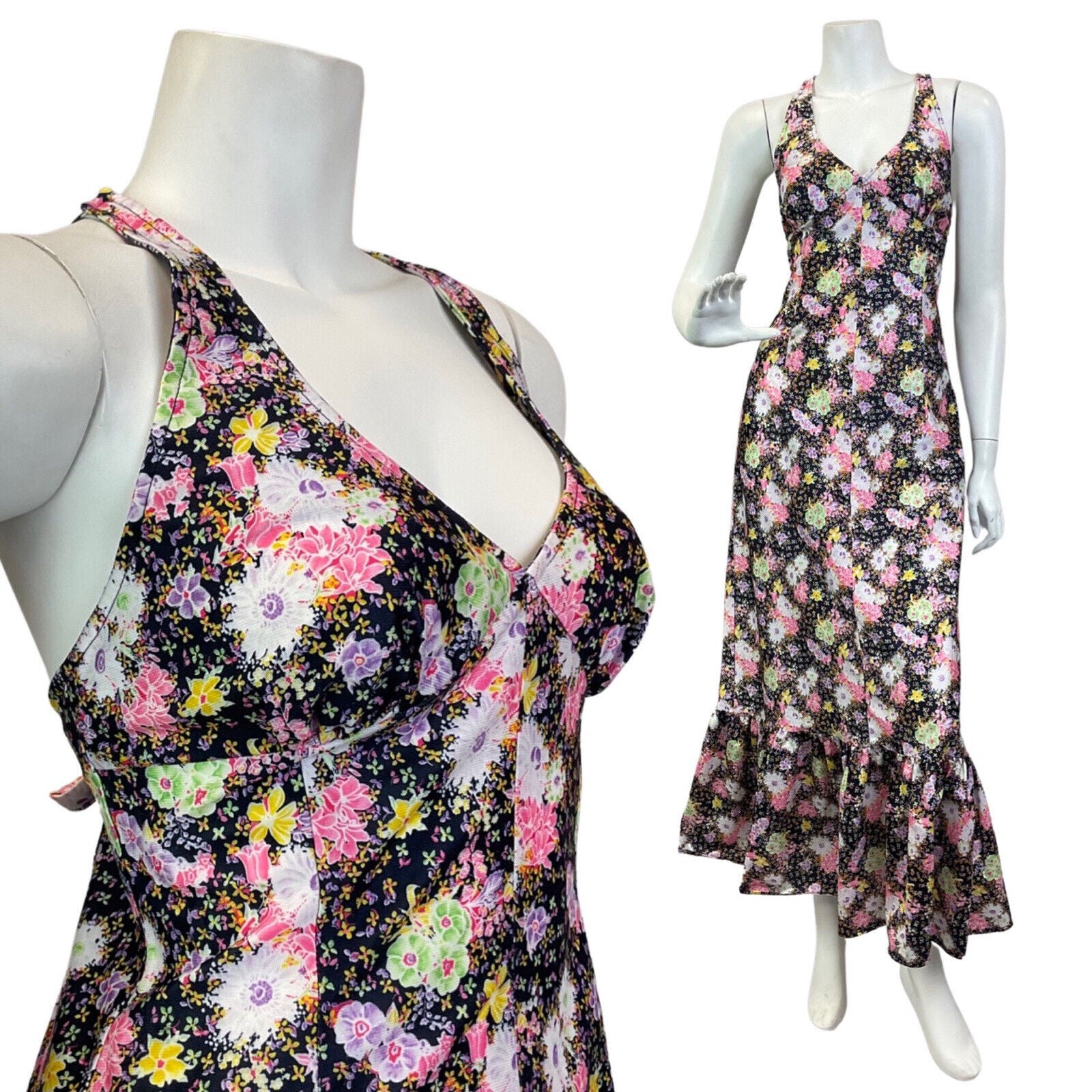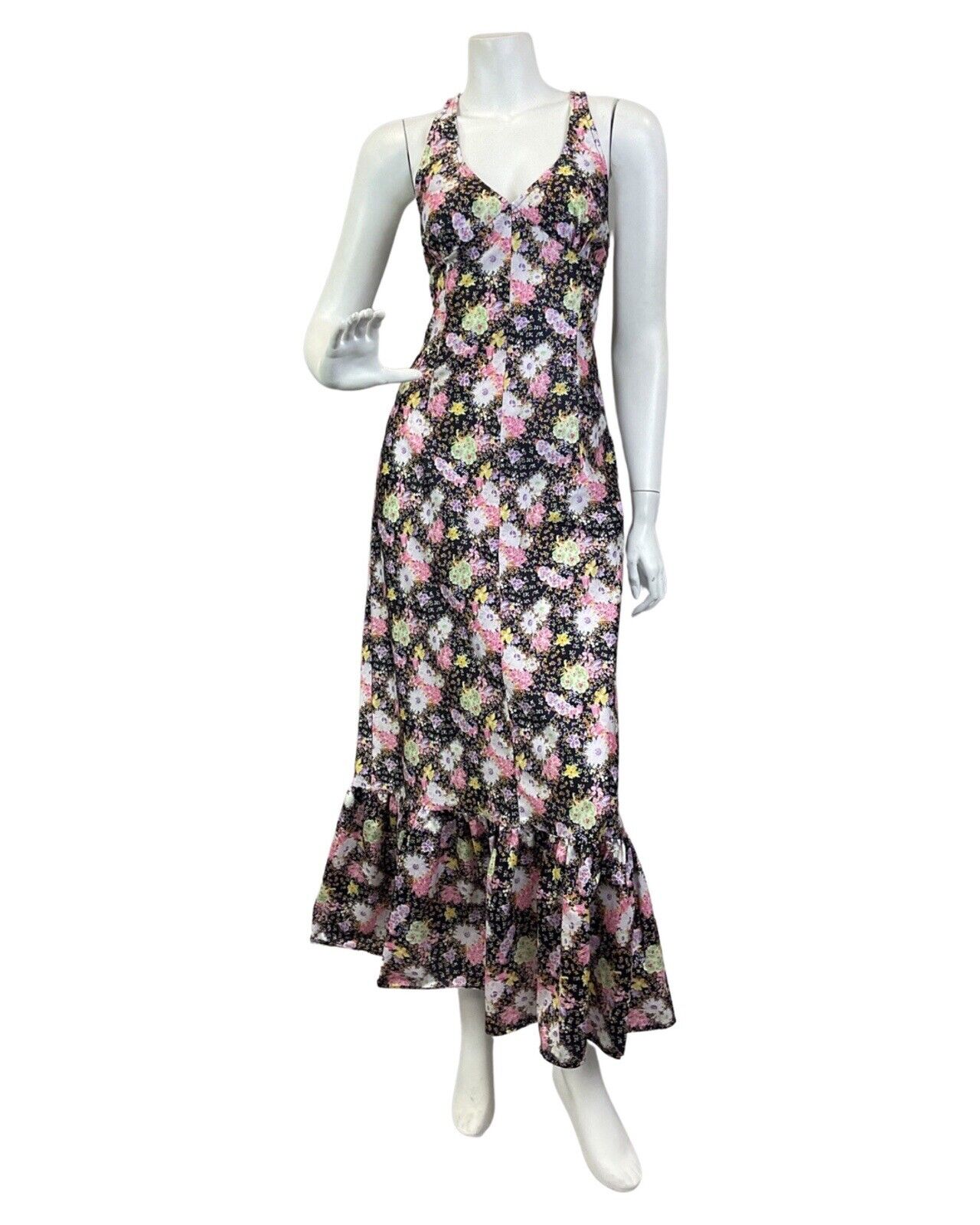 VINTAGE 60s 70s BLACK PINK YELLOW FLORAL DITSY RUFFLED HALTER MAXI DRESS 8 10