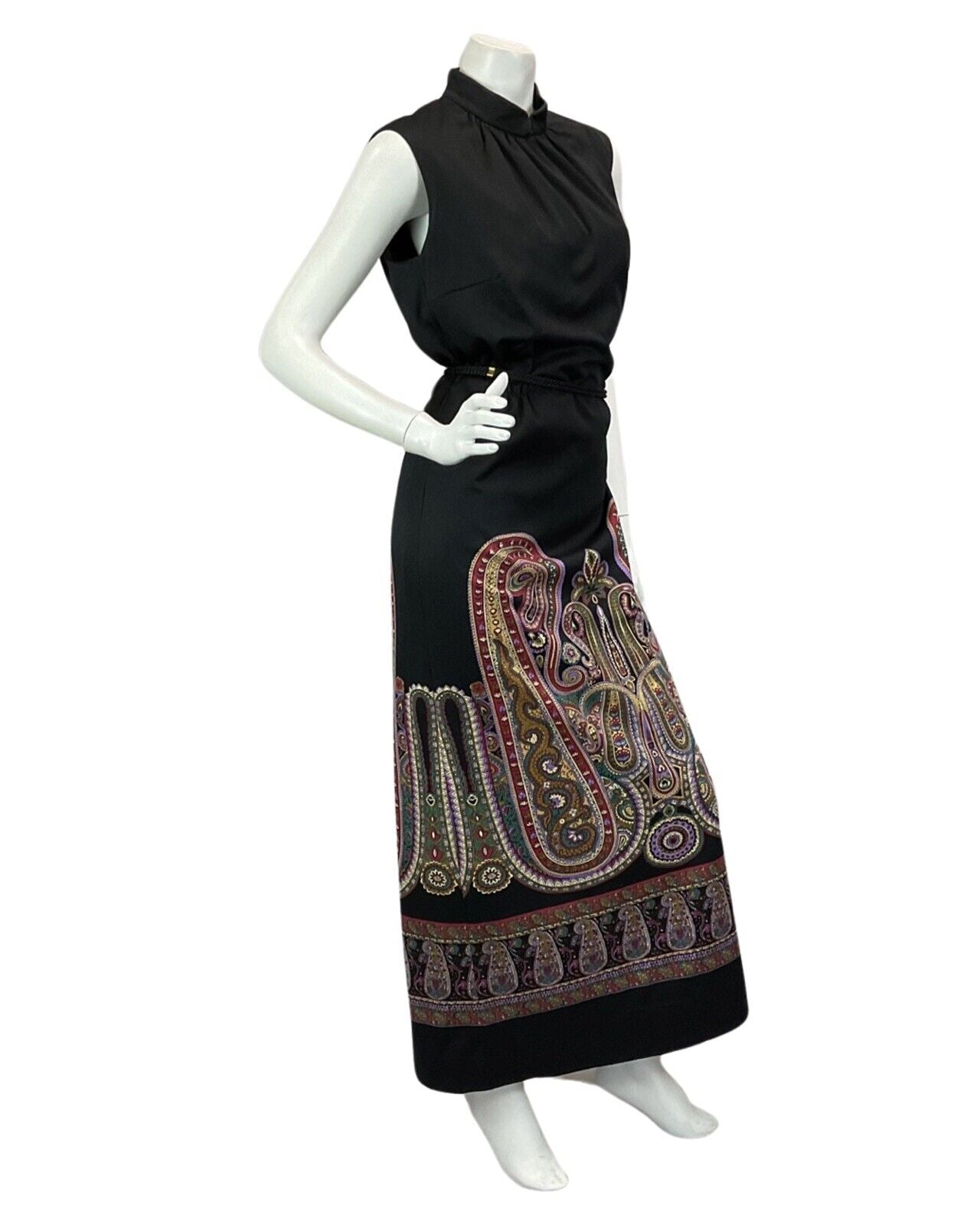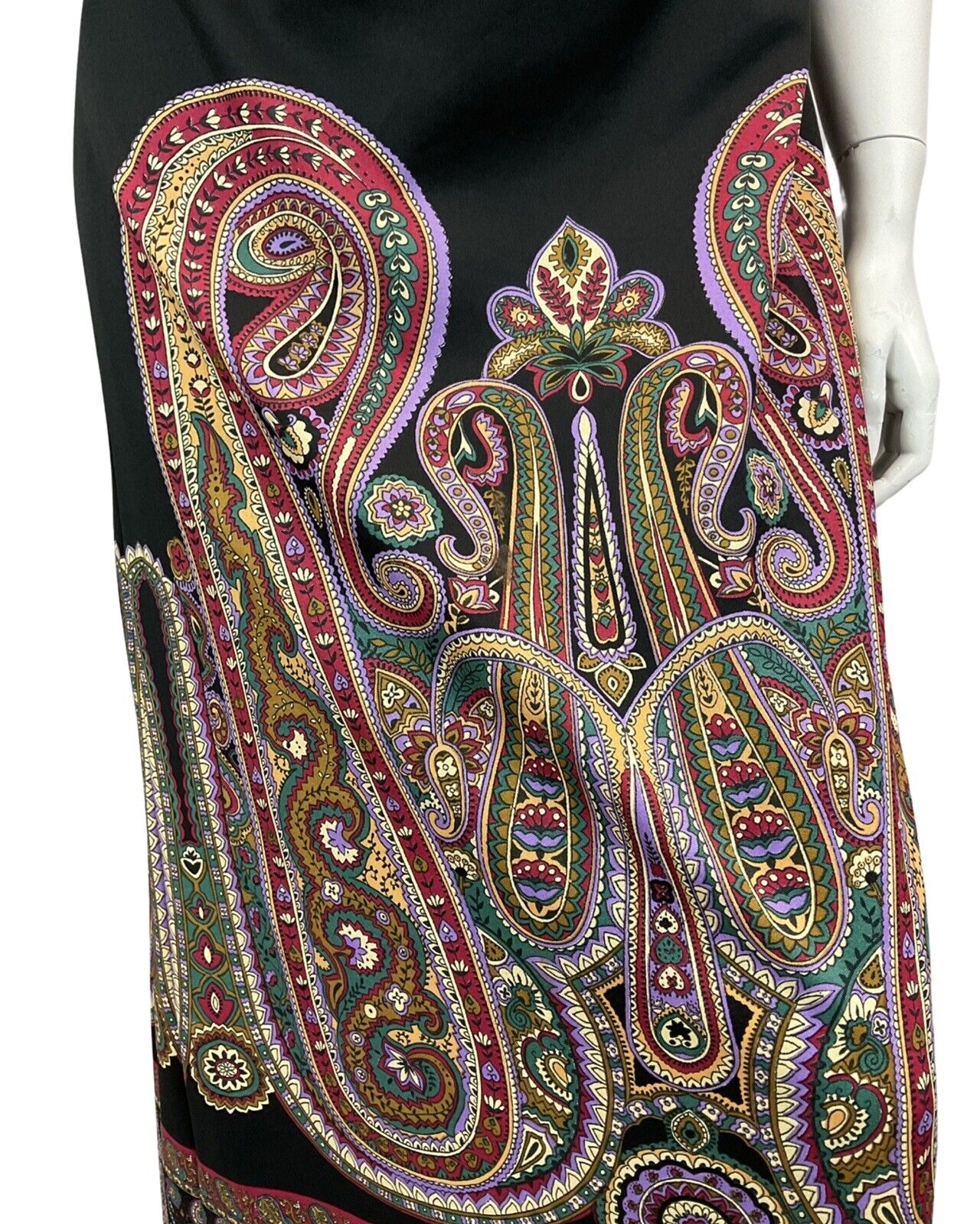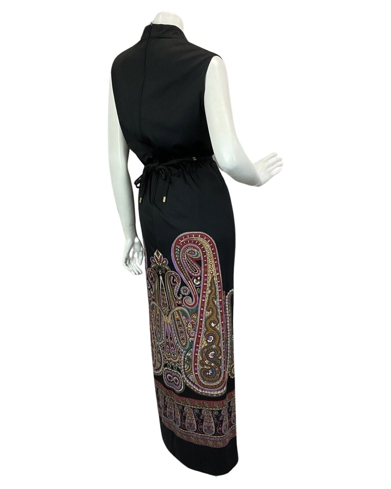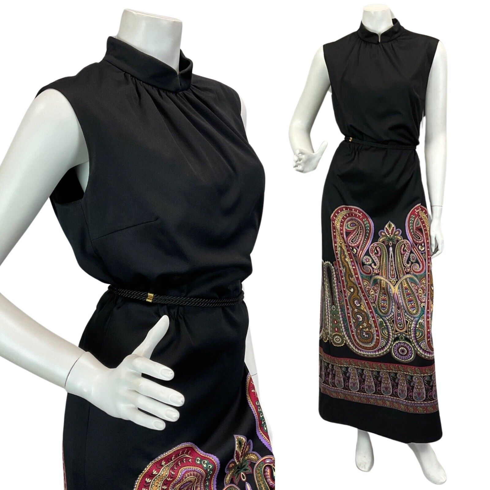 VINTAGE 60s 70s BLACK PURPLE BURGUNDY PAISLEY PRINT BOHO DISCO MAXI DRESS 14 16