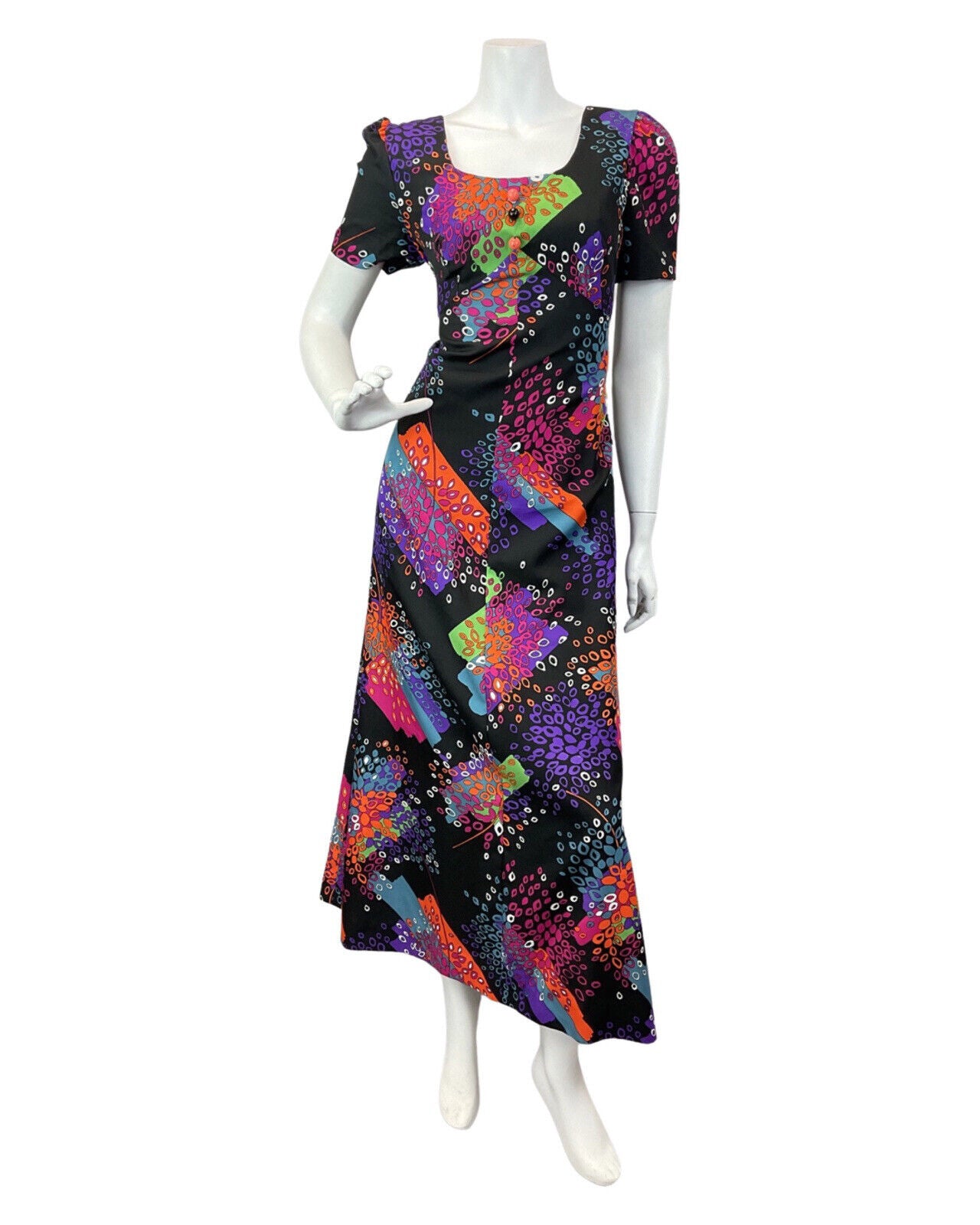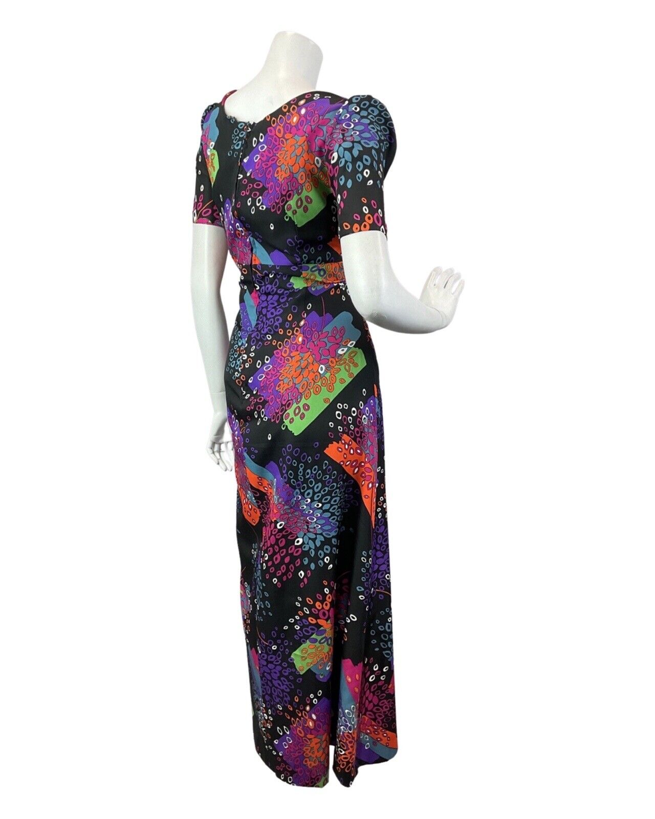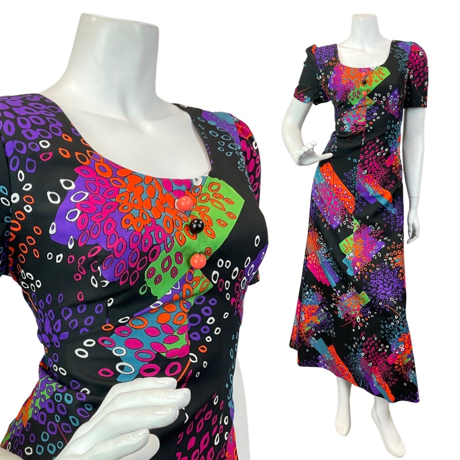 VINTAGE 60s 70s BLACK PURPLE GREEN ABSTRACT LEAFY PSYCHEDELIC MOD MAXI DRESS 12