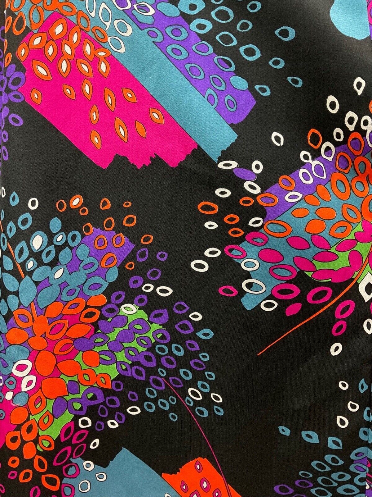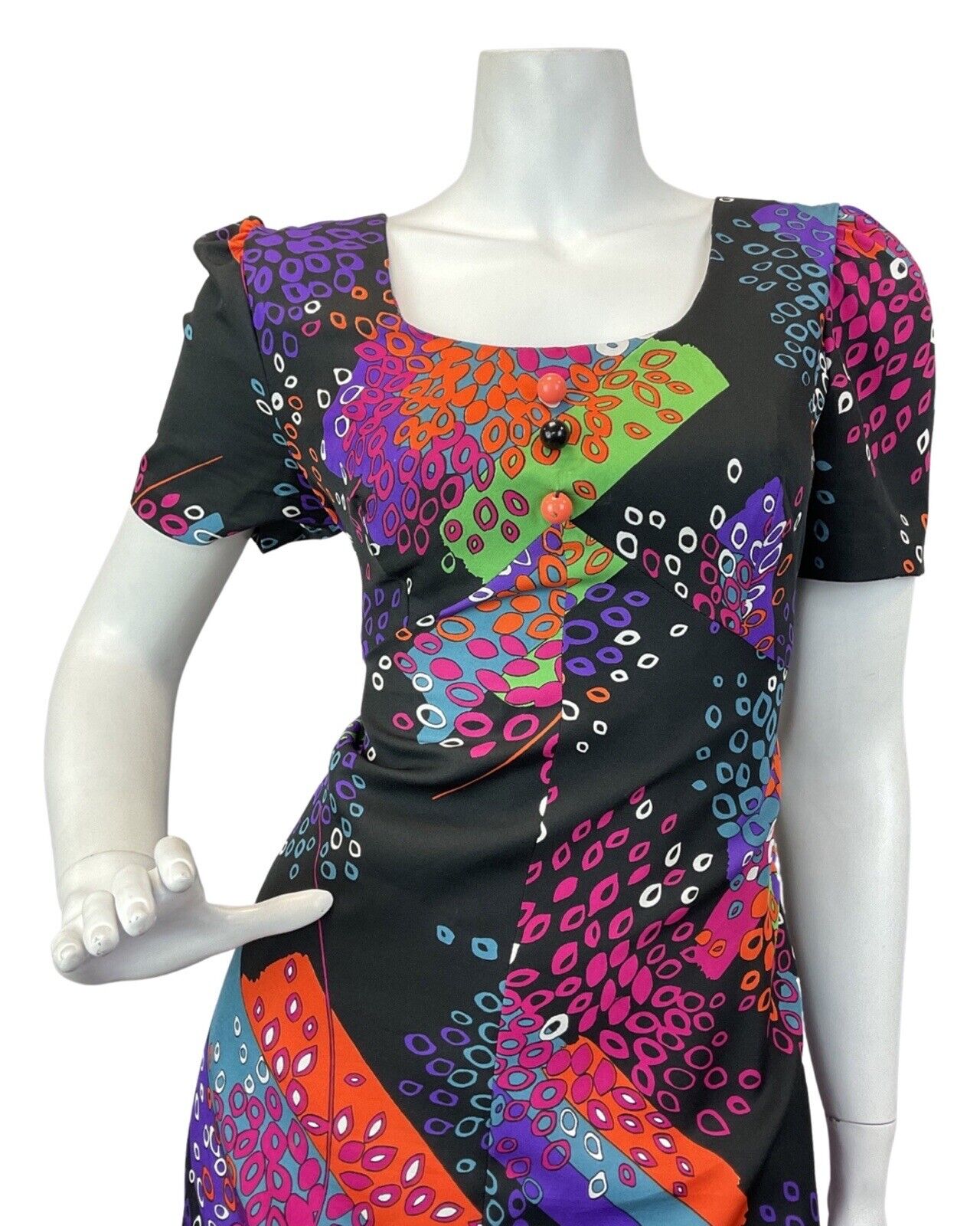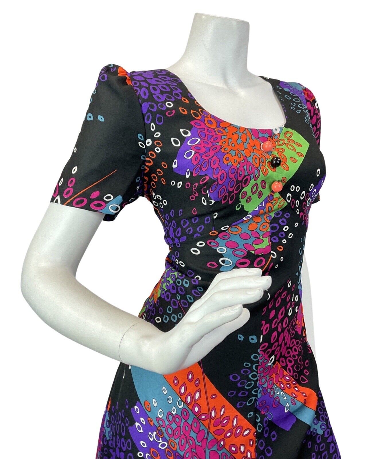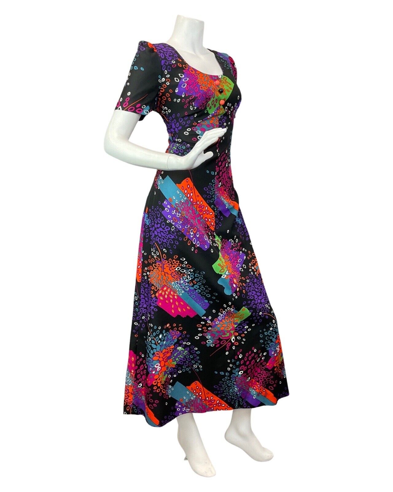 VINTAGE 60s 70s BLACK PURPLE GREEN ABSTRACT LEAFY PSYCHEDELIC MOD MAXI DRESS 12