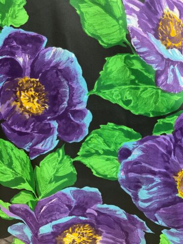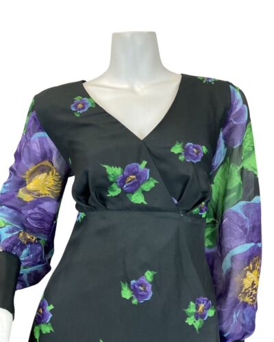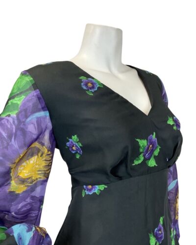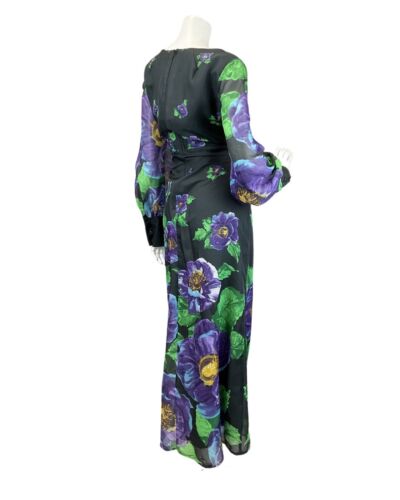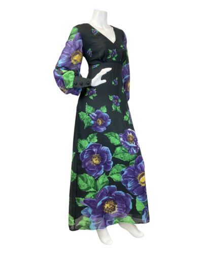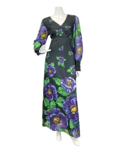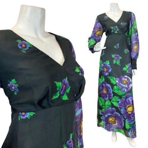VINTAGE 60s 70s BLACK PURPLE GREEN FLORAL LONG-SLEEVE MAXI DRESS 12 14
