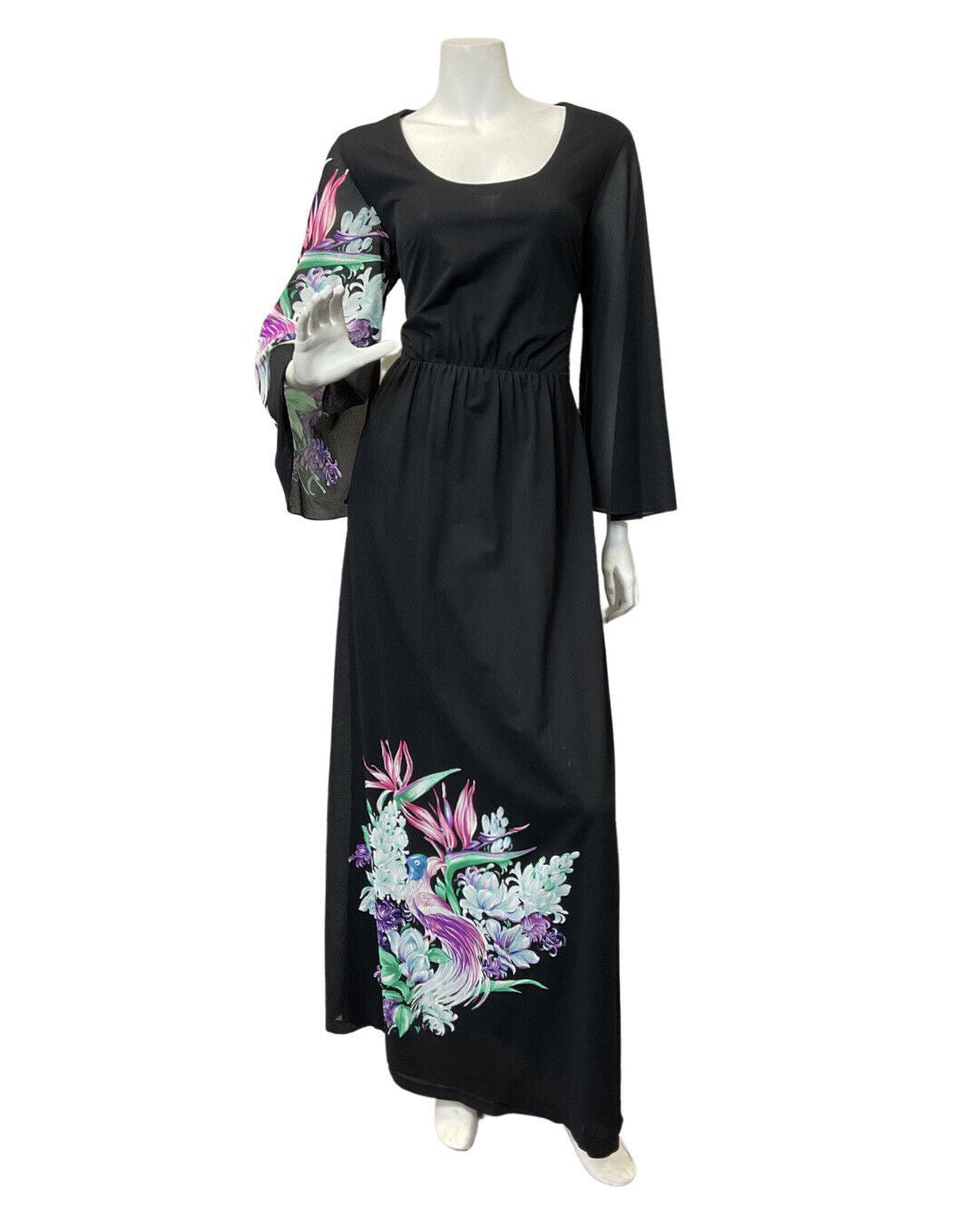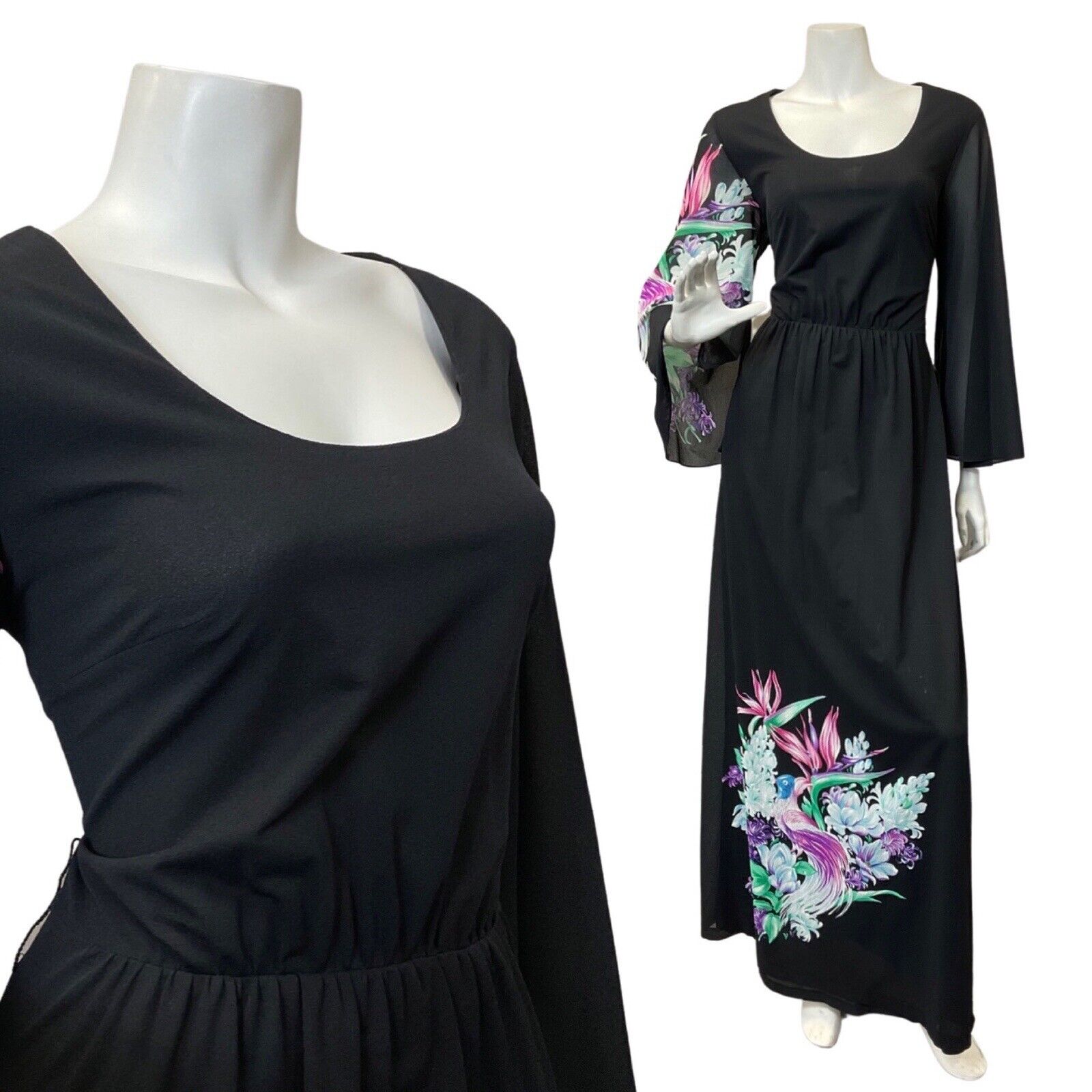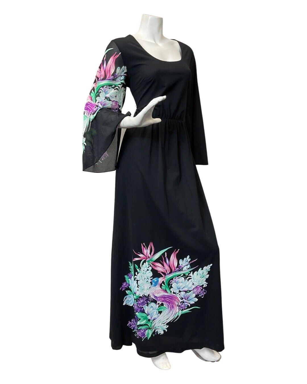 VINTAGE 60s 70s BLACK PURPLE GREEN FLORAL PARADISE BIRD SHEER MAXI DRESS 14